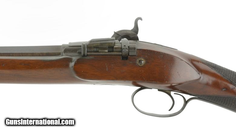 Description: Rare J.R. Coopers Patent Percussion Rifle. .54 caliber breech loading. Breech opens by lifting the lock down lever which rolls the breech block up and to the left. The breech block has a conical shape to the front which when the lock down lever closes the cone moves forward to form a seal in breech of the barrel. Barrel is octagonal and is 26 ½” long. Bore is multi groove and is perfect. Breech block is marked “J.R. Coopers Patent Breech Loading No. 96”. Lock is marked J.R. Cooper. Barrel has 90-95% Damascus pattern. Stock is excellent with fancy figure and excellent checkering. Barrel has a 3 leaf folding sight. Stock forend cap is ebony. Gun is in excellent condition. SOLD Antique: Yes |
