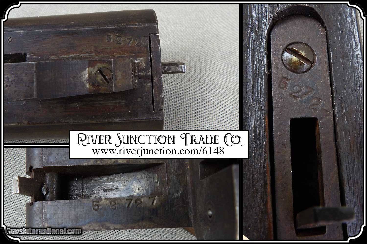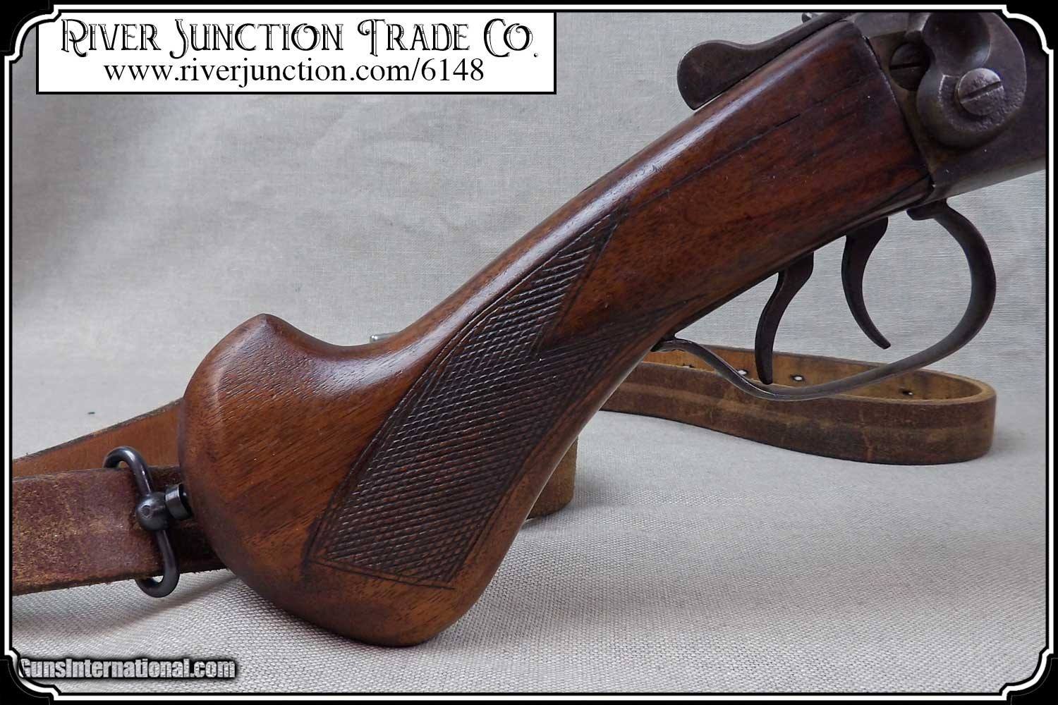 Description: Black Bart's HOLDUP SHOTGUN. I can just imagine Black Bart standing at the top of a steep grade waiting for the stagecoach between Deaddog and Gila. As the coach reaches the crest of the hill he orders ”Throw down the box”. Or maybe the bartender in the Longbranch using this to tame drunken cowhands. The bartender in frontier saloons was like the captain of a ship he has the power set the rules of the saloon and the responsibility to enforces them. All Old bar dogs liked, these cut down shotguns for their quick action in tight quarters and were most often used as a club rather than a firearm. Both uses would provide equal devastation. Others liked them for their ability to be easily hid under a coat. I must admit this piece does appeal to the scoundrels of the day. Yes, it is legal to own. As a shotgun it has an 18inch barrel length restriction and that is what this one is. Perfect for a re-enactor. "OR" You could hang it in your old time saloon or Old West room. It is sure to be a great conversation starter. Looks like the one under the Faro table in the movie Tombstone. The locks both work perfectly. The stock has been cut down with a swivel and a old leather strap to hang across your body added. The overall length of this 12 gauge is a compact 27 inches. This is an ANTIQUE and can be shipped directly to you. Adult signature required. Sold as an Antique ~ no guarantees, warranties, or liabilities for any actual usage. Payment: Item, can be ordered on line with a credit card or paypal on our sight. Just Google (riverjunction) and type in the River Junction Trade Co. item number (6148) in the search box. Before you checkout you will see shipping cost and total. OR If you prefer: Pay by cash, postal money order, cashiers check, personal & business checks. We wait for checks to clear. We always answer questions and entertain offers. Have questions? Call me 563-880-4588. Jim SOLD |