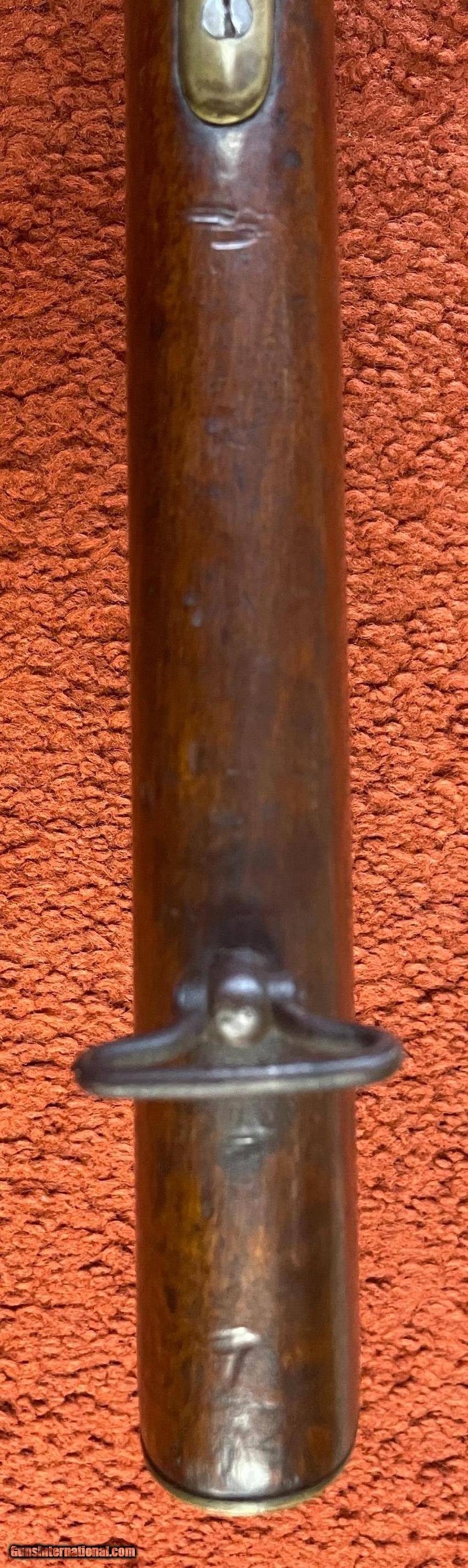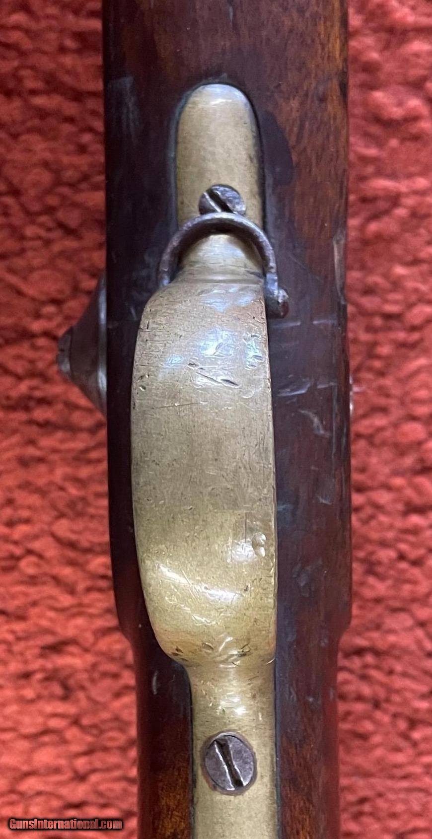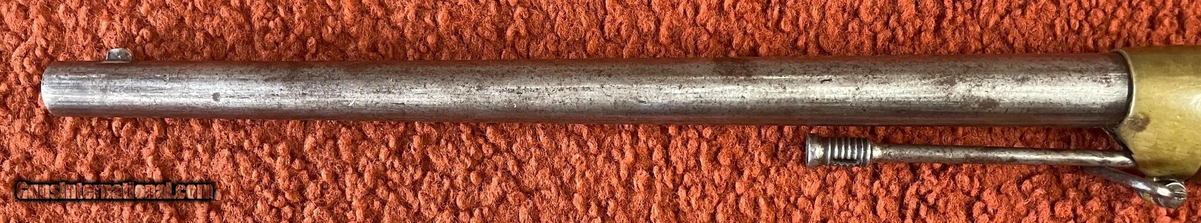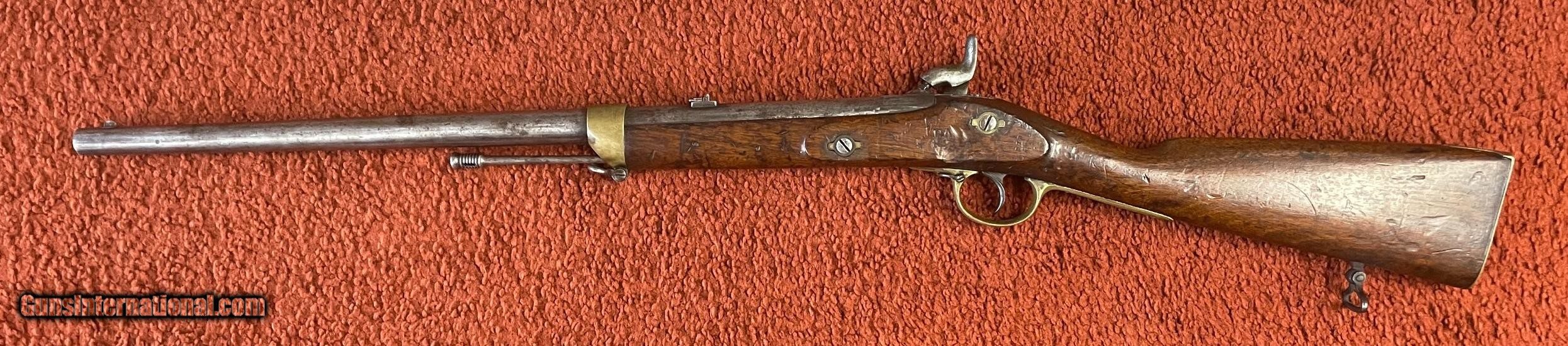 Description: The bore measures .58" with good rifling and scattered corrosion. The action is strong and crisp. The triggerguard has a lanyard ring at the front. See photos for condition. SOLD Antique: Yes Model: Percussion Carbine Barrel Length: 24 |