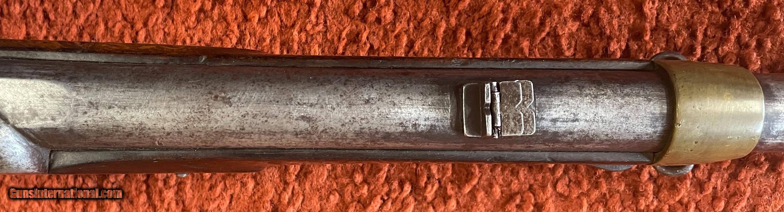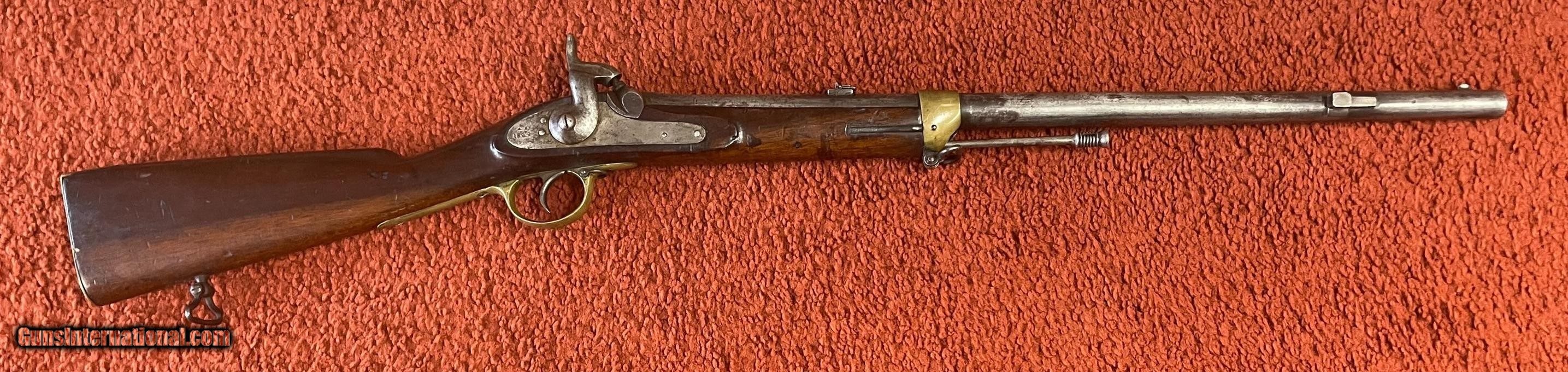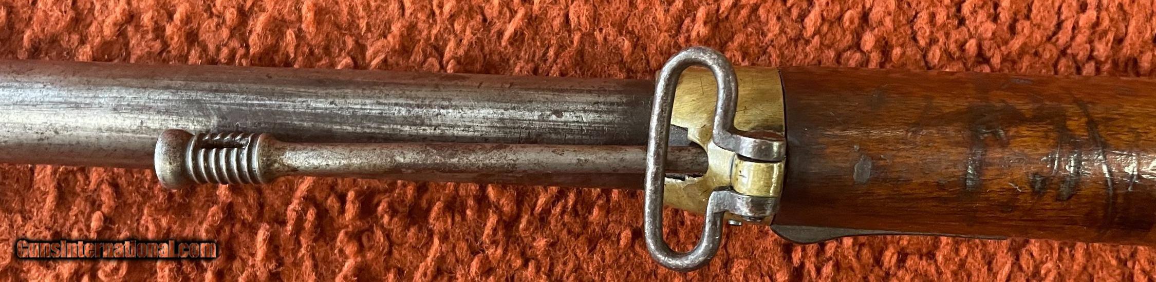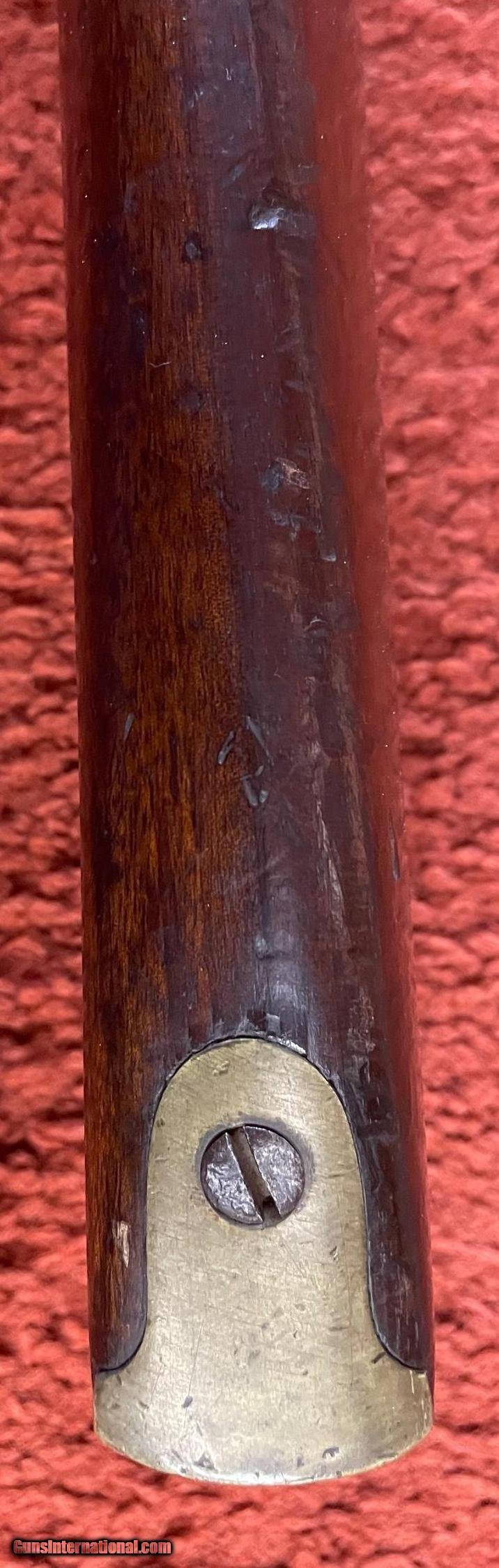 Description: The bore measures .58" with good rifling and scattered corrosion. The action is strong and crisp. The triggerguard has a lanyard ring at the front. See photos for condition. SOLD Antique: Yes Model: Percussion Carbine Barrel Length: 24 |