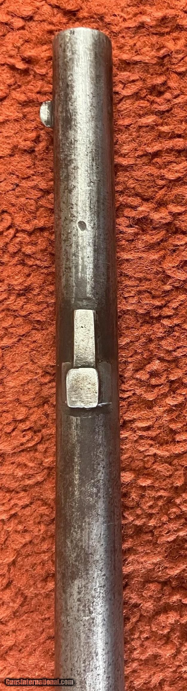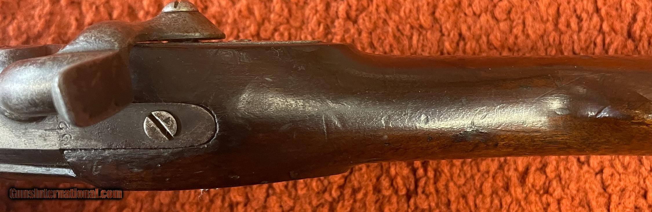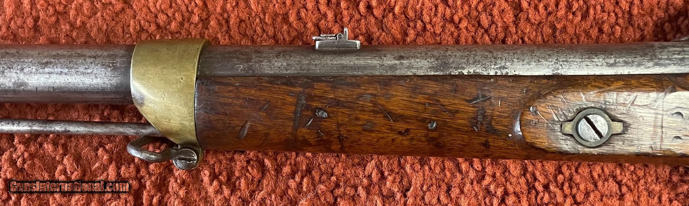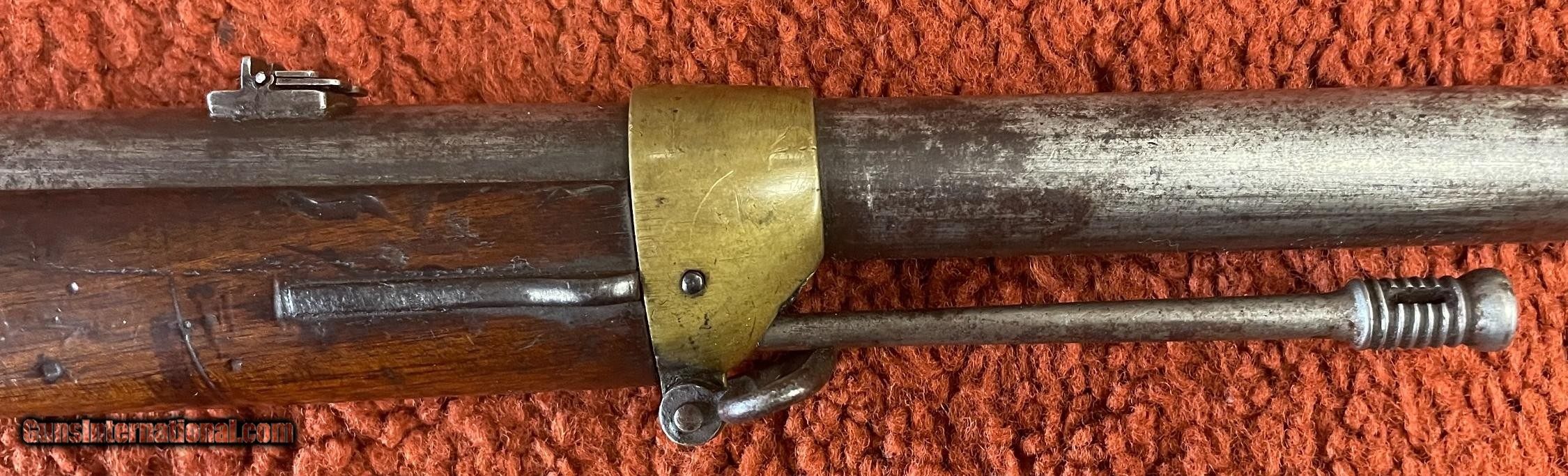 Description: The bore measures .58" with good rifling and scattered corrosion. The action is strong and crisp. The triggerguard has a lanyard ring at the front. See photos for condition. SOLD Antique: Yes Model: Percussion Carbine Barrel Length: 24 |