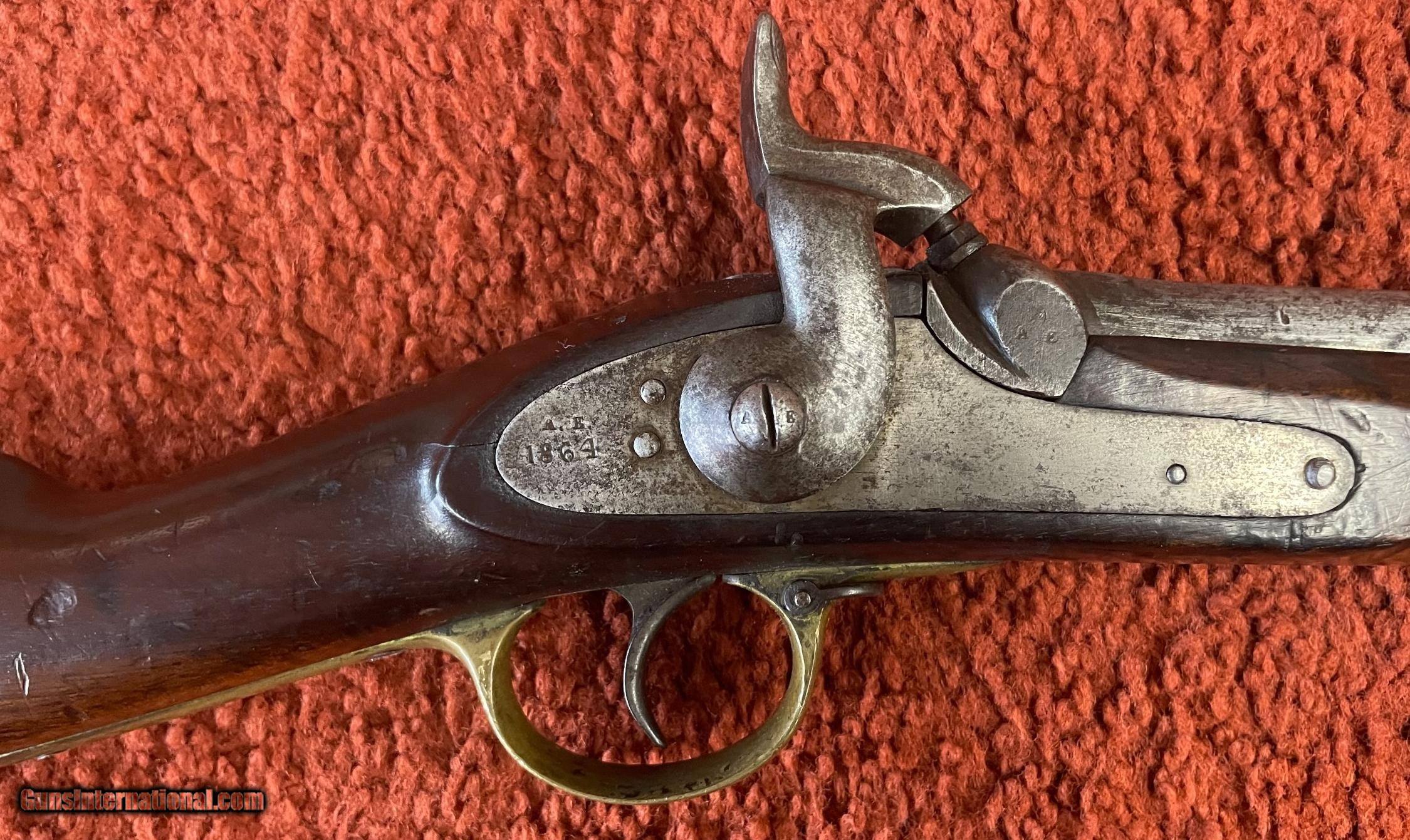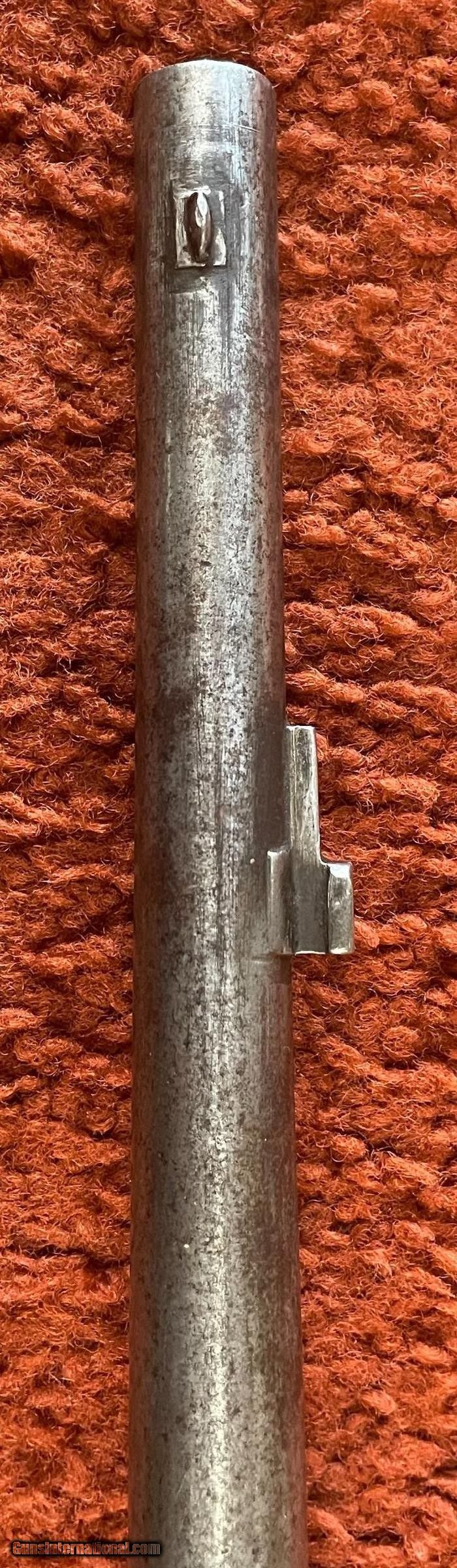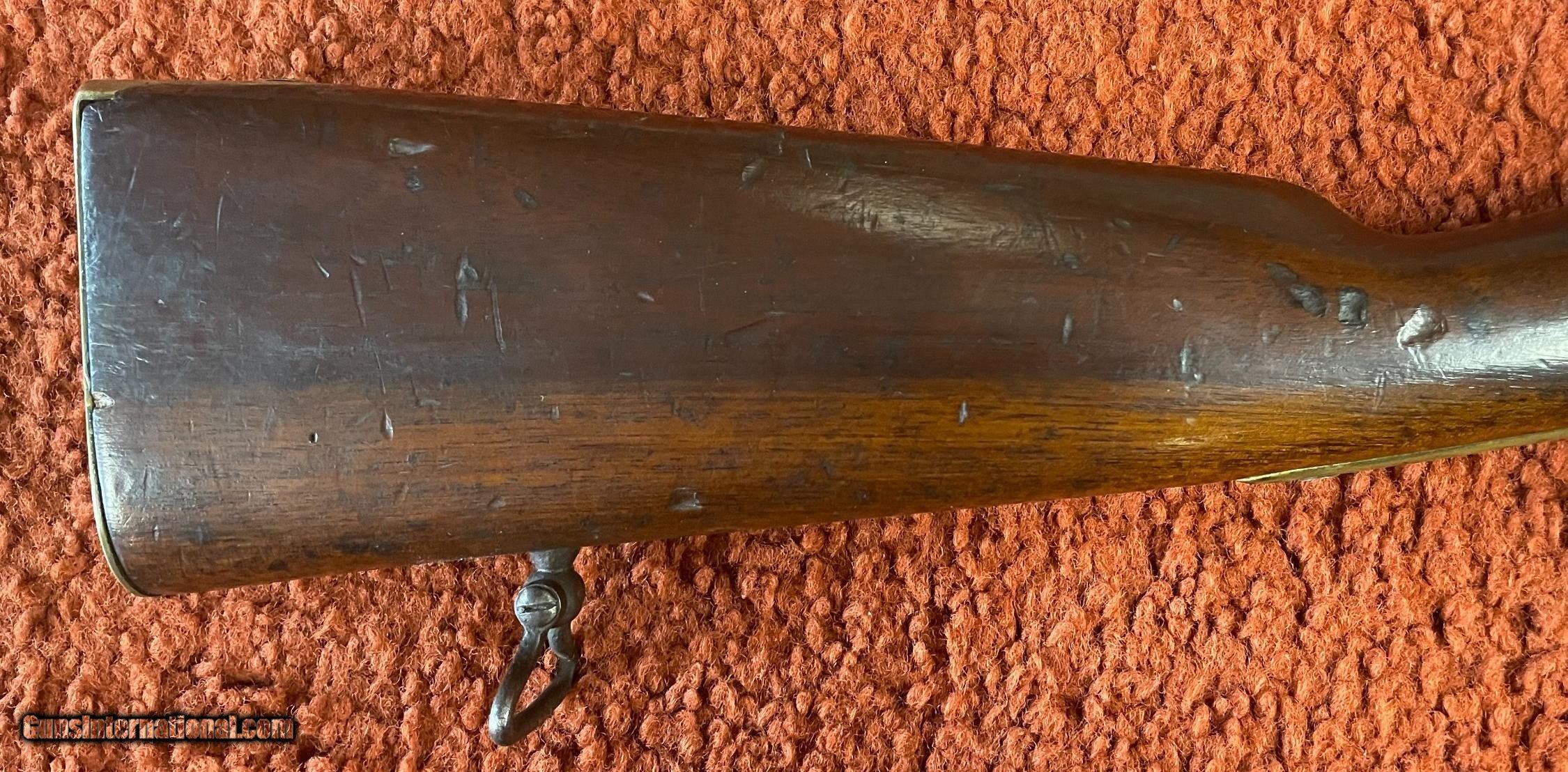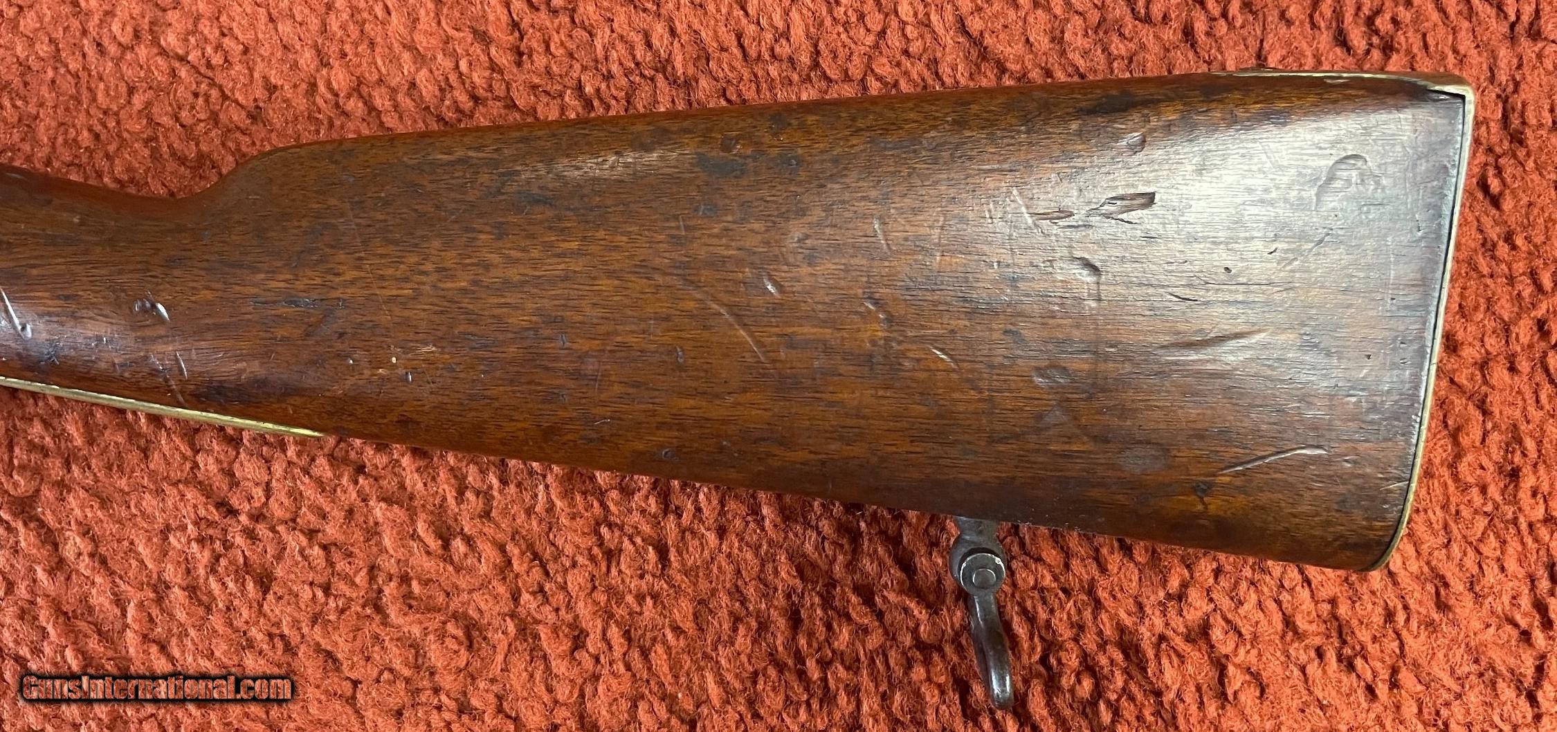 Description: The bore measures .58" with good rifling and scattered corrosion. The action is strong and crisp. The triggerguard has a lanyard ring at the front. See photos for condition. SOLD Antique: Yes Model: Percussion Carbine Barrel Length: 24 |