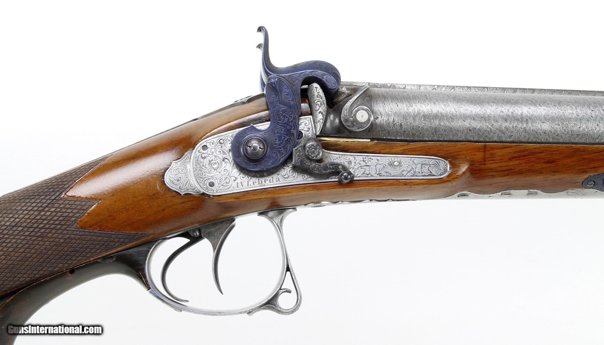 Description: A.V. Lebeda Percussion Rifle / Shotgun in .50 Cal. & 12Ga. Mfg. 1850-1865 by Lebeda in Prague, Czechoslovakia. LOP 13" & 13 3/4". 27 3/4" barrels with good bores. Left side barrel is the Rifled barrel and the Right side barrel is the Smoothbore Shotgun barrel. The Damascus barrels are in great condition and look very sharp. The checkered wood has been nicely refinished and is in fine condition. Highly engraved Sideplates, Patchbox, Trigger Guard, Buttplate and Forearm Metal with Stag scene on inset between hammers. Fully functional. A RARE Collectable. More photos available upon request. As an antique, no FFl is required to purchase. Weight 8.5 lbs. Trigger Pull - Front 3 lbs - Rear 7 lbs. SOLD Antique: Yes Manufacturer: A.V. Lebeda |