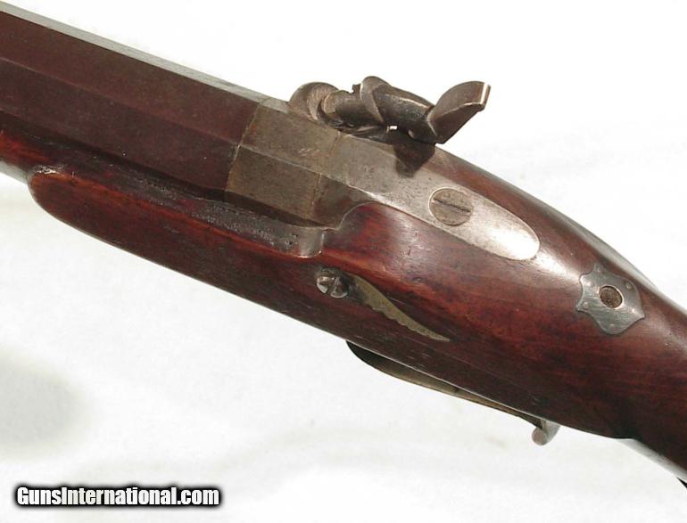 Description: AMERICAN PERCUSSION SPORTING RIFLE BY "S.E. BILLS" .45 caliber, 35" heavy octagon barrel signed S.E. BILLS with provision for a false muzzle. Bar action lock (not marked), walnut half stock with keyed forend and an escutcheon in left buttplate also marked "S.E. BILLS". Brass triggerguard and buttplate. The barrel retains most of the original brown finish, the lock showing mottled case colors. Good bright bore. Excellent wood and varnish. Very handsome high condition rifle. SOLD Antique: Yes |