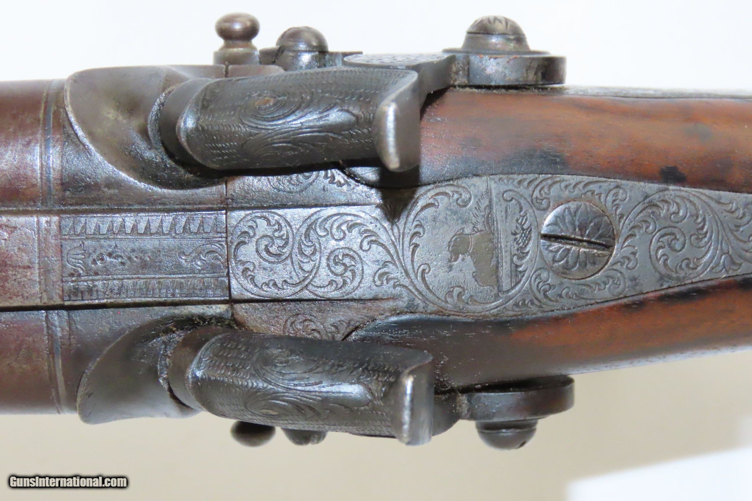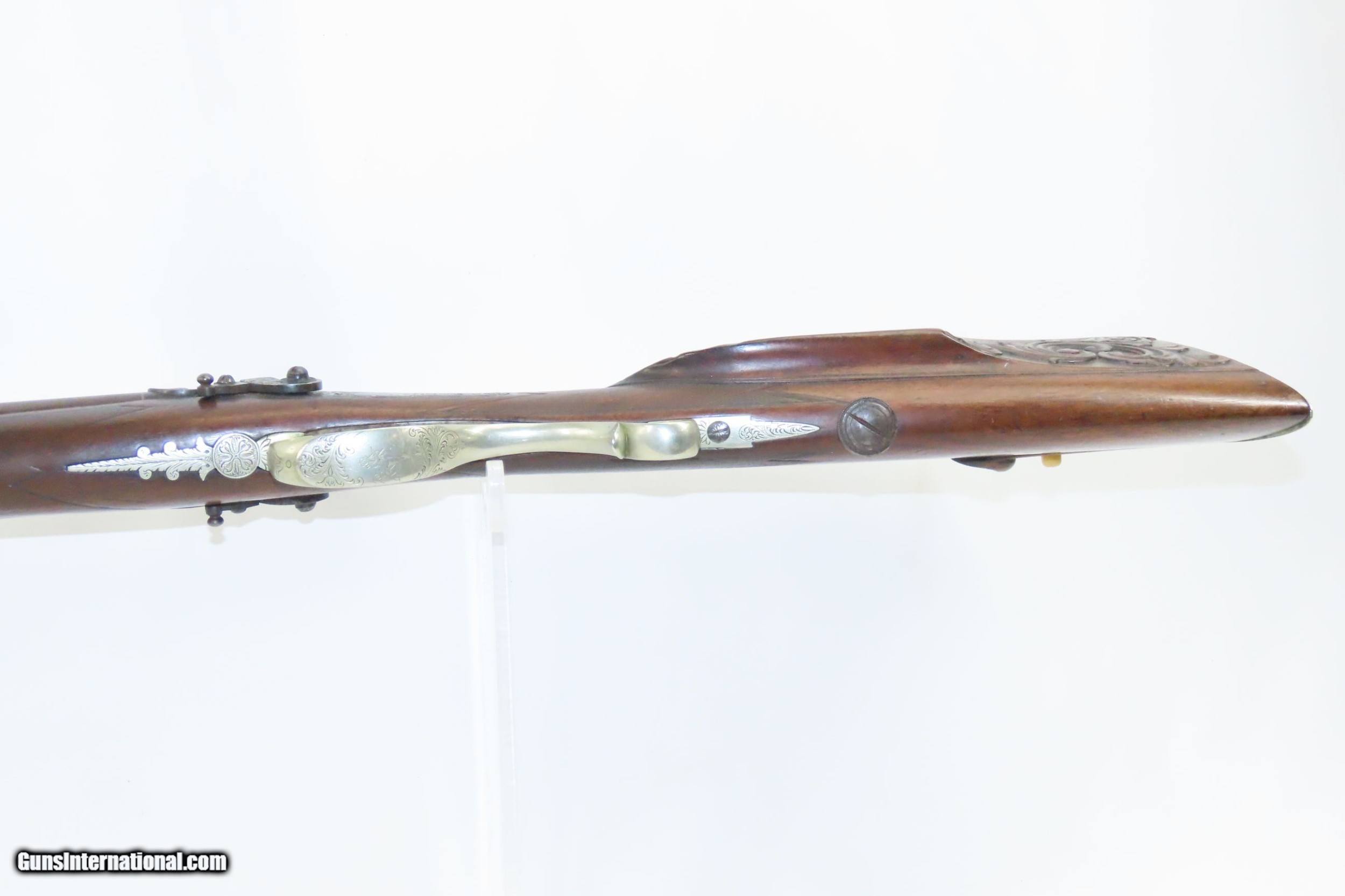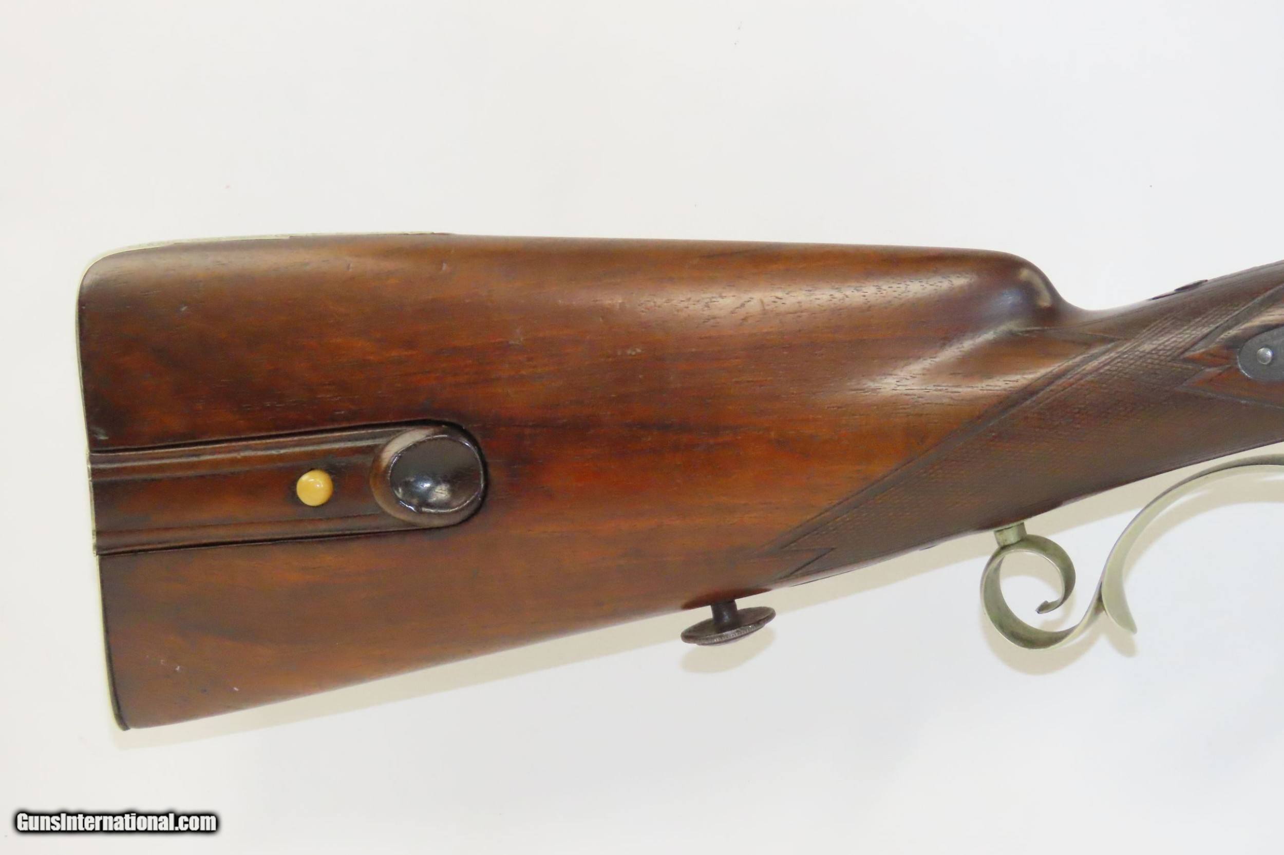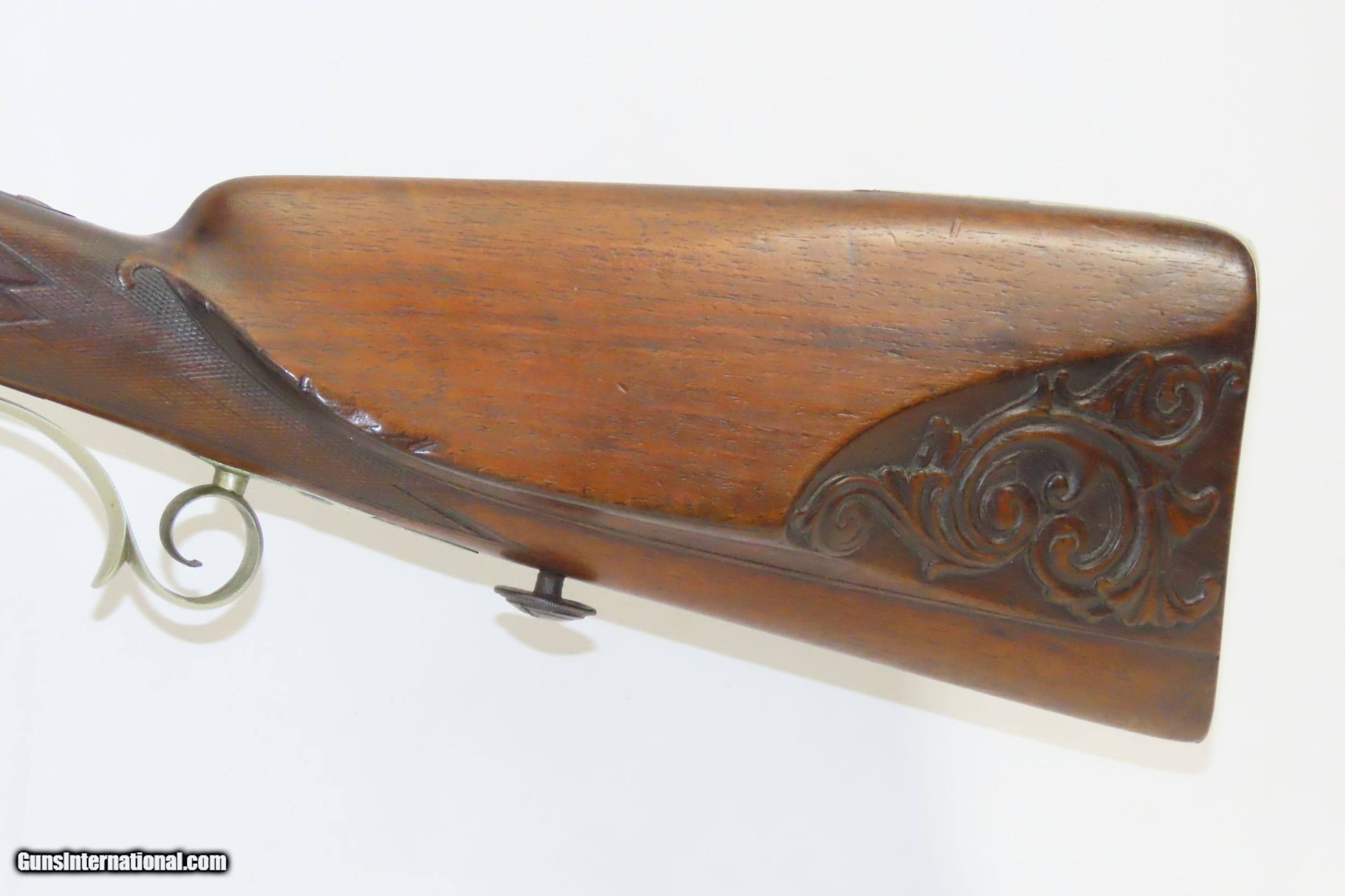 Description: Antique F. SCHULER Side x Side GERMAN Rifle & Shotgun Percussion CAPE GUN ENGRAVED with RELIEF CARVED & Checkered Stock Here we present an antique F. Schuler Side x Side Back Action Rifle & Shotgun Hammer Cape Gun, manufactured circa the 1850s in Suhl, Germany. These were typically high-end hunting weapons that featured a side by side configuration with one barrel rifled and the other smooth. The hunter would use the rifled barrel to fire long range, precise shots against large game and the smooth side could be loaded with a large ball or slug for a quick follow up shot, especially on large and dangerous game. Or the smooth bore could be loaded with shot to make it feasible to hunt fowl at the same time without carrying multiple guns. The gun has two triggers to allow either barrel as needed. Cape guns made in Germany, Belgium, and Austria usually have the rifled barrel on the right side (as is this one), while British made cape guns are usually reversed. These were supremely handy firearms that could also be used to defend the homestead or put game on the table. The overall condition is very good. Original patina. Excellent action. The bores are in good shape for their ages. This example sports a beautifully carved stock with a very Germanic sliding wooden patchbox. Markings are legible. Sharply engraved locks and hammers. Own the original! This is a legitimate antique and not a reproduction. Barrels are 28 inches. Caliber: .56 Percussion & 24 Gauge Overall condition as seen in photos. Very Fast. Very Safe. FREE SHIPPING WORLDWIDE. Delivered directly to your door by express mail! Guaranteed AUTHENTIC & Includes CERTIFICATE OF AUTHENTICITY. ancestryguns $1665 #220361 SOLD Antique: Yes |