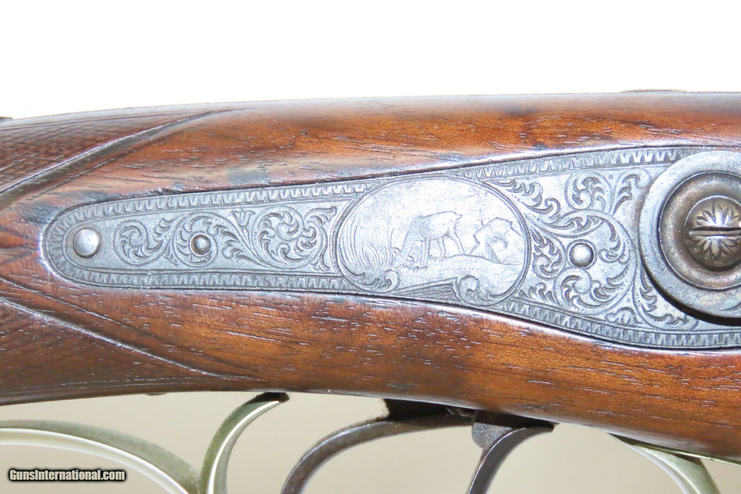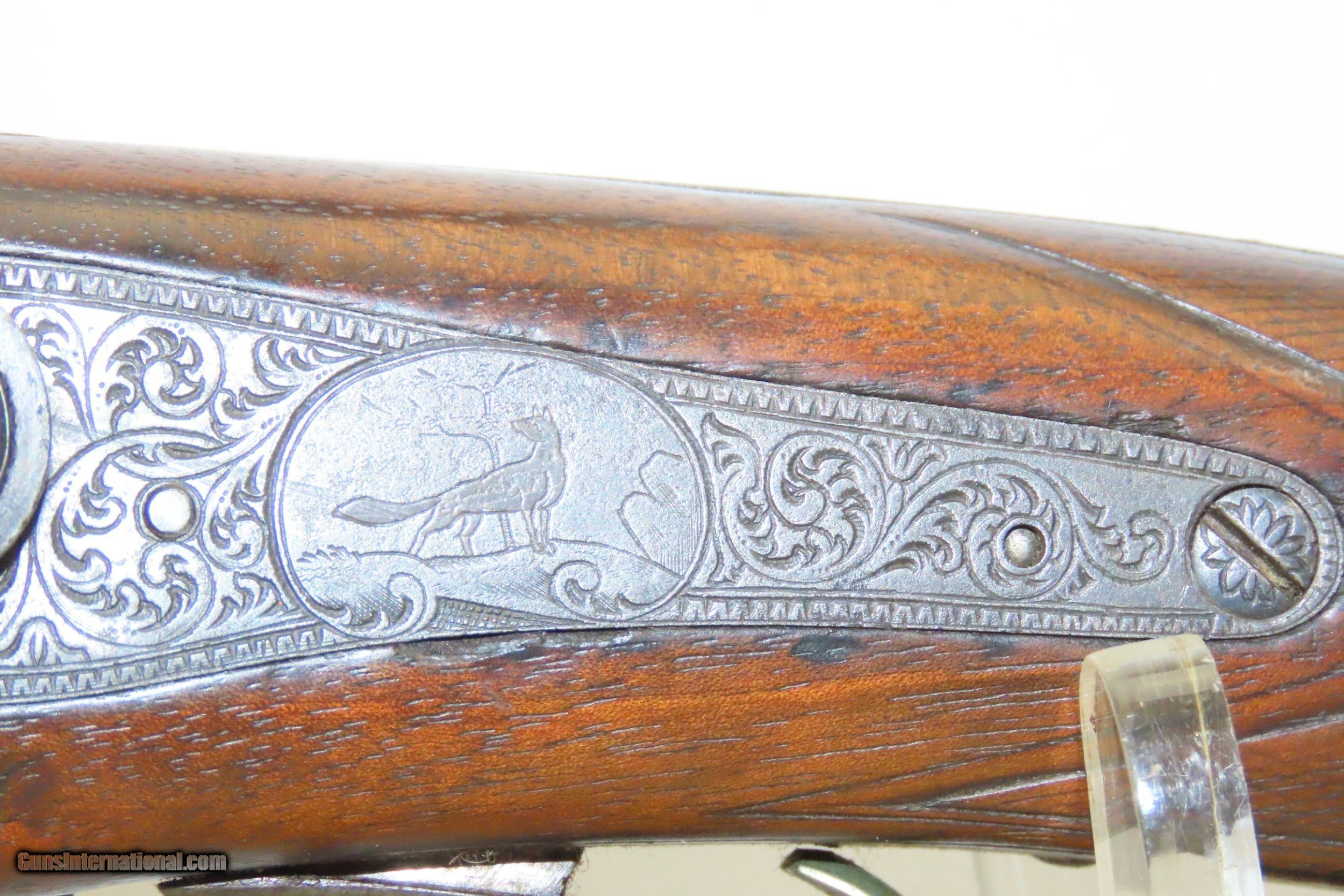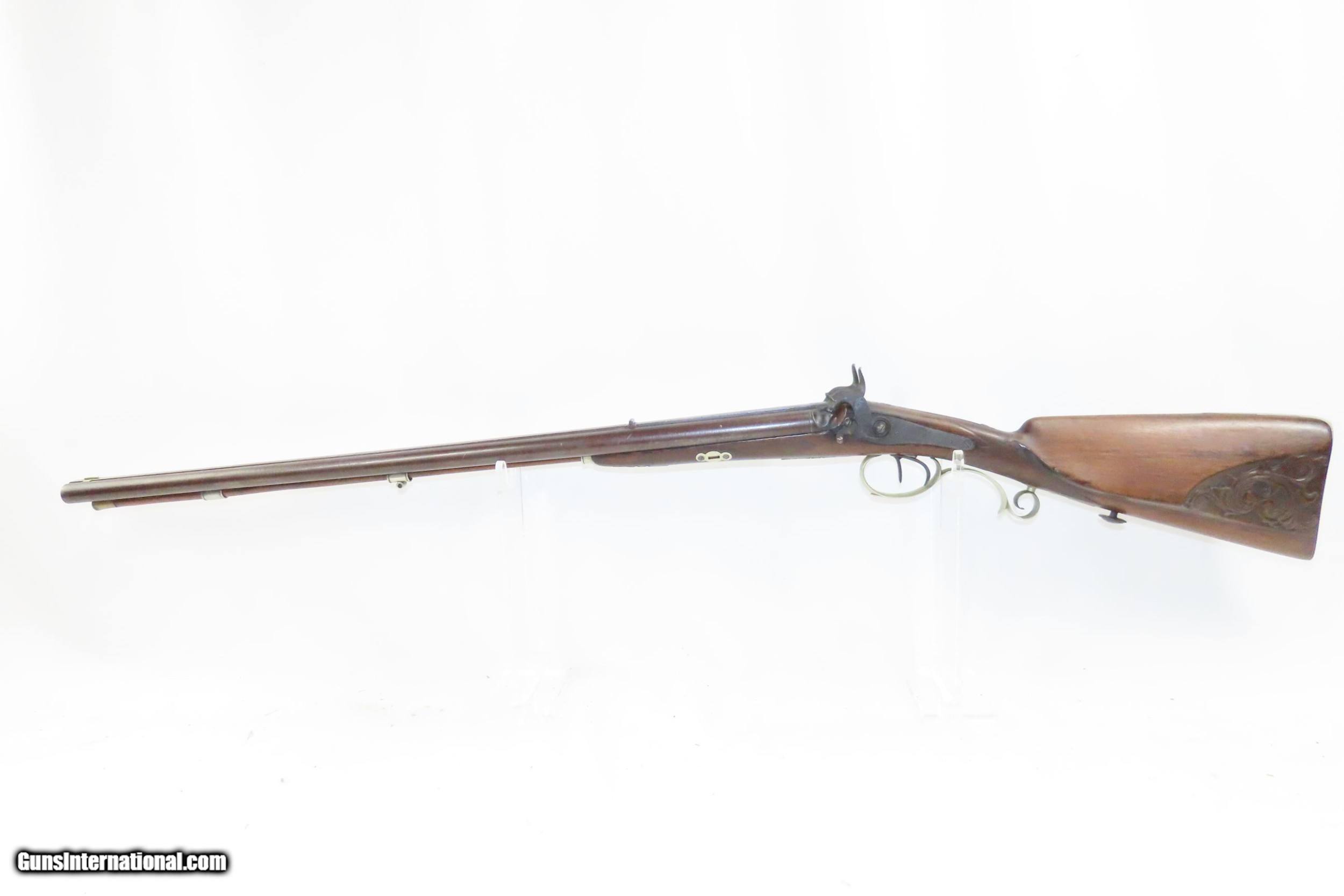 Description: Antique F. SCHULER Side x Side GERMAN Rifle & Shotgun Percussion CAPE GUN ENGRAVED with RELIEF CARVED & Checkered Stock Here we present an antique F. Schuler Side x Side Back Action Rifle & Shotgun Hammer Cape Gun, manufactured circa the 1850s in Suhl, Germany. These were typically high-end hunting weapons that featured a side by side configuration with one barrel rifled and the other smooth. The hunter would use the rifled barrel to fire long range, precise shots against large game and the smooth side could be loaded with a large ball or slug for a quick follow up shot, especially on large and dangerous game. Or the smooth bore could be loaded with shot to make it feasible to hunt fowl at the same time without carrying multiple guns. The gun has two triggers to allow either barrel as needed. Cape guns made in Germany, Belgium, and Austria usually have the rifled barrel on the right side (as is this one), while British made cape guns are usually reversed. These were supremely handy firearms that could also be used to defend the homestead or put game on the table. The overall condition is very good. Original patina. Excellent action. The bores are in good shape for their ages. This example sports a beautifully carved stock with a very Germanic sliding wooden patchbox. Markings are legible. Sharply engraved locks and hammers. Own the original! This is a legitimate antique and not a reproduction. Barrels are 28 inches. Caliber: .56 Percussion & 24 Gauge Overall condition as seen in photos. Very Fast. Very Safe. FREE SHIPPING WORLDWIDE. Delivered directly to your door by express mail! Guaranteed AUTHENTIC & Includes CERTIFICATE OF AUTHENTICITY. ancestryguns $1665 #220361 SOLD Antique: Yes |
