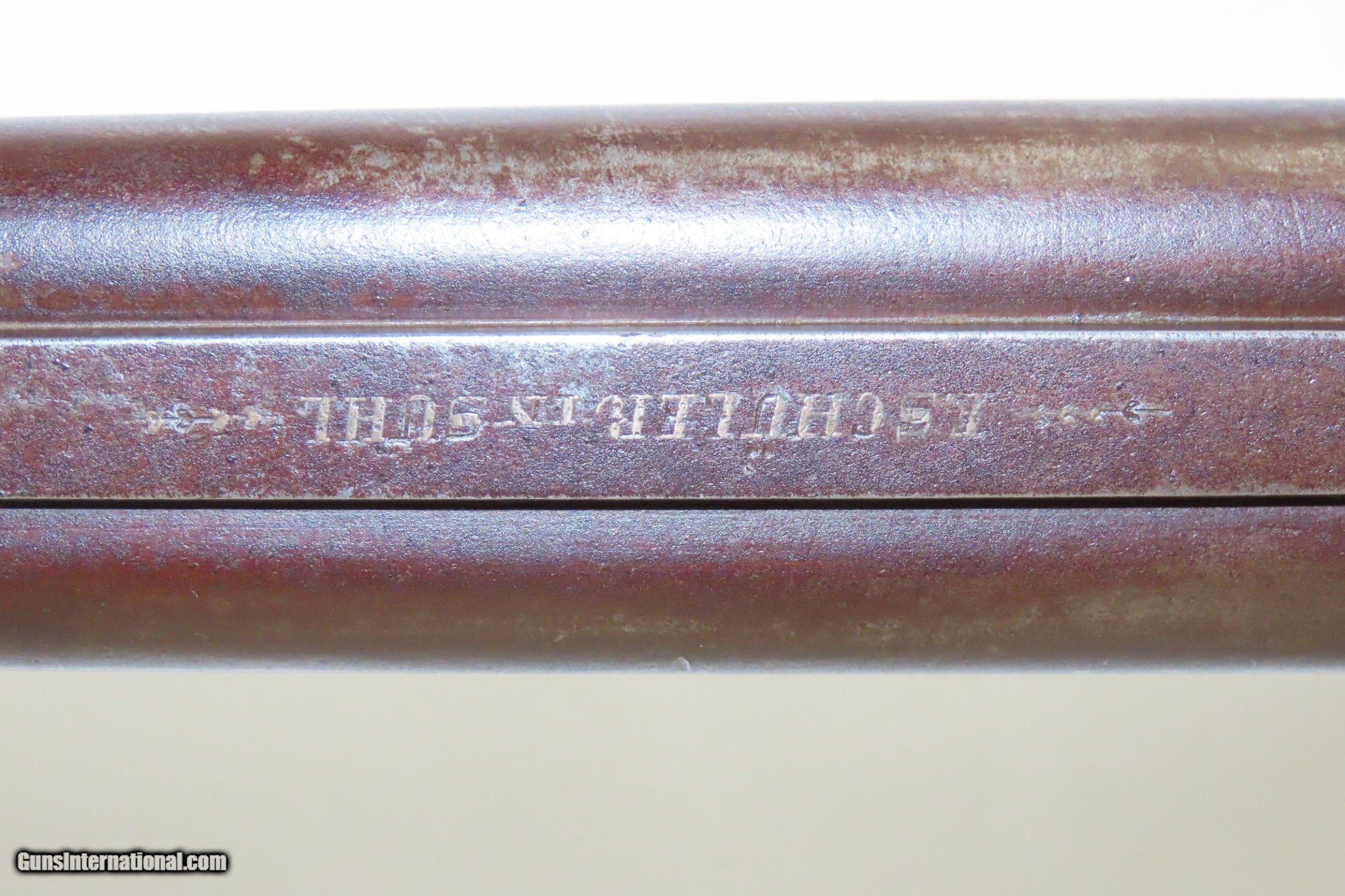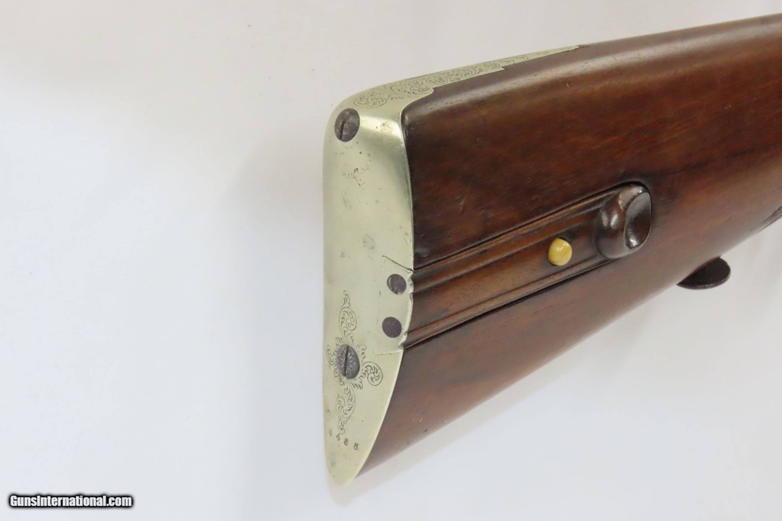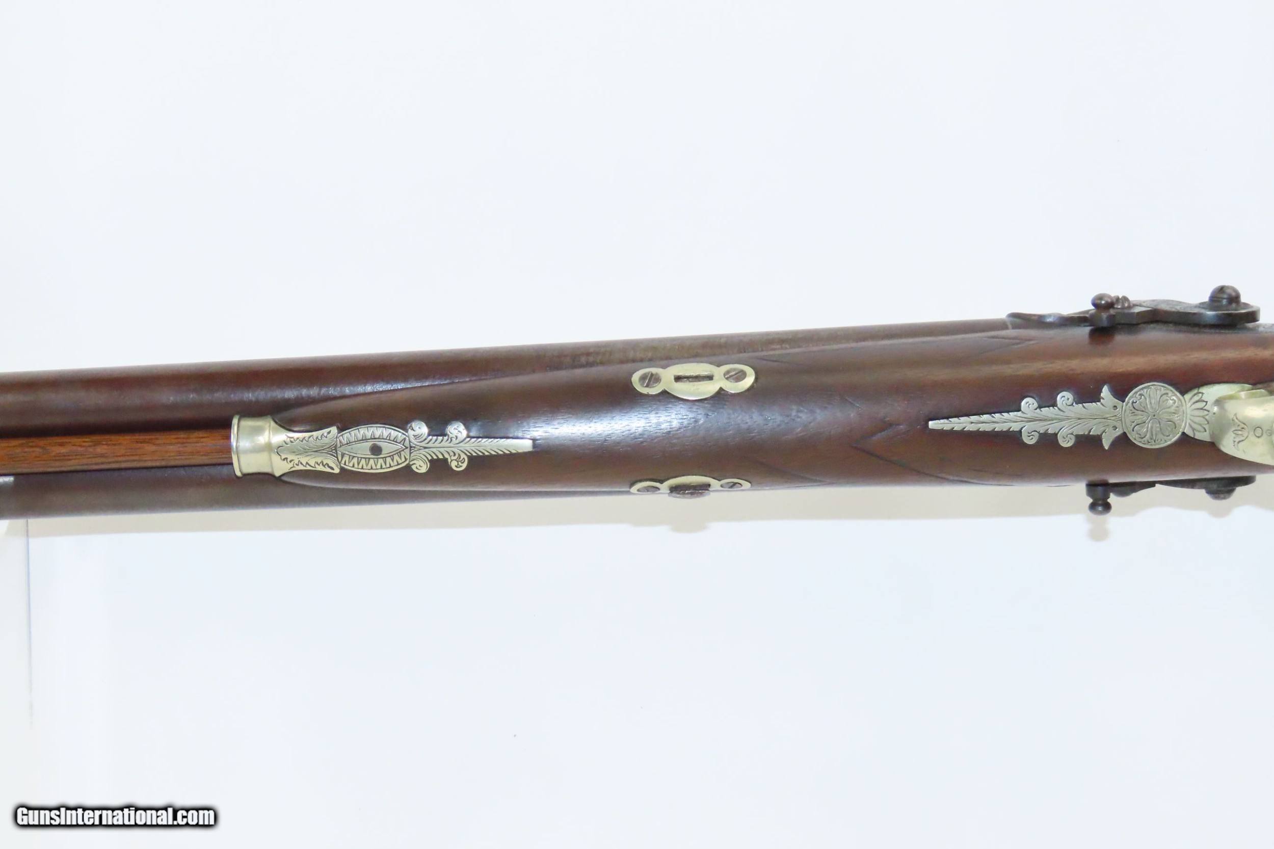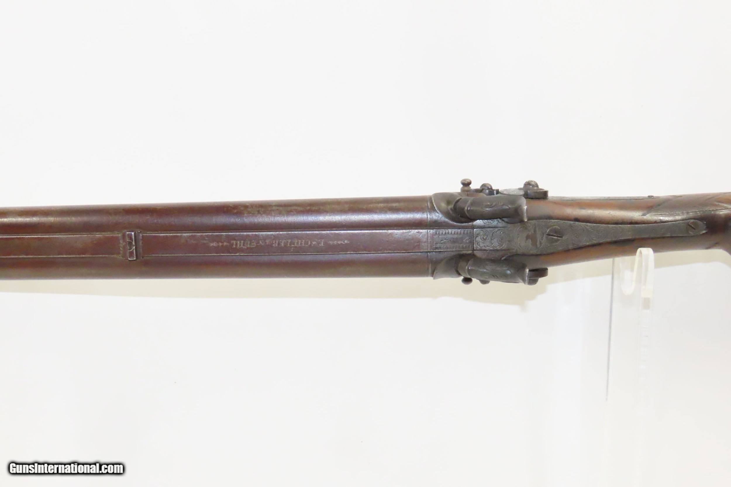 Description: Antique F. SCHULER Side x Side GERMAN Rifle & Shotgun Percussion CAPE GUN ENGRAVED with RELIEF CARVED & Checkered Stock Here we present an antique F. Schuler Side x Side Back Action Rifle & Shotgun Hammer Cape Gun, manufactured circa the 1850s in Suhl, Germany. These were typically high-end hunting weapons that featured a side by side configuration with one barrel rifled and the other smooth. The hunter would use the rifled barrel to fire long range, precise shots against large game and the smooth side could be loaded with a large ball or slug for a quick follow up shot, especially on large and dangerous game. Or the smooth bore could be loaded with shot to make it feasible to hunt fowl at the same time without carrying multiple guns. The gun has two triggers to allow either barrel as needed. Cape guns made in Germany, Belgium, and Austria usually have the rifled barrel on the right side (as is this one), while British made cape guns are usually reversed. These were supremely handy firearms that could also be used to defend the homestead or put game on the table. The overall condition is very good. Original patina. Excellent action. The bores are in good shape for their ages. This example sports a beautifully carved stock with a very Germanic sliding wooden patchbox. Markings are legible. Sharply engraved locks and hammers. Own the original! This is a legitimate antique and not a reproduction. Barrels are 28 inches. Caliber: .56 Percussion & 24 Gauge Overall condition as seen in photos. Very Fast. Very Safe. FREE SHIPPING WORLDWIDE. Delivered directly to your door by express mail! Guaranteed AUTHENTIC & Includes CERTIFICATE OF AUTHENTICITY. ancestryguns $1665 #220361 SOLD Antique: Yes |