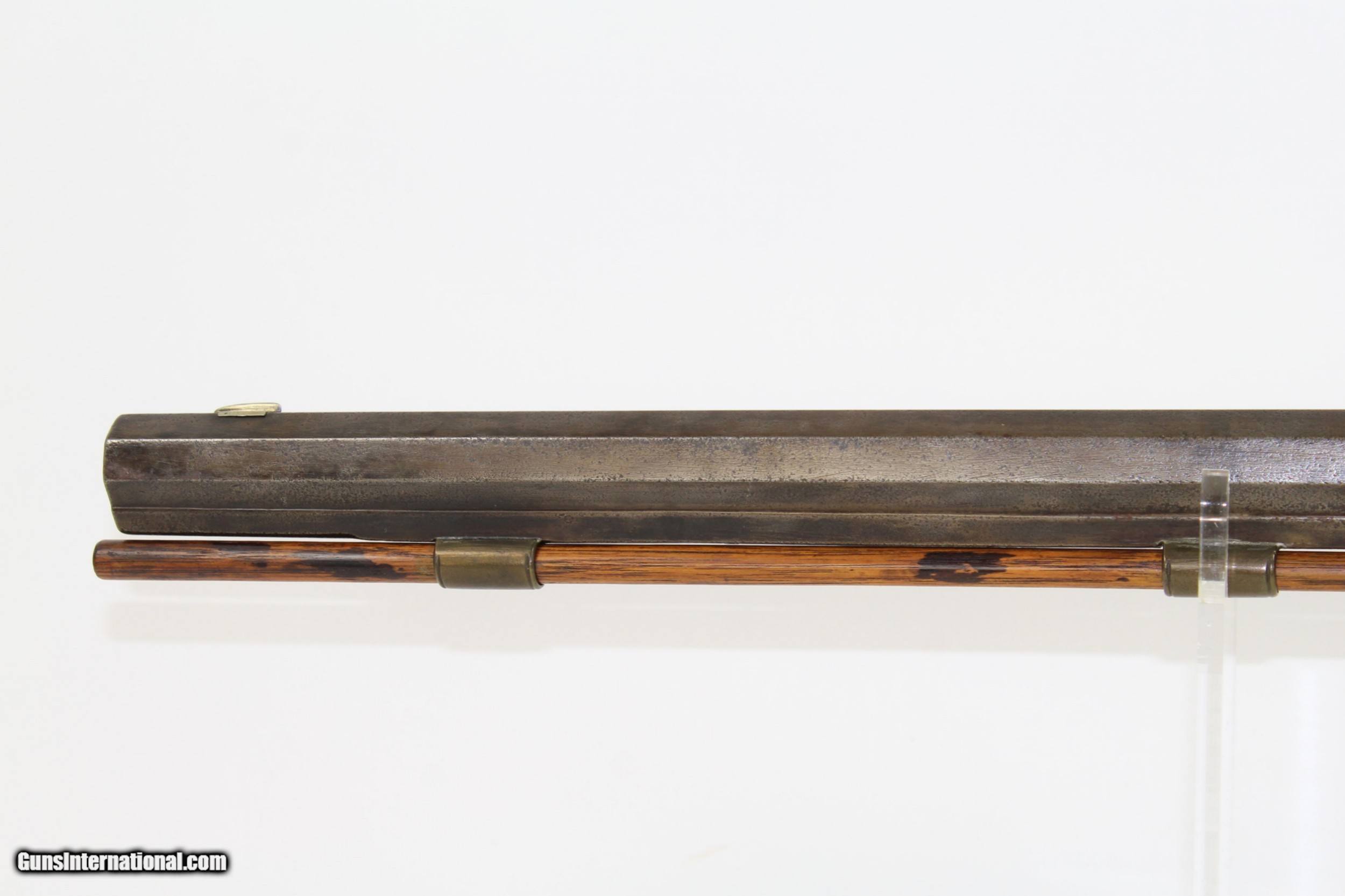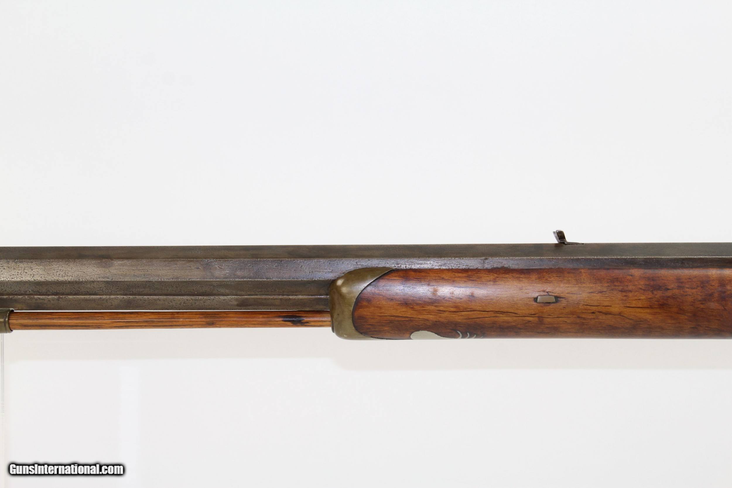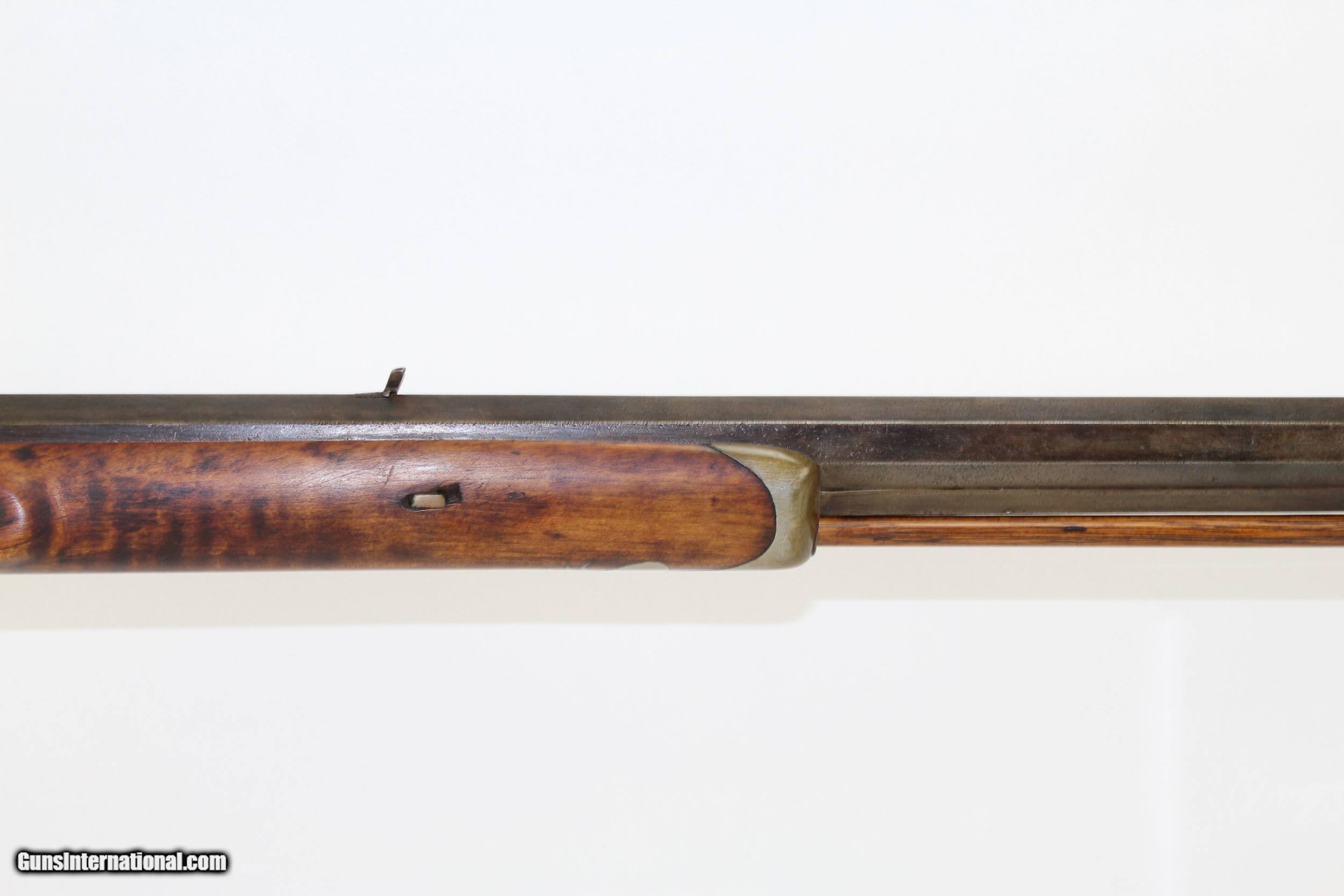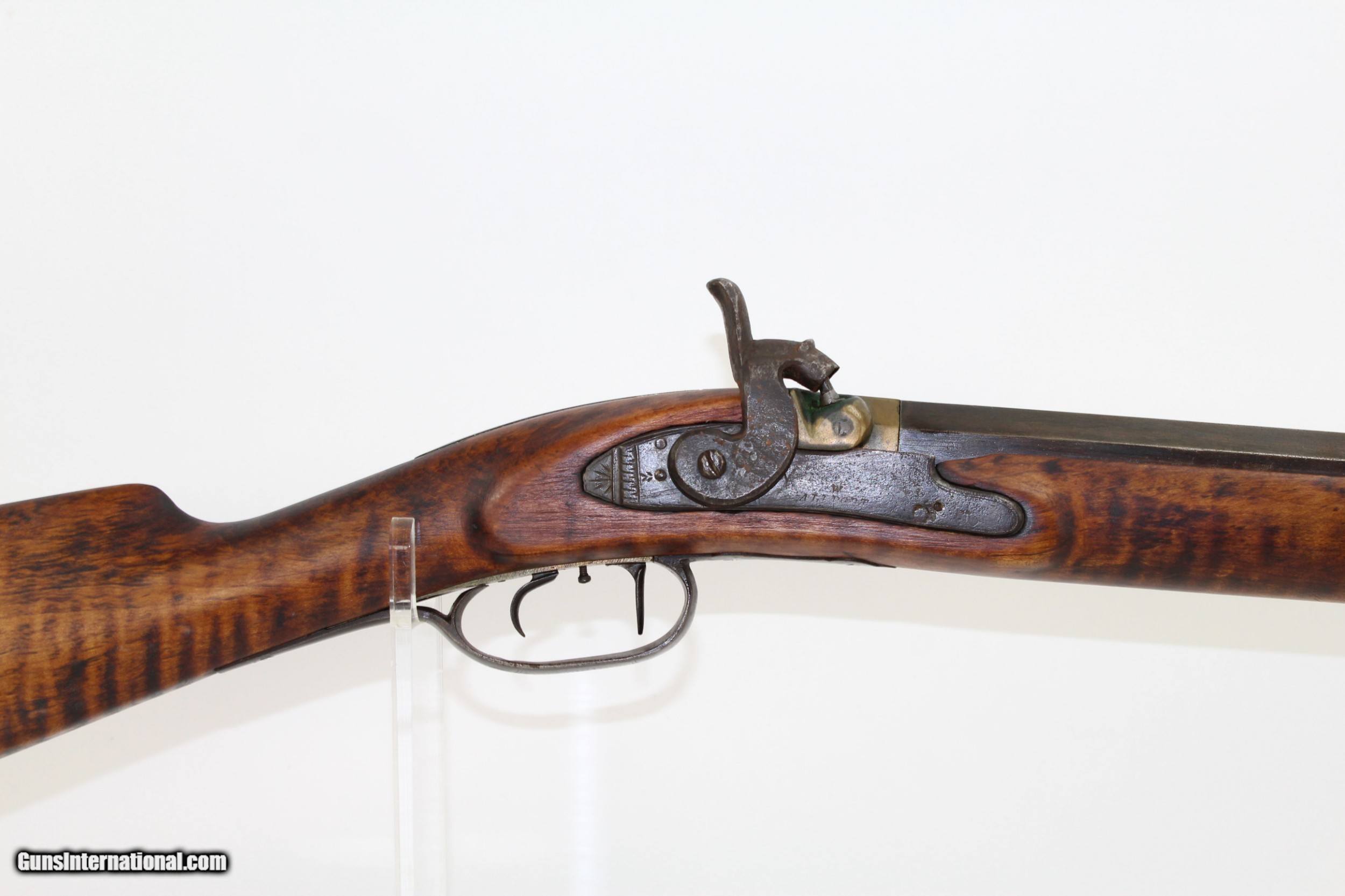 Description: Antique Half-Stock .50 Caliber LONG RIFLE Made Circa the 1840s with “ALLPORT” Lock Here we present an antique Half-Stock Long Rifle, made circa the 1840s. The American Longrifle, more commonly, but less correctly, known as the ‘Kentucky rifle’, was described by Captain John G. W. Dillin in the dedication to his seminal 1924 book, The Kentucky Rifle: “From a flat bar of soft iron, hand forged into a gun barrel; laboriously bored and rifled with crude tools; fitted with a stock hewn from a maple tree in the neighboring forest; and supplied with a lock hammered to shape on the anvil; an unknown smith, in a shop long since silent, fashioned a rifle which changed the whole course of world history; made possible the settlement of a continent; and ultimately freed our country of foreign domination. Light in weight; graceful in line; economical in consumption of powder and lead; fatally precise; distinctly American; it sprang into immediate popularity; and for a hundred years was a model often slightly varied but never radically changed.” This rifle features a “W. ALLPORT” marked lock. William Allport was a firearms component manufacturer in Birmingham, England during this period. The overall condition is good. The metal surfaces are dark with age. The markings are legible. The stock remains solid despite the split on the left side. Stock shows signs of sanding but grain remains very nice. The bore is dark with visible rifling. The action on this rifle is excellent, strong and crisp. Own the original! This is a legitimate antique and not a reproduction. Barrel is 28-1/2 inches. Caliber: .50 Percussion Overall condition as seen in photos. Very Fast. Very Safe. FREE SHIPPING WORLDWIDE. Delivered directly to your door by express mail! Guaranteed AUTHENTIC & Includes CERTIFICATE OF AUTHENTICITY. ancestryguns $1350 #7180 SOLD Antique: Yes |