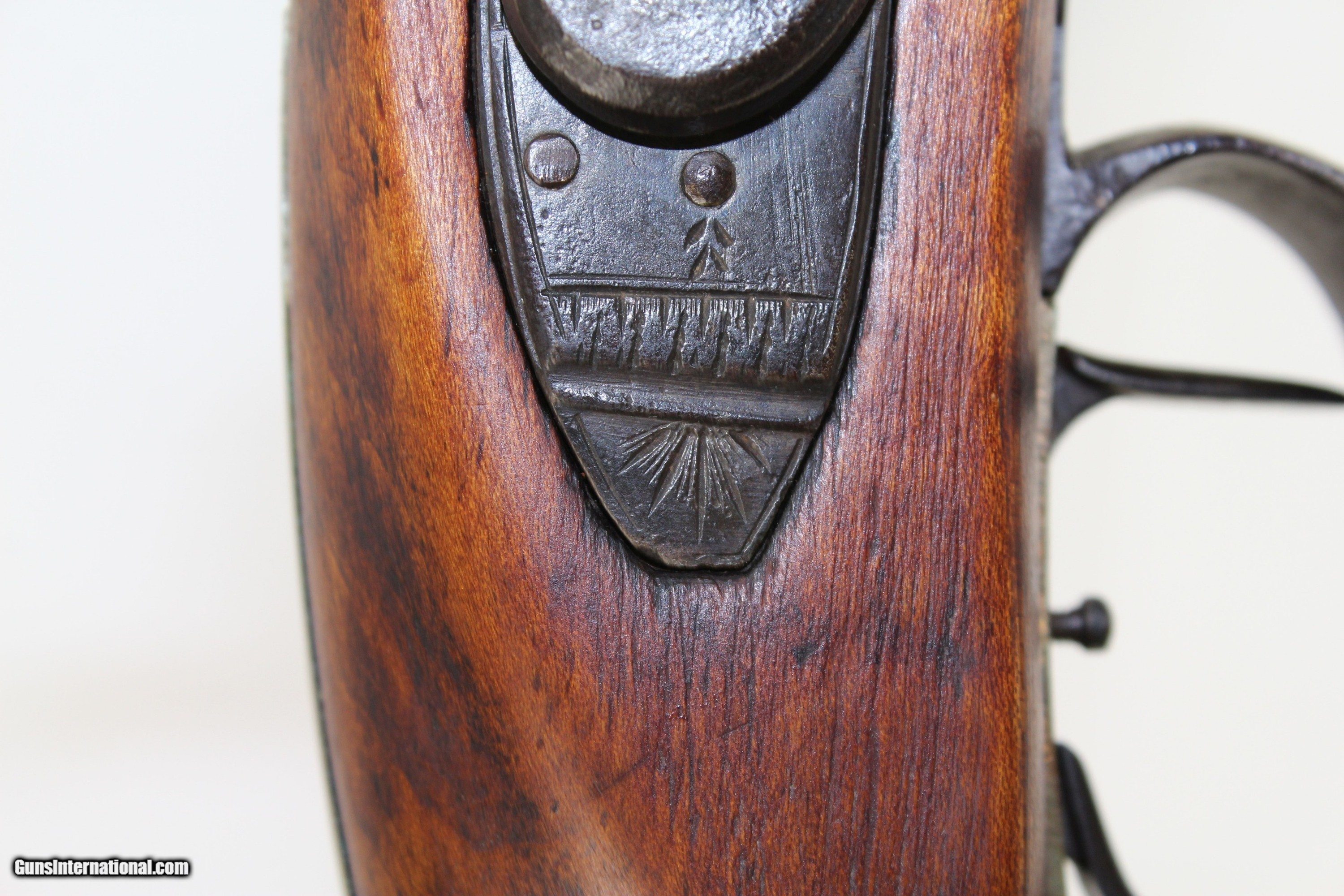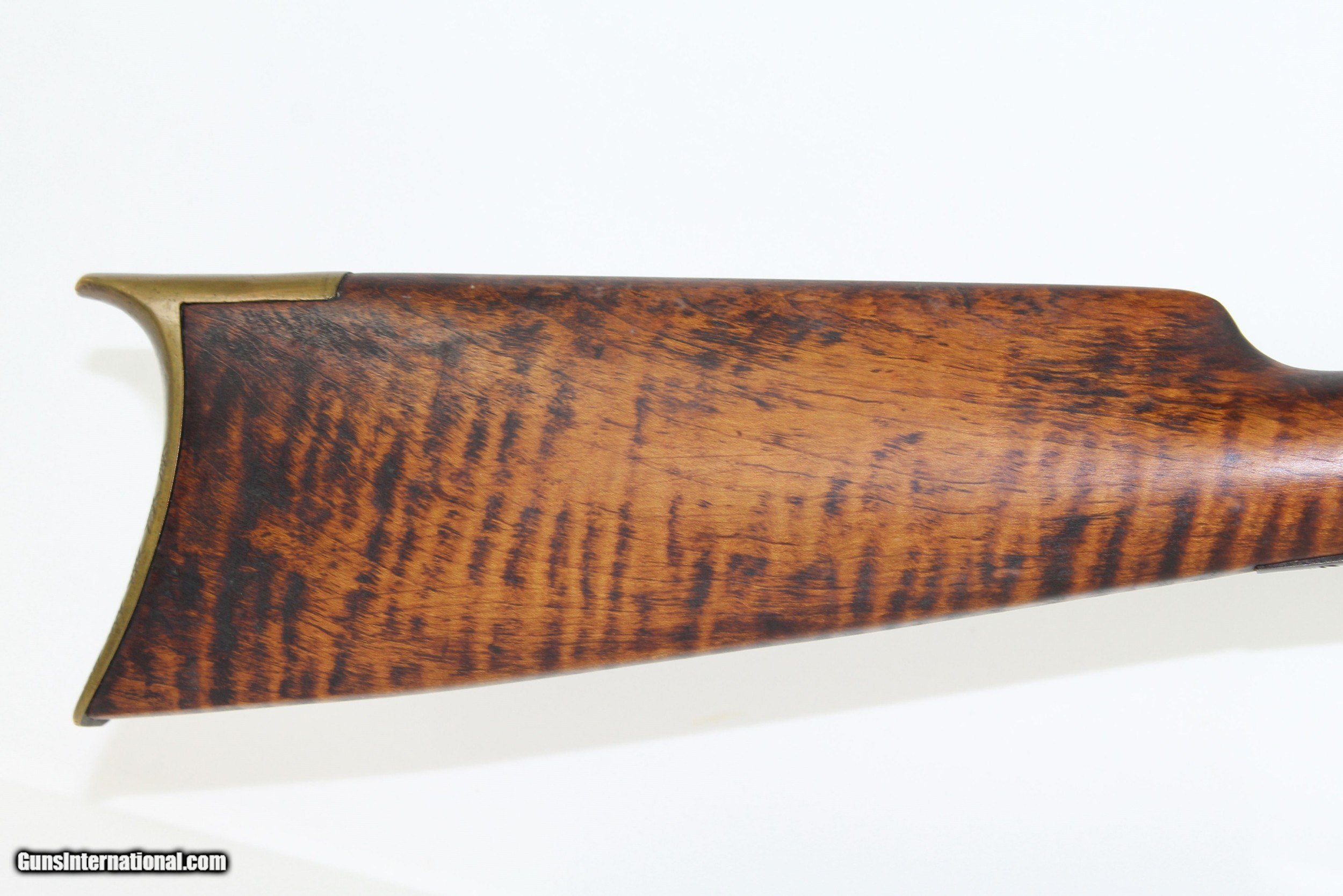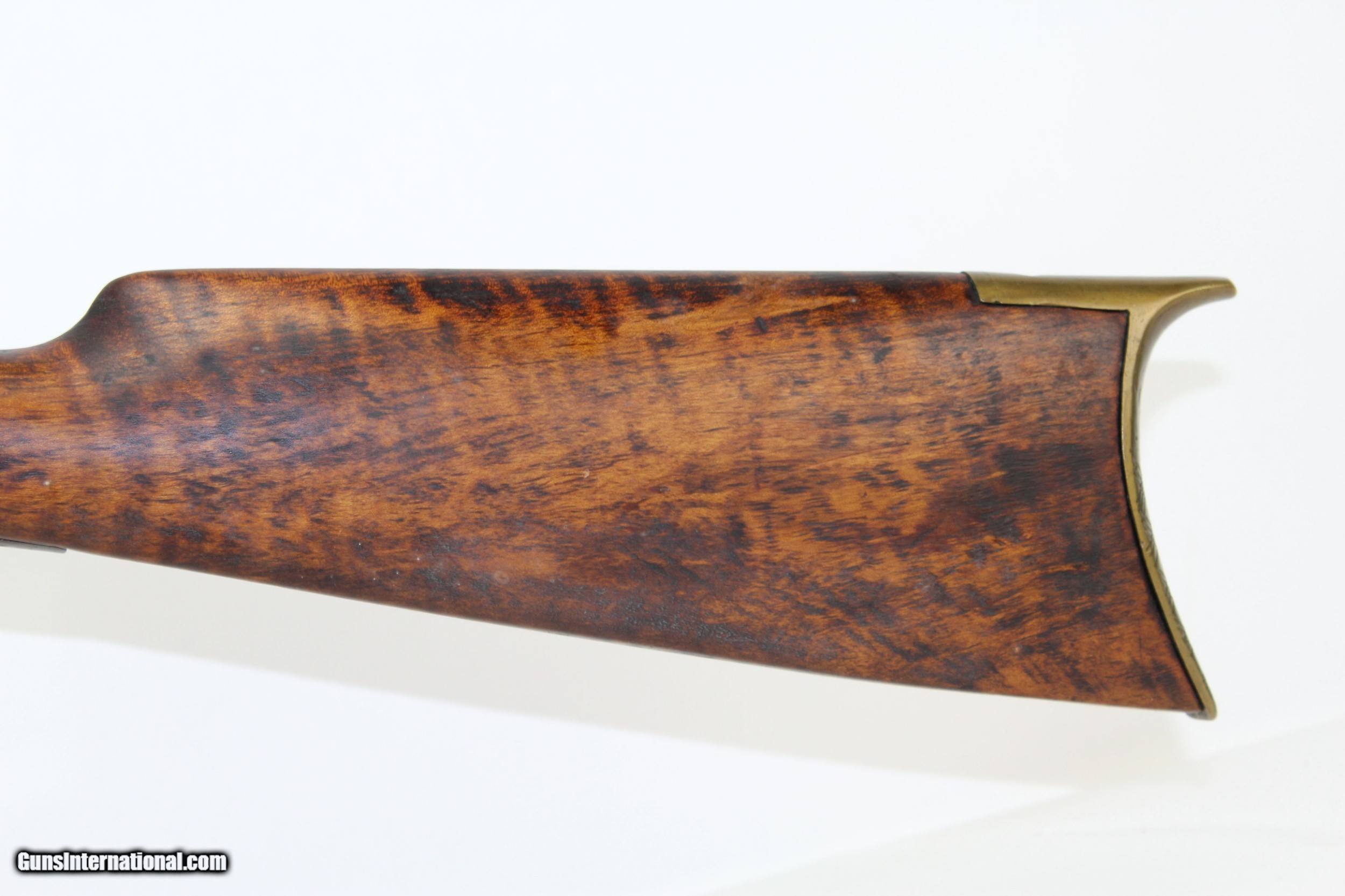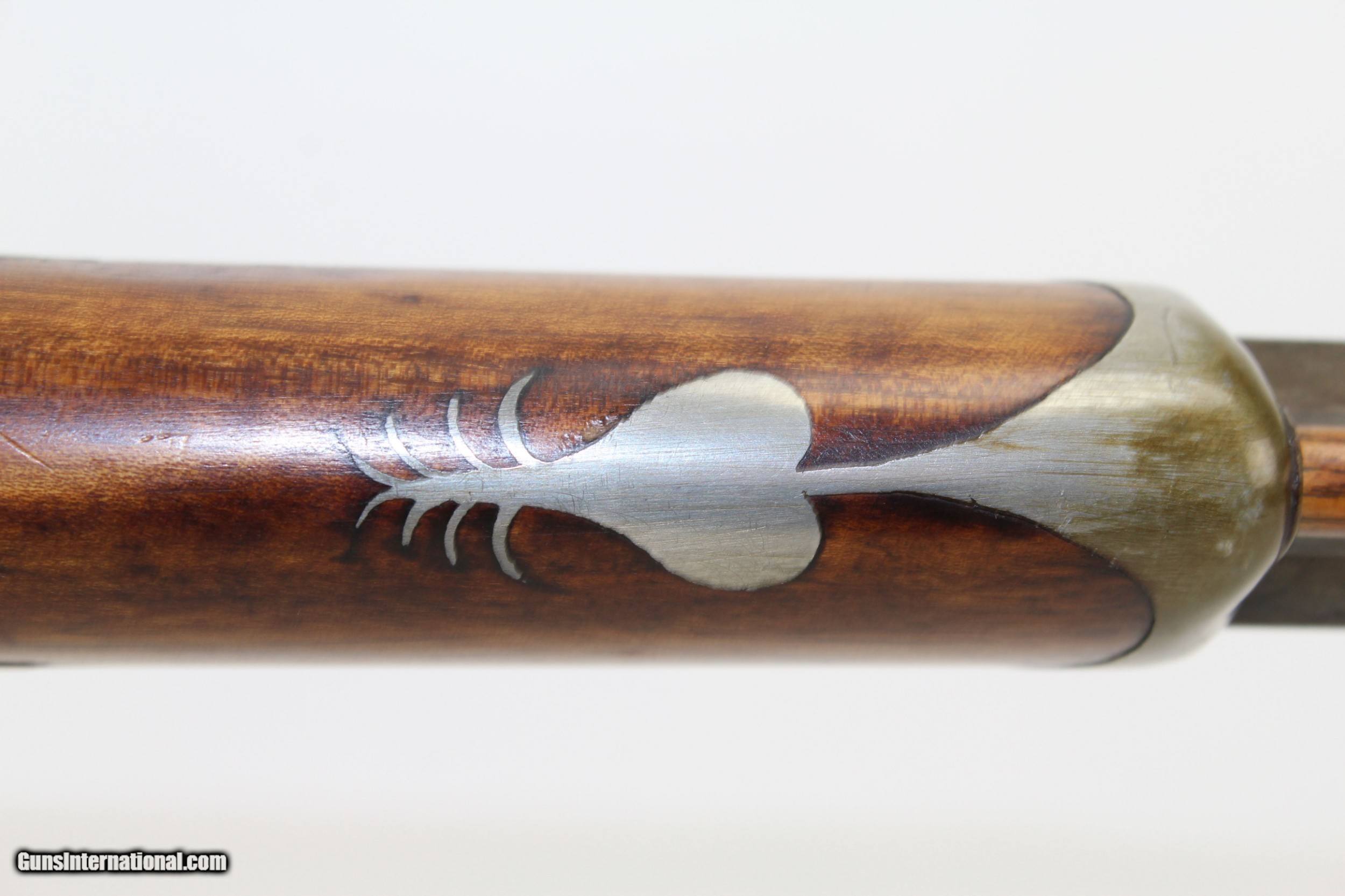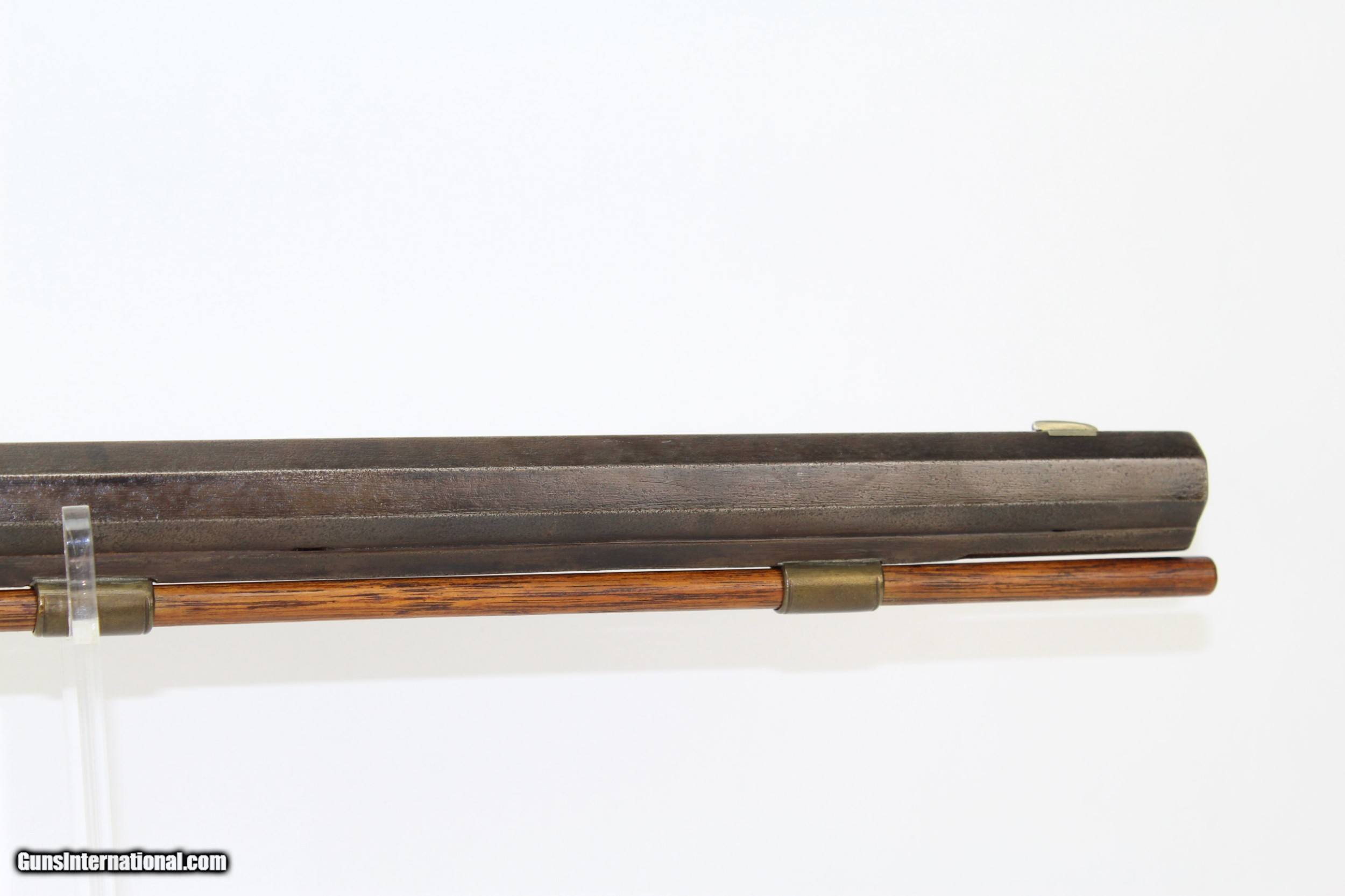 Description: Antique Half-Stock .50 Caliber LONG RIFLE Made Circa the 1840s with “ALLPORT” Lock Here we present an antique Half-Stock Long Rifle, made circa the 1840s. The American Longrifle, more commonly, but less correctly, known as the ‘Kentucky rifle’, was described by Captain John G. W. Dillin in the dedication to his seminal 1924 book, The Kentucky Rifle: “From a flat bar of soft iron, hand forged into a gun barrel; laboriously bored and rifled with crude tools; fitted with a stock hewn from a maple tree in the neighboring forest; and supplied with a lock hammered to shape on the anvil; an unknown smith, in a shop long since silent, fashioned a rifle which changed the whole course of world history; made possible the settlement of a continent; and ultimately freed our country of foreign domination. Light in weight; graceful in line; economical in consumption of powder and lead; fatally precise; distinctly American; it sprang into immediate popularity; and for a hundred years was a model often slightly varied but never radically changed.” This rifle features a “W. ALLPORT” marked lock. William Allport was a firearms component manufacturer in Birmingham, England during this period. The overall condition is good. The metal surfaces are dark with age. The markings are legible. The stock remains solid despite the split on the left side. Stock shows signs of sanding but grain remains very nice. The bore is dark with visible rifling. The action on this rifle is excellent, strong and crisp. Own the original! This is a legitimate antique and not a reproduction. Barrel is 28-1/2 inches. Caliber: .50 Percussion Overall condition as seen in photos. Very Fast. Very Safe. FREE SHIPPING WORLDWIDE. Delivered directly to your door by express mail! Guaranteed AUTHENTIC & Includes CERTIFICATE OF AUTHENTICITY. ancestryguns $1350 #7180 SOLD Antique: Yes |