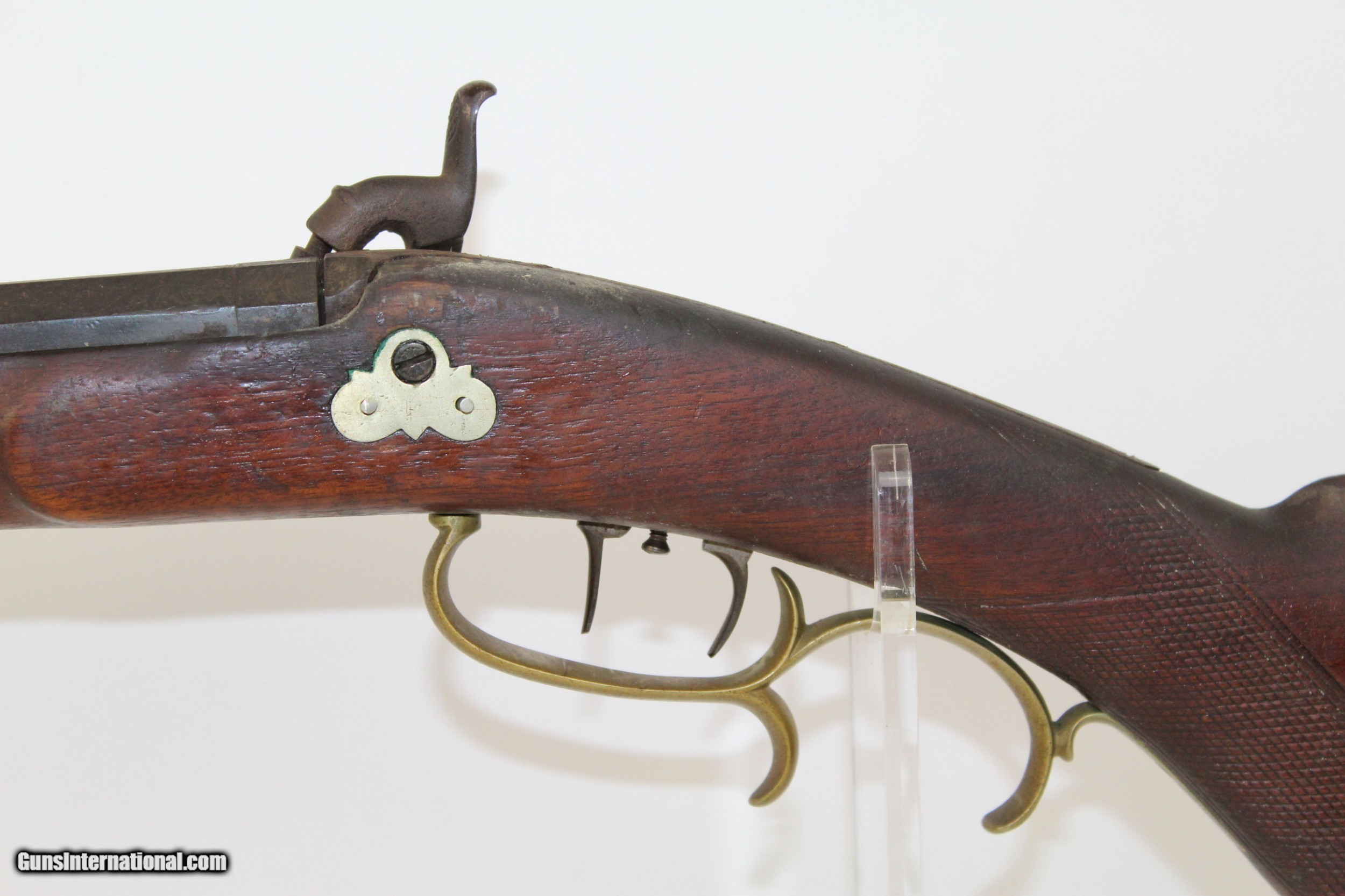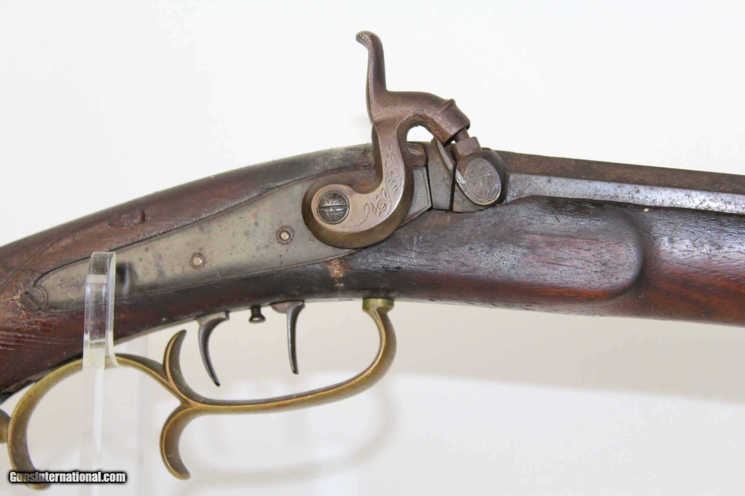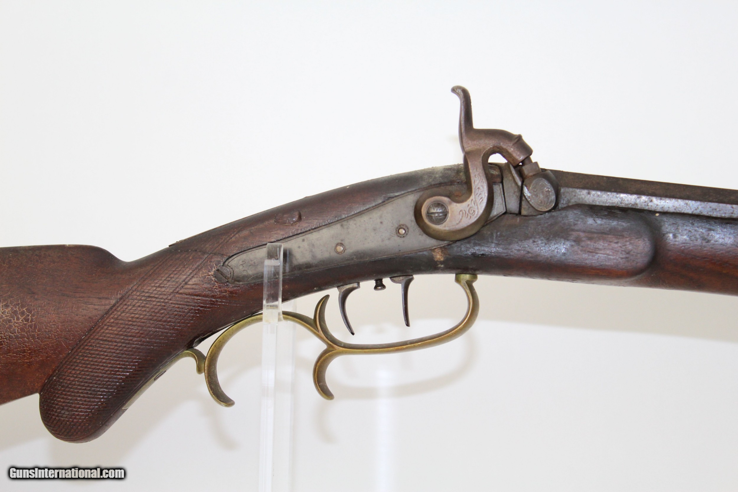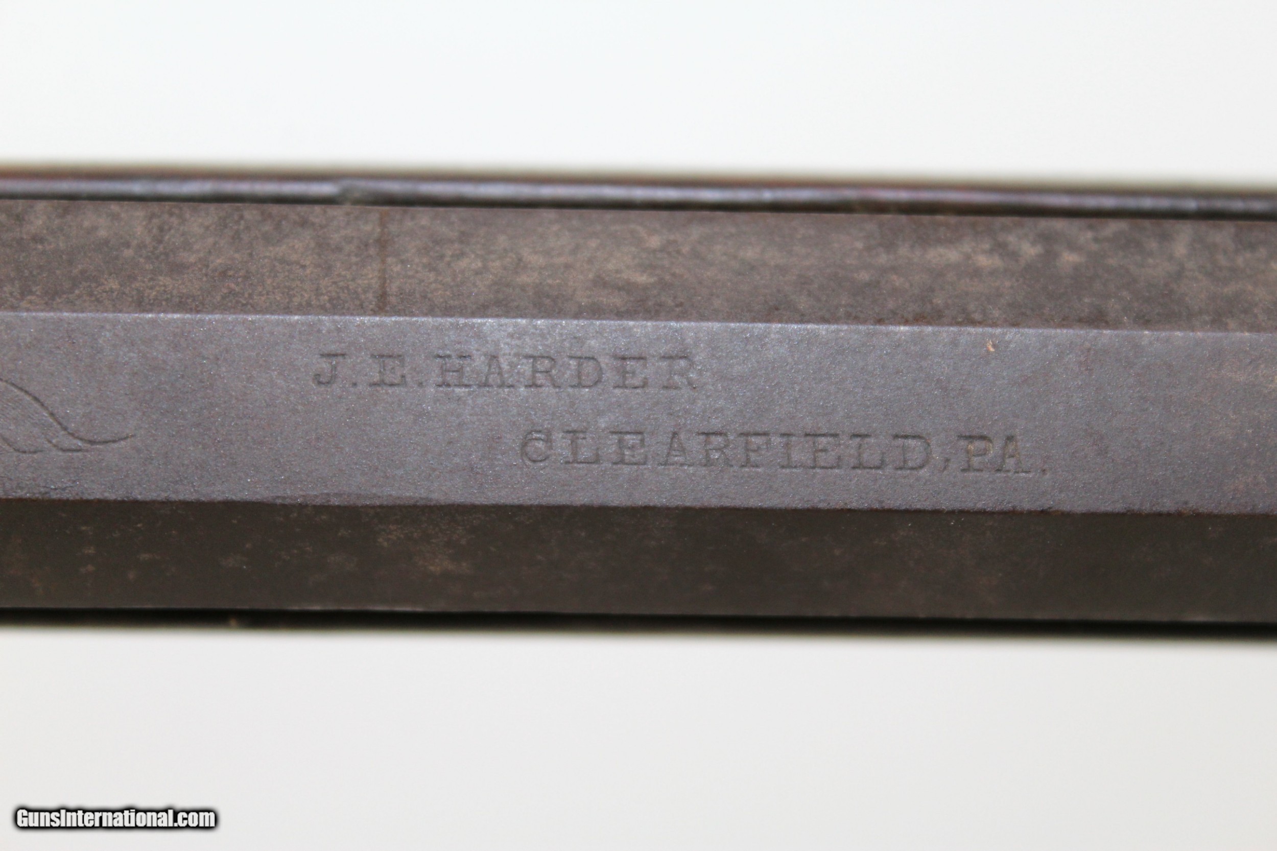 Description: Antique JE Harder PENNSYLVANIA HALF STOCK Rifle MADE Circa 1880’s in Clearfield, PA Here we present an antique J.E. Harder Back Action Half Stock Percussion Long Rifle, made circa the 1880s in Clearfield, Pennsylvania. John Harder was a long successful business man and gunmaker from Clearfield, Pennsylvania. After graduating from Lock Haven Seminary, he became the proprietor of Harder’s Gun Works established in 1878 at the age of 20. Mr. Harder was a thirty-second degree Mason and belonged also to other fraternalanizations. From early manhood he was politically identified with the Republican Party, and whether serving his friends or holding office himself, was always loyal to its principles. This rifle features a distinctly shaped stock with a pistol grip, dramatically curved trigger guard, double set triggers, and a patch box. The bore is .45 caliber. The cheek rest is inset with a stag. The top of the octagonal barrel is marked “J.E. HARDER/CLEARFIELD, PA”. The overall condition is good. The metal surfaces are dark with age. The markings are clear and legible. The stock has a small repair from the end of the barrel tang to the tail of the back-action lock. The bore is coated with a fine dust with sharp rifling showing through. The bore should clean up very nicely if one was of a mind to do so. The action is excellent, strong and crisp, especially with that double set trigger. Here is a great percussion rifle that would have been great for putting venison on the table or protecting the homestead! Own the original! This is a legitimate antique and not a reproduction. Barrel is 36-3/4 inches. Caliber: .45 percussion Overall condition as seen in photos. Very Fast. Very Safe. FREE SHIPPING WORLDWIDE. Delivered directly to your door by express mail! Guaranteed AUTHENTIC & Includes CERTIFICATE OF AUTHENTICITY. ancestryguns $1425 #6345 SOLD Antique: Yes |