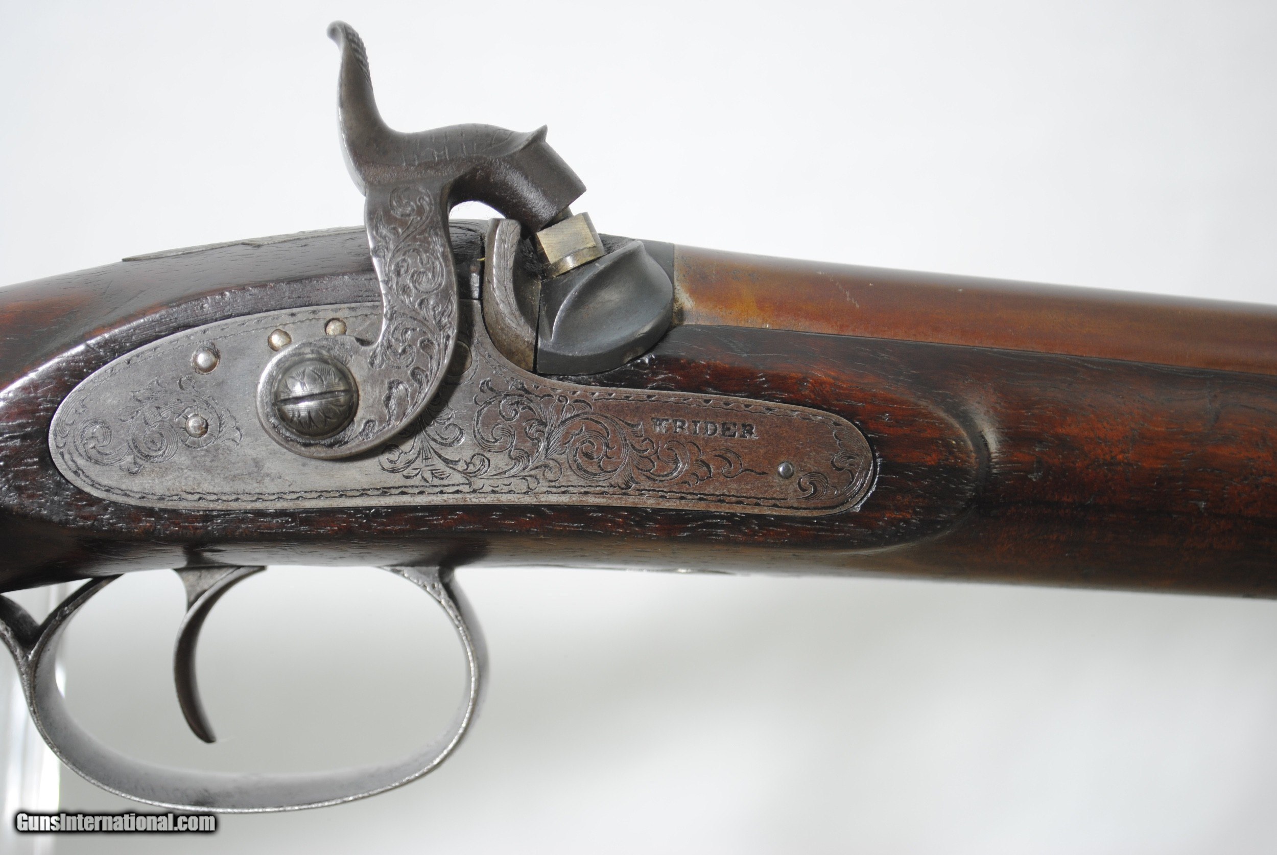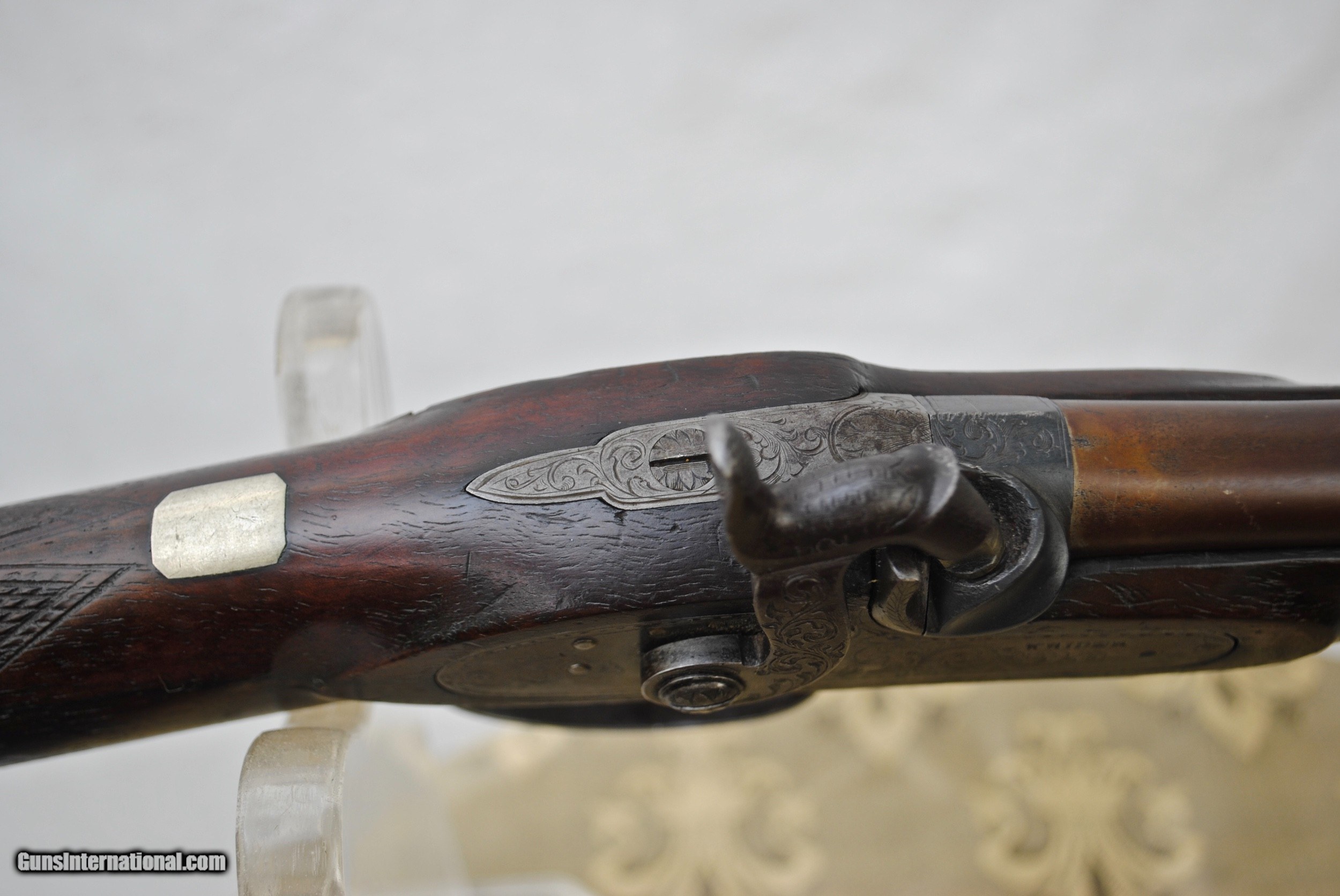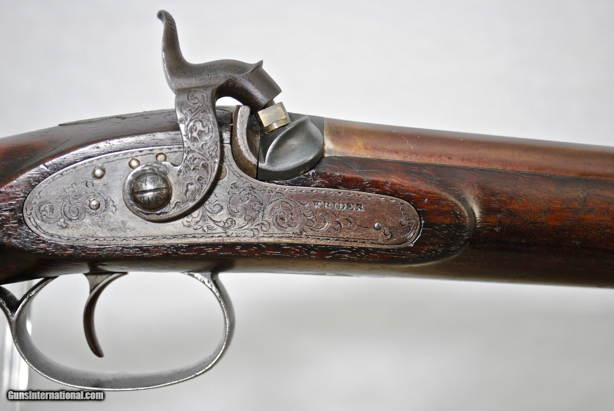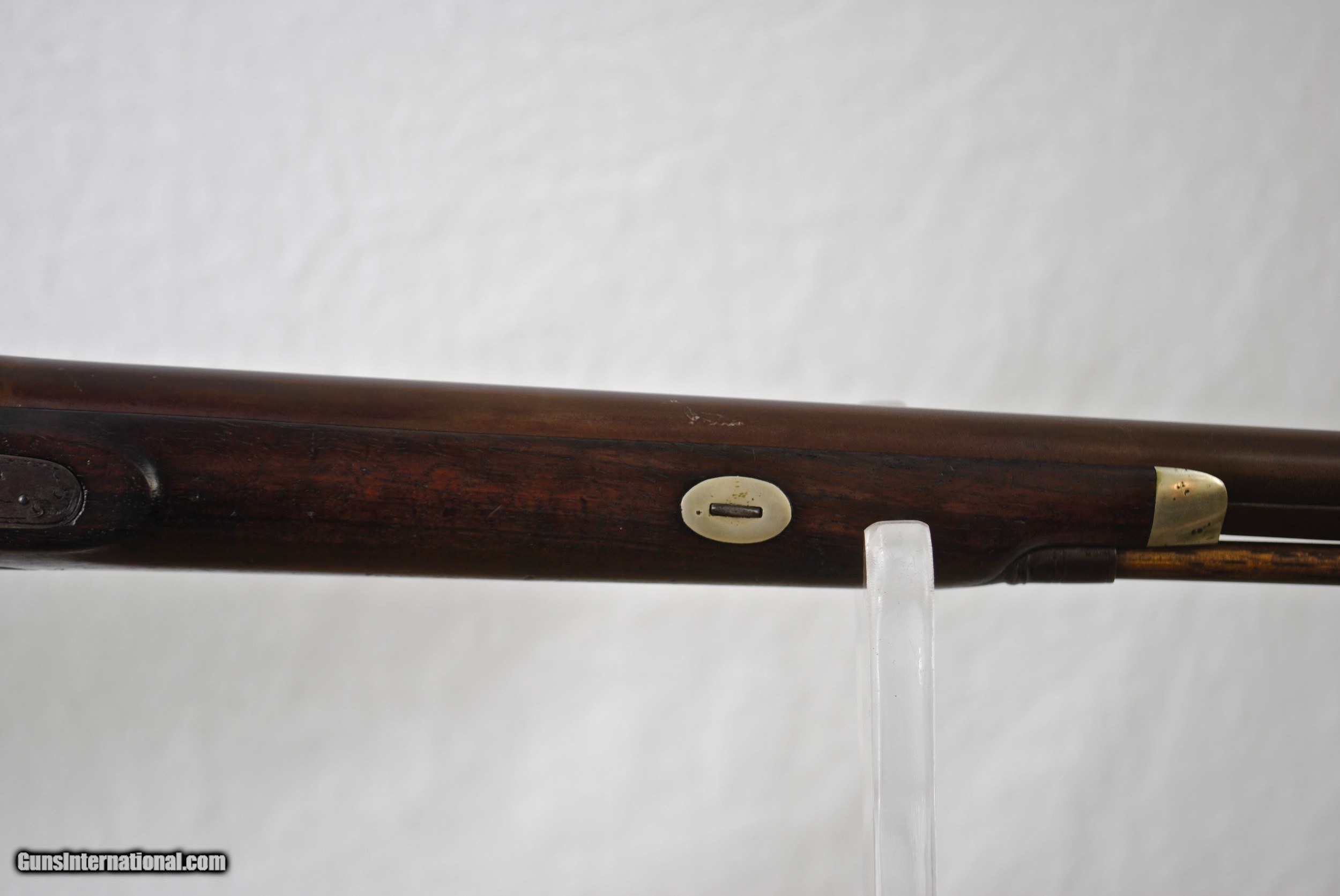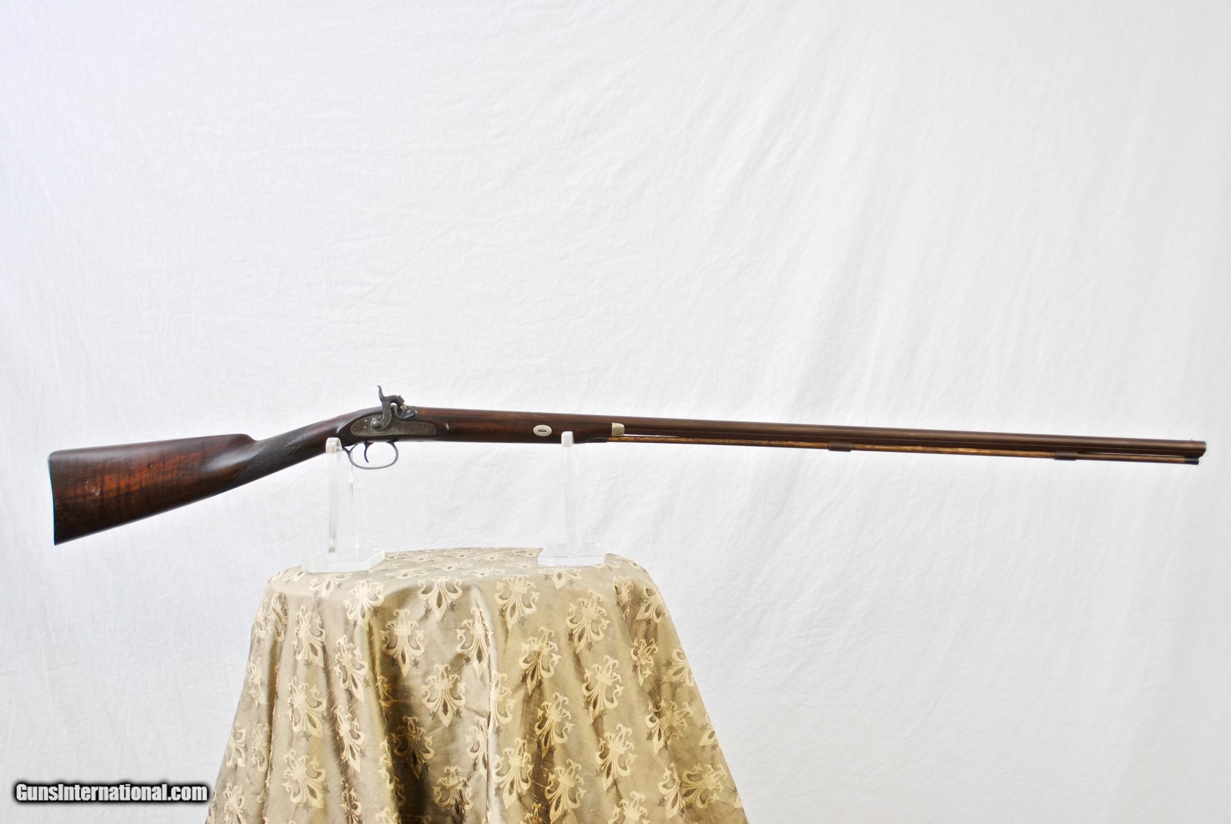 Description: Here is a John Krider of Philadephia Percussion Fowler with 37 1/2" Barrel. John Krider was well known quality gunmaker in Philadelphia in the time period of 1826 to 1876. Some of his guns at have sold for over $20,000! This is a smooth bore fowler with an overall length of 53". Excellent bore measures 49/1000. Bar action sidelock with half and full cock. Fully functional. Appears to be made of completely USA parts as there were no European proof marks found. Weight of gun is an amazing 3 LBS 15 OZ. Stock LOP is 14 5/16". As an antique this gun can be sent directly as local law allows (No NJ or NYC). Shipping is $60 and will be sent in a Plano Style hard case. For inquiries please call Guy - 407-721-3748 SOLD Antique: Yes |