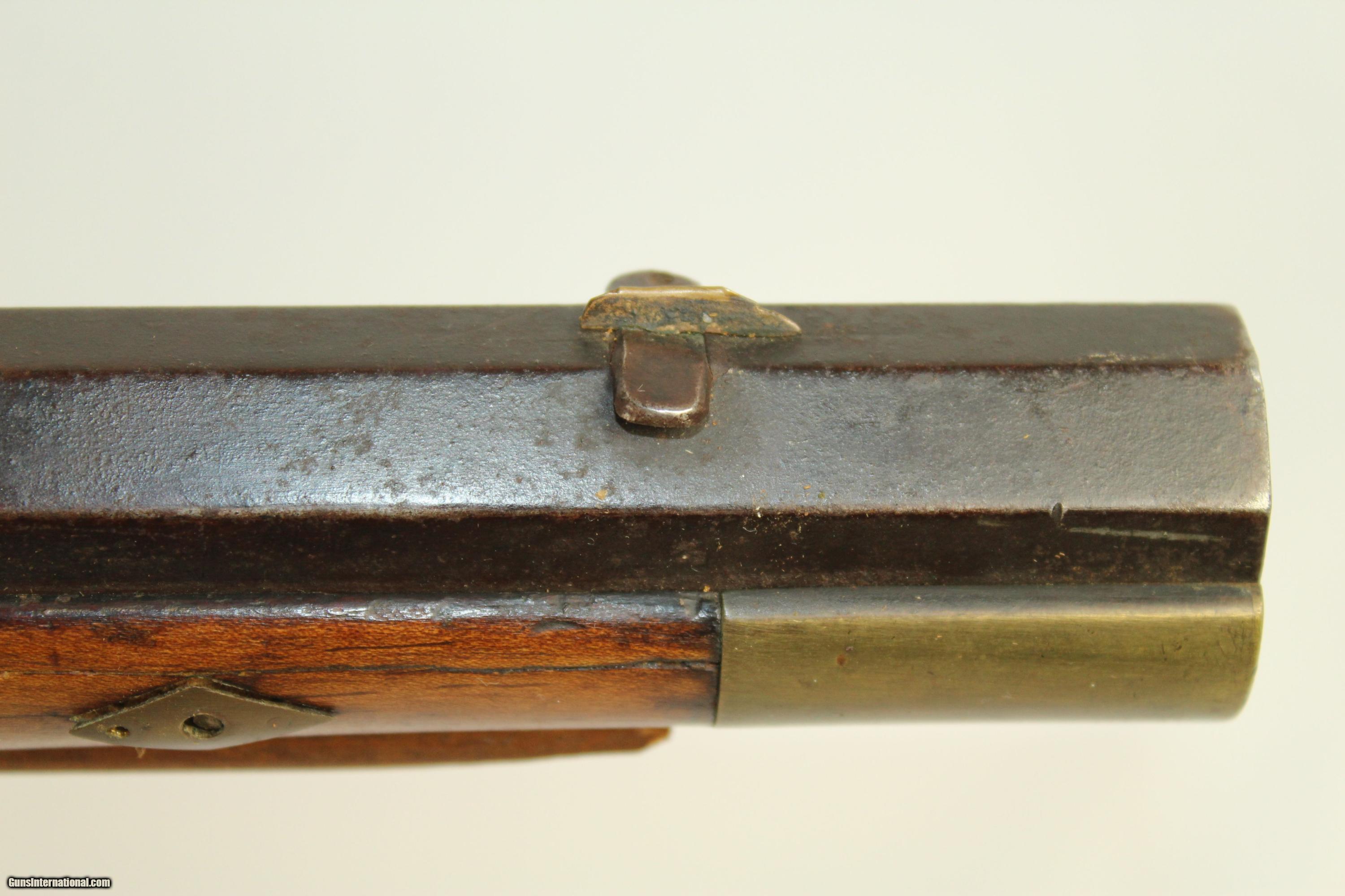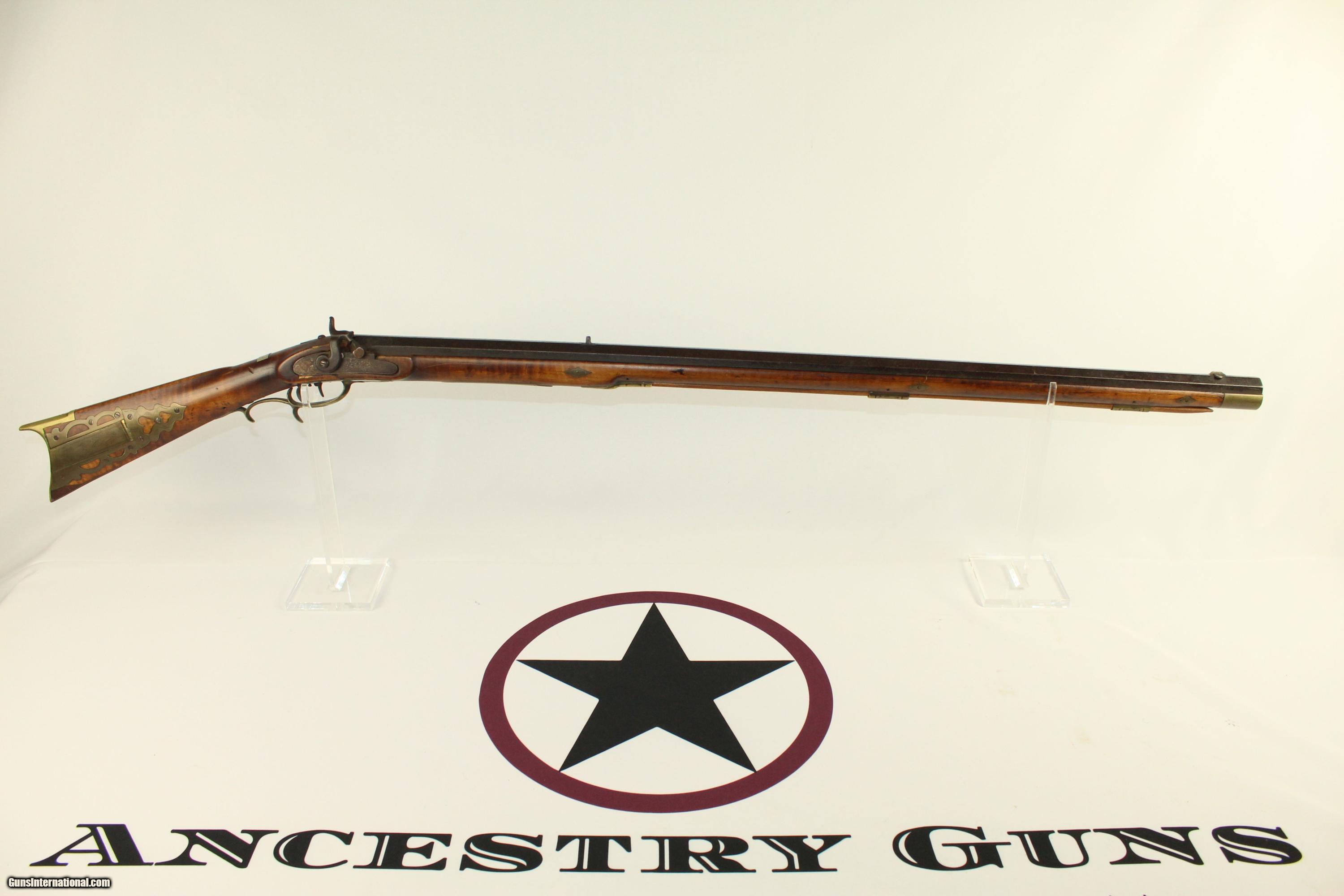 Description: Antique “LITTLE” Marked PENNSYLVANIA Long Rifle With Heart Shapes in the Brass Patch Box Here we present an antique Pennsylvania Full-Stock Long Rifle, made circa 1840. The American Longrifle, more commonly, but less correctly, known as the 'Kentucky rifle', was described by Captain John G. W. Dillin in the dedication to his seminal 1924 book, The Kentucky Rifle: “From a flat bar of soft iron, hand forged into a gun barrel; laboriously bored and rifled with crude tools; fitted with a stock hewn from a maple tree in the neighboring forest; and supplied with a lock hammered to shape on the anvil; an unknown smith, in a shop long since silent, fashioned a rifle which changed the whole course of world history; made possible the settlement of a continent; and ultimately freed our country of foreign domination. Light in weight; graceful in line; economical in consumption of powder and lead; fatally precise; distinctly American; it sprang into immediate popularity; and for a hundred years was a model often slightly varied but never radically changed.” This .45 caliber rifle has a long and heavy barrel, made by James and Daniel Little. Their mark “J&D Little” is found on the underside of the barrel. These brothers were based in Pittsburgh, Pennsylvania, and made rifles and gun making components. This rifle features double set triggers and a very nice brass patch box with a heart motif. The rest of the hardware is also of brass. The stock is striped maple, and the left side of the stock is adorned with two decorative placards. The overall condition is good. The iron parts are dark with age. The marking under the barrel is clear and legible. The maple stock features an old crack that has been bolstered with brass straps. The bore is well-rifled. The action is functional, though there is no half-cock. Own the original! This is a legitimate antique and not a reproduction. Barrel is 36-5/8 inches in length. Caliber: .45 Overall condition as seen in photos. Very Fast. Very Safe. FREE SHIPPING WORLDWIDE. Delivered directly to your door by express mail! Guaranteed AUTHENTIC & Includes CERTIFICATE OF AUTHENTICITY. ancestryguns $1500 #10407 SOLD Antique: Yes |