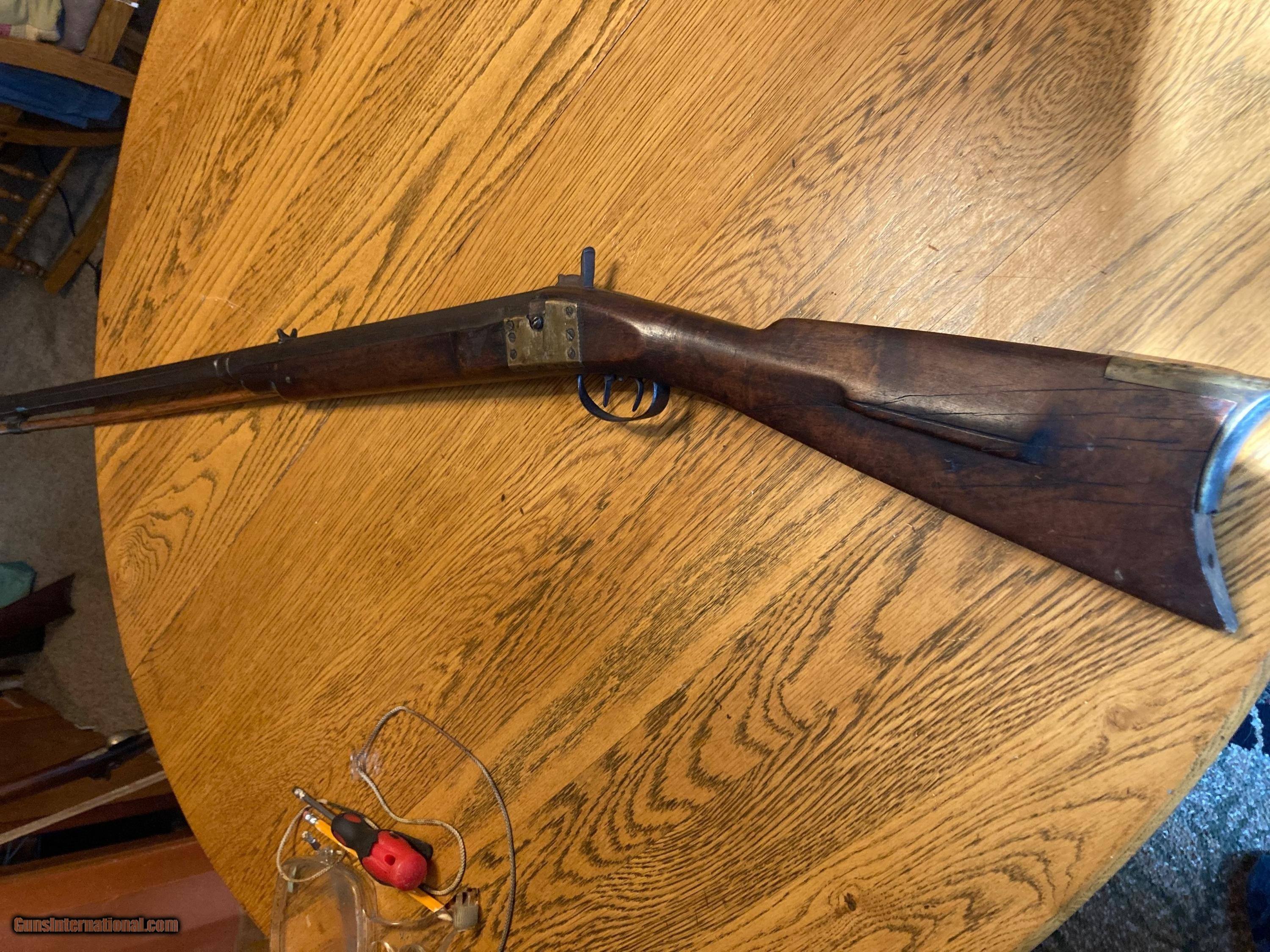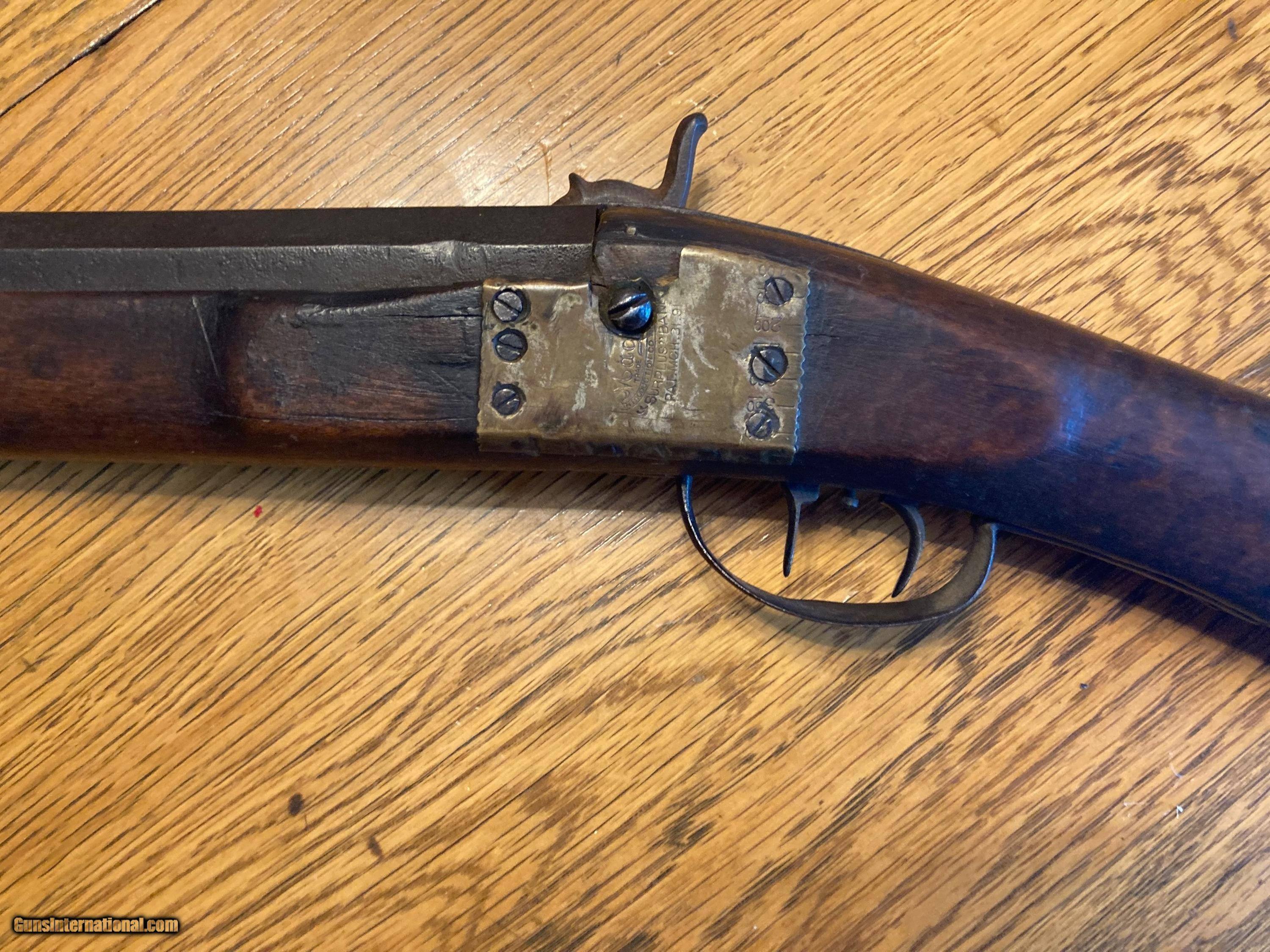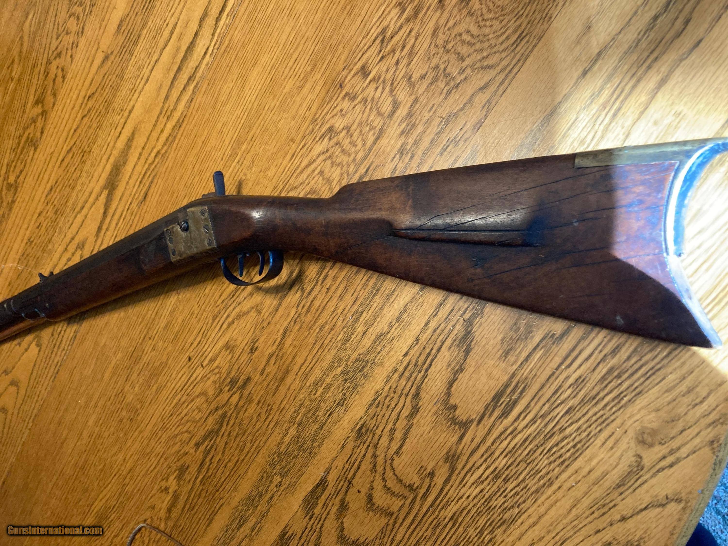 Description: Antique circa 1850 large bore (approximately 58 caliber) Plains rifle. This large bore plains rifle no doubt was made to go west to shoot Buffalo and other large game. The 36 inch Stout octagon barrel smooth bore barrel has both front and rear sights is dark brown with light pitting. The functioning lock is Marked Parker and has the set triggers. The brass but plate is broke and missing the bottom piece. The dark wood stock is solid but has nummerous age drying cracks also a crack in front of the lock which has been glued as well as a brass sheet repair on the left side near the lock screws. SOLD Antique: Yes |