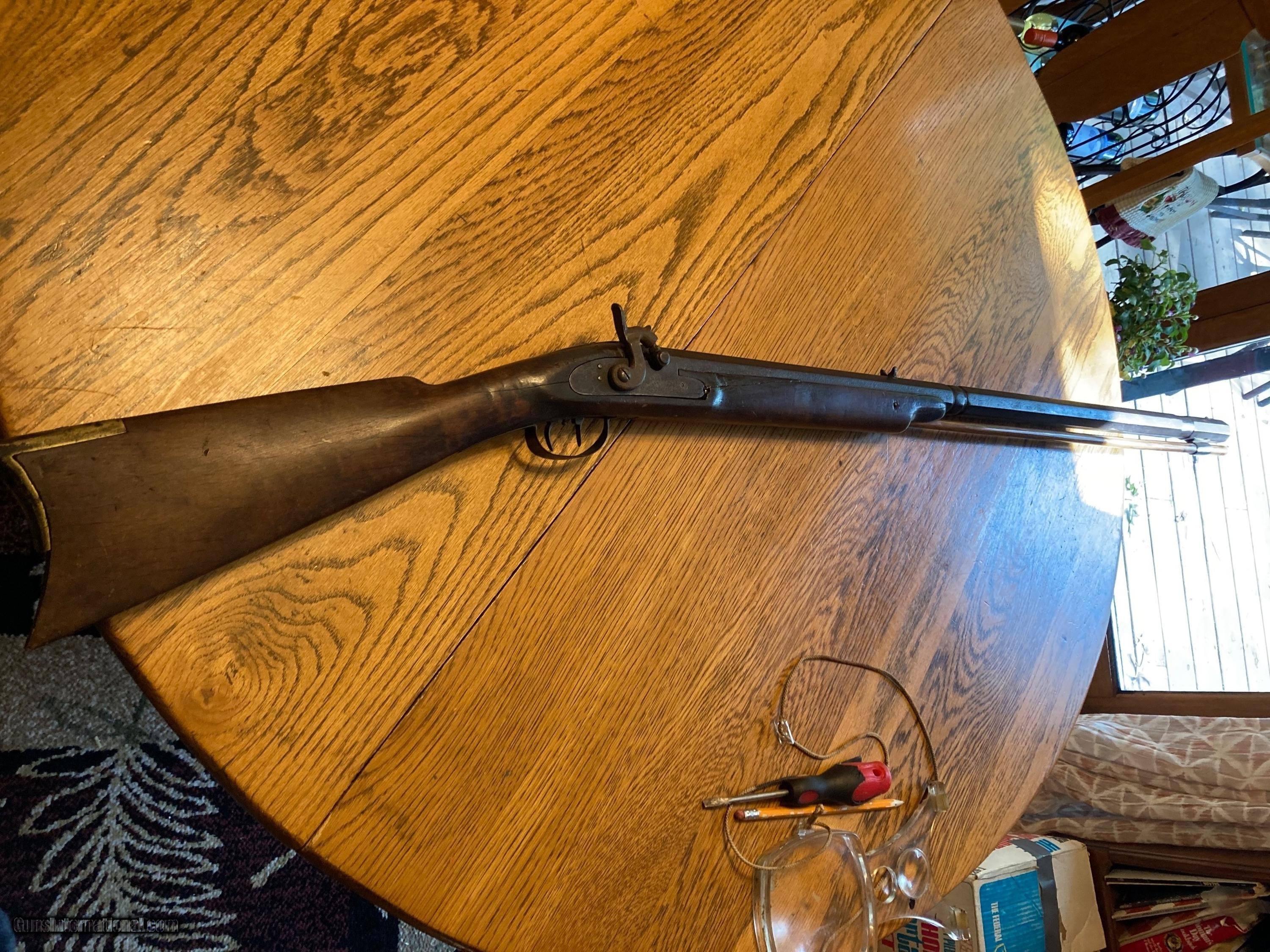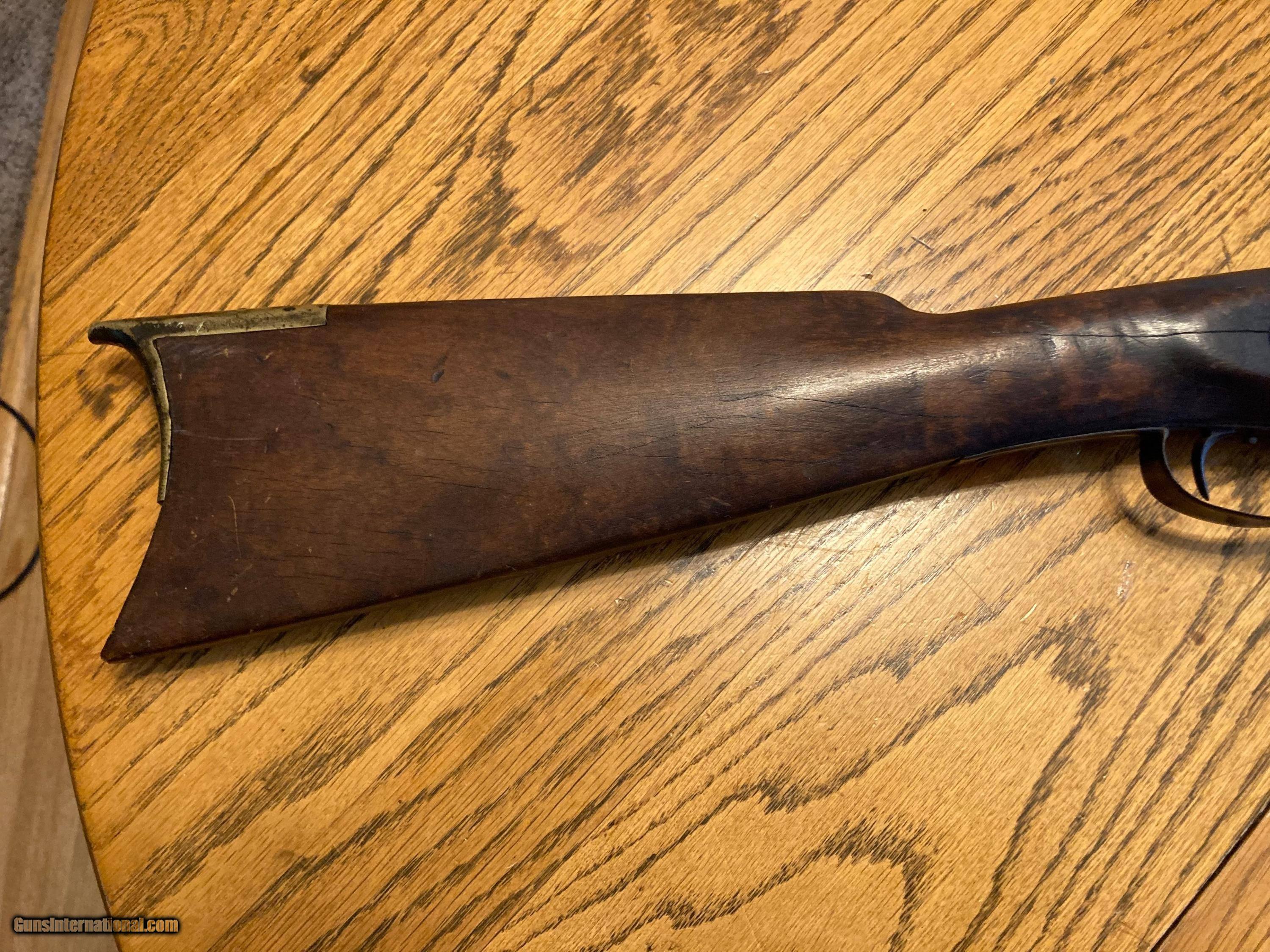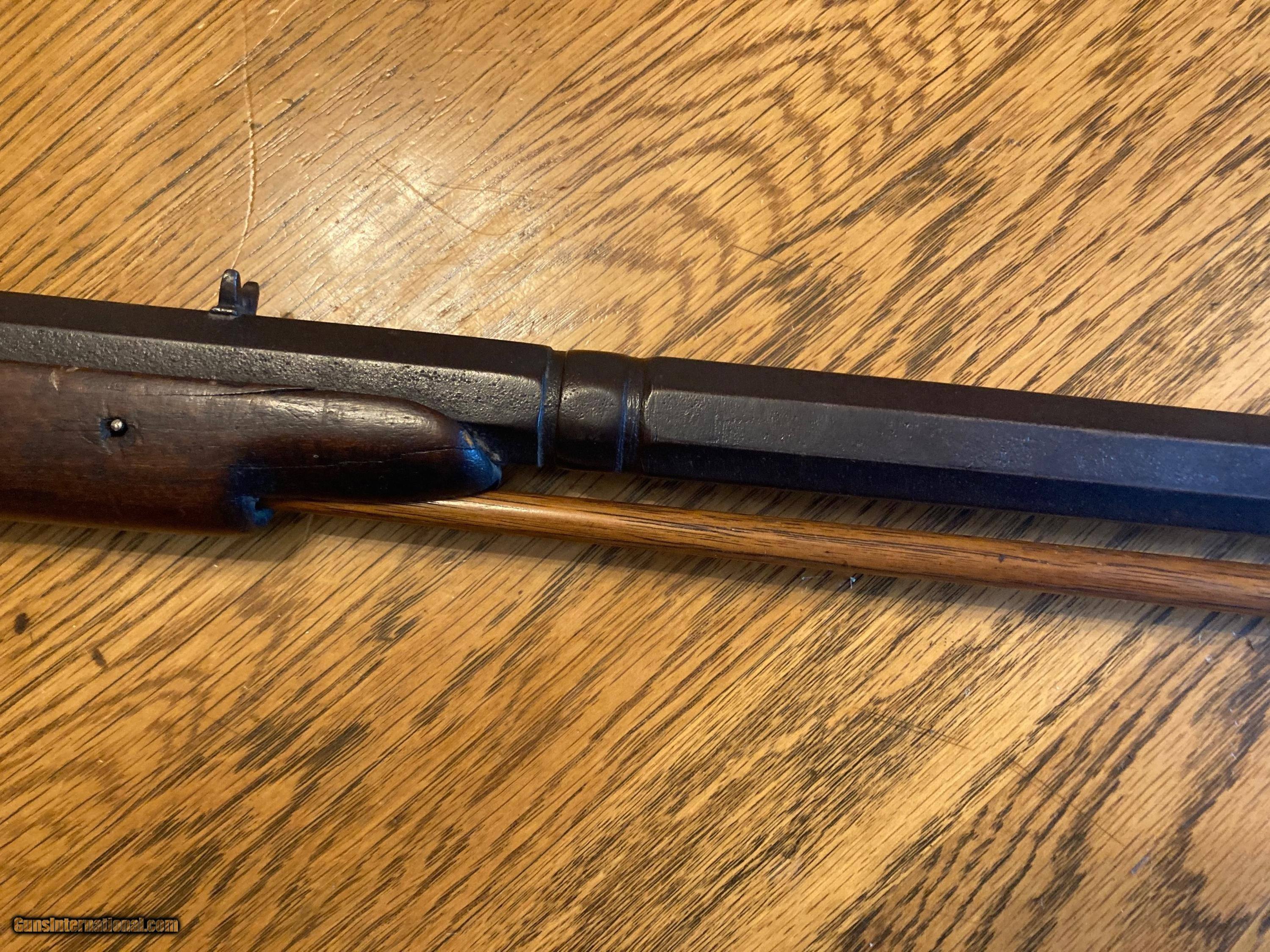 Description: Antique circa 1850 large bore (approximately 58 caliber) Plains rifle. This large bore plains rifle no doubt was made to go west to shoot Buffalo and other large game. The 36 inch Stout octagon barrel smooth bore barrel has both front and rear sights is dark brown with light pitting. The functioning lock is Marked Parker and has the set triggers. The brass but plate is broke and missing the bottom piece. The dark wood stock is solid but has nummerous age drying cracks also a crack in front of the lock which has been glued as well as a brass sheet repair on the left side near the lock screws. SOLD Antique: Yes |