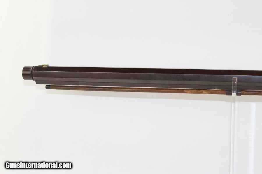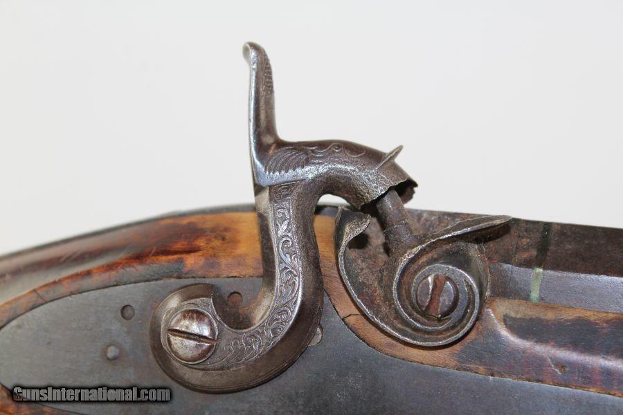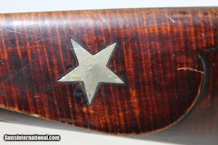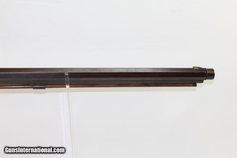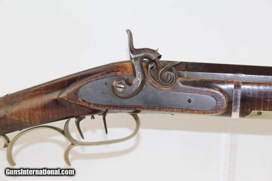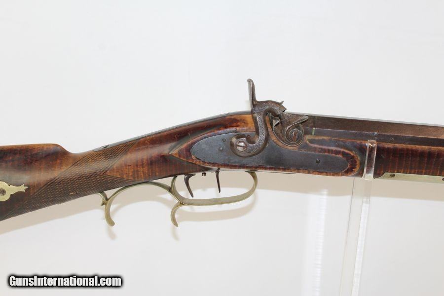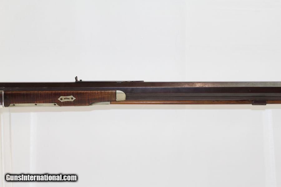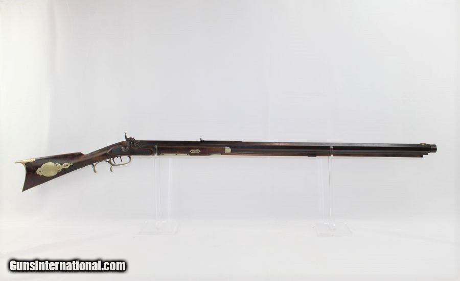 Description: Antique PITTSBURGH Bown ENTERPRISE GUN WORKS Rifle PENNSYLVANIA Long Rifle with “KILL DEER”! Here we present an antique Enterprise Gun Works Pennsylvania Half-Stock Long Rifle, made circa the 1850s. Enterprise Gun Works (1848-1883) offered one of the finest 19th century ranges of firearms and sporting goods available from 136-138 Wood Street in Pittsburgh, Pennsylvania. Enterprise was founded by James Bown and a partner surnamed Tetley. Bown became the sole proprietor of the business in 1862, during the war. Bown was an English immigrant who was only 25 when he started his business. His son James eventually joined him in the partnership. Their trademark was “Kill Deer”, a stag facing left with their company name angling above the creature, this almost certainly a reference to Natty Bumppo’s rifle’s name in the Letherstocking Tales (which included The Last of the Mohicans) by James Fenimore Cooper in the 1820s. The Bowns’ successors had this to say in an advertisement in 1883: “The only manufacturers of the CELEBRATED KENTUCKY RIFLES, which name was adopted by the senior member of this firm in 1848; ... all our Rifles have our name stamped on each barrel, and THIS STAMP.” This rifle features German silver hardware to include a patchbox, a star and a stag emblem. It is equipped with double set triggers and a .38 caliber fully octagonal barrel with a turned down muzzle. Also included are an original powder horn and bullet mold. The overall condition is very good. The metal retains its smooth brown finish. The stock is in very good shape. The bore is clean with sharp rifling. The action is excellent. Own the original! This is a legitimate antique and not a reproduction. Barrel is 36 inch octagon. Caliber: .38 Percussion Overall condition as seen in photos. Very Fast. Very Safe. FREE SHIPPING WORLDWIDE. Delivered directly to your door by express mail! Guaranteed AUTHENTIC & Includes CERTIFICATE OF AUTHENTICITY. ancestryguns $1625 #8252 SOLD Antique: Yes |