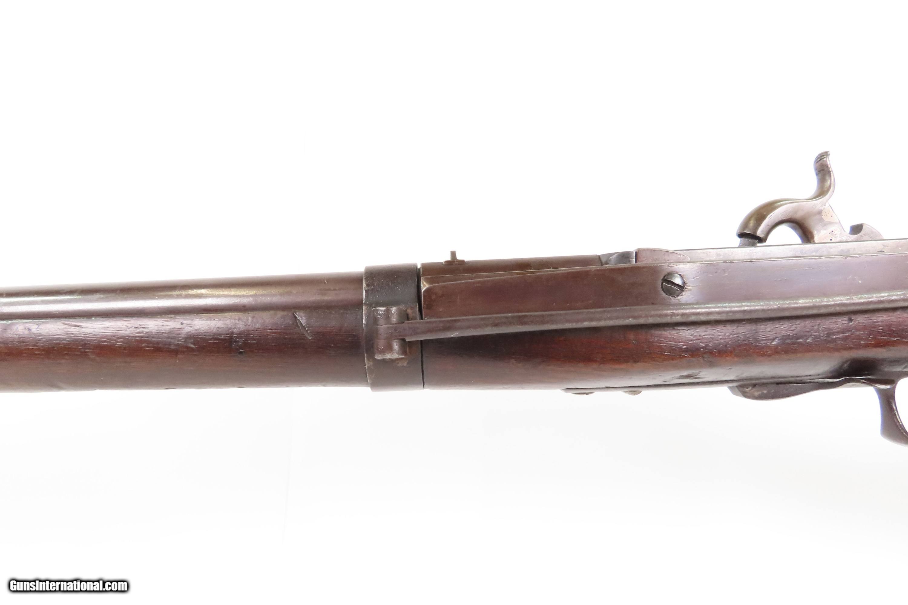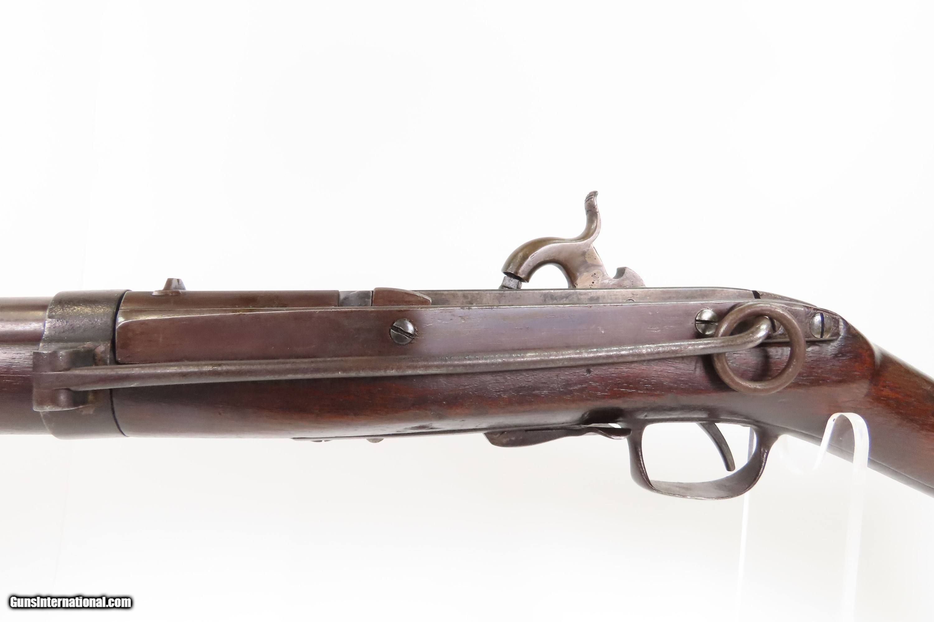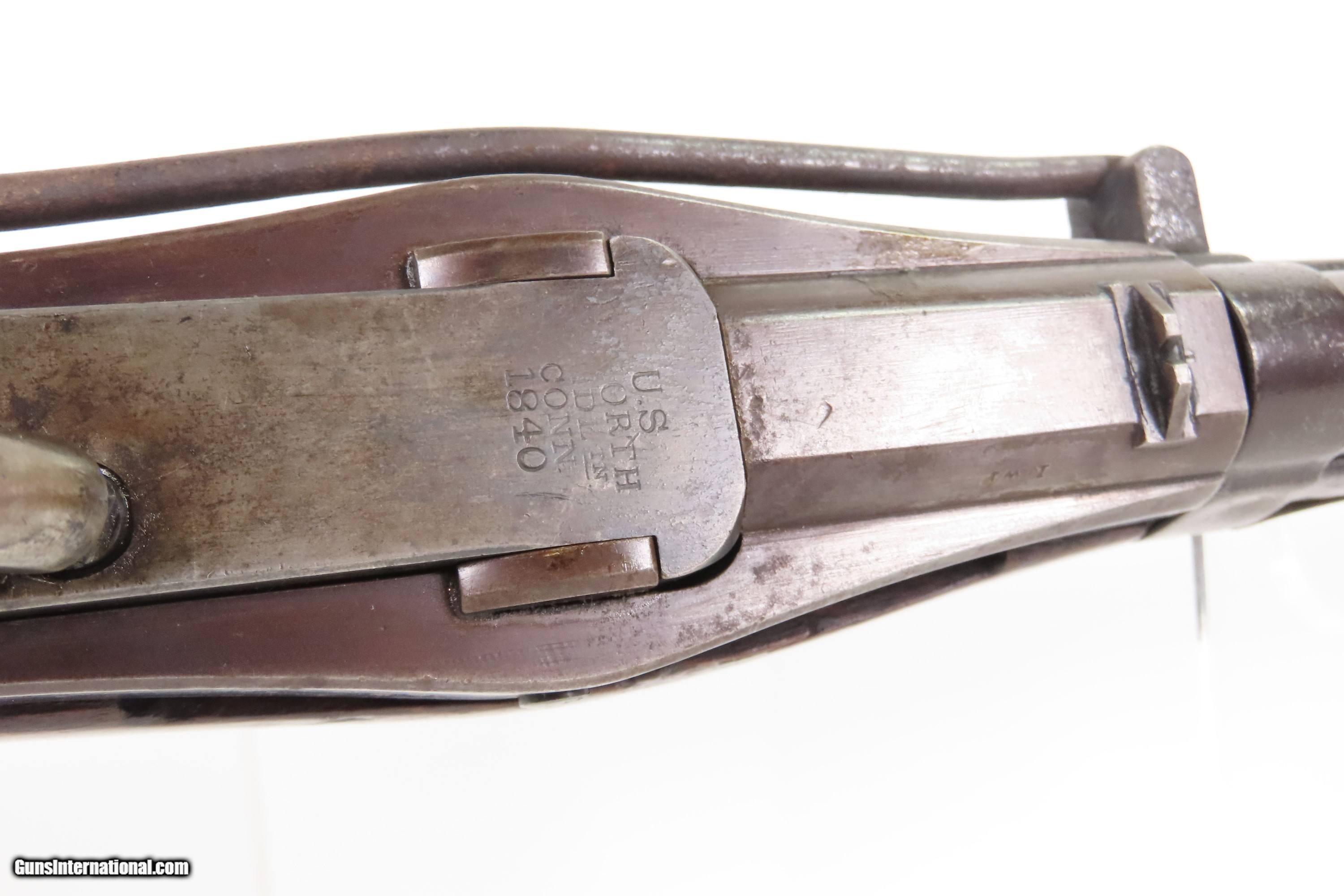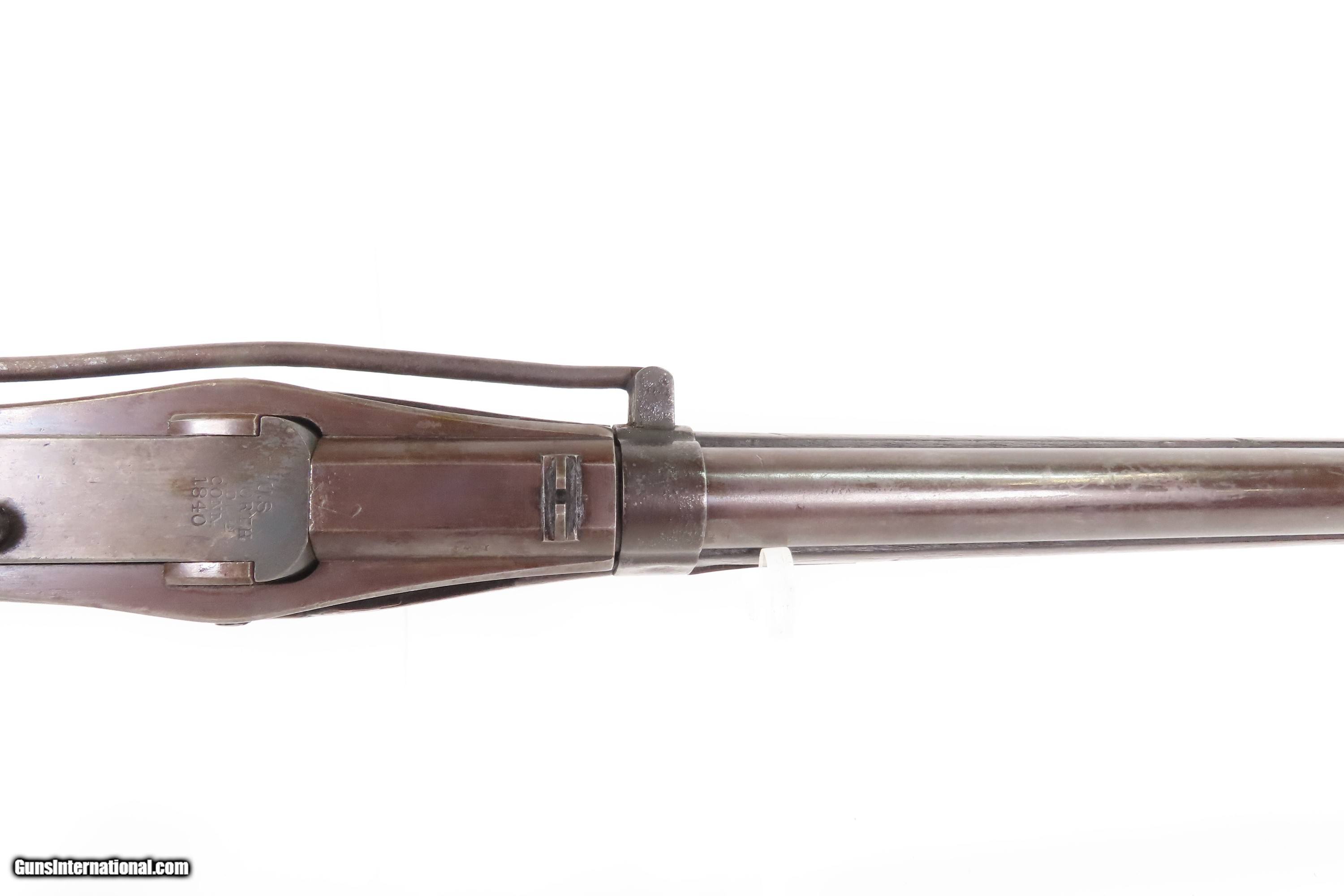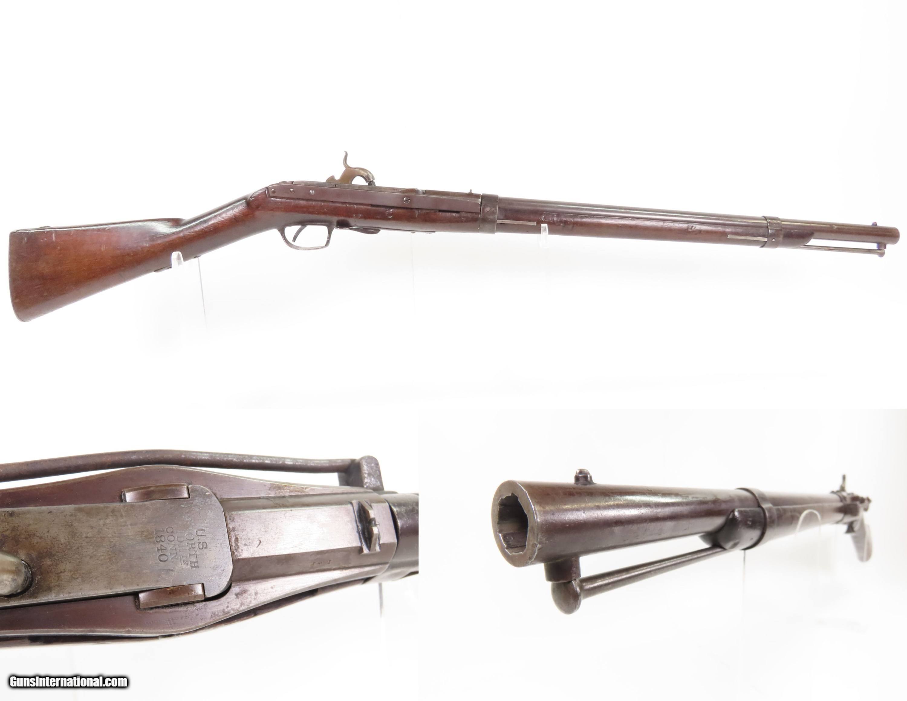 Description: Antique SIMEON NORTH U.S. Model 1840 HALL Breech Loading CAVALRY CARBINE 1 of 6,001 Scarce RIFLED Type II “FISHTAIL” Here Ancestry Guns presents an antique Scarce Rifled Simeon North Contract U.S. Model 1840 Type II “Fishtail” Hall Breech Loading Percussion Saddle Ring made in Middletown, Connecticut during its production run between 1840 and 1843. A native of Berlin, Connecticut, Simeon North was one of the most influential arms makers of the early republic beginning with manufacturing the first U.S. martial pistols in 1799 (the North-& Cheney Model 1799s) and finally ending with the Model 1843 Hall carbines right up to his death in 1852. He was influential in developing the first milling machines and also helped establish truly interchangeable parts on U.S. martial arms. He manufactured 6,501 of these Model 1840 Hall carbines in 1840 through 1843. 6,001 of them including this one were the standard Type II with the distinctive "fishtail" shaped breech lever. The vast majority of these were smoothbore, and some were later bored out to larger calibers and rifled, as is this example. North was better known for the rifles that he produced. In 1823, he won a government contract in which he supplied the army with standard breech-loading rifles. These initially were flintlock arms, but in 1843 North submitted a new design for governmental approval. His revamped model was christened "North's Improvement" for its improved method of working the breech mechanism. Until then, breech-loading rifles were flawed with loose seams between the chamber and the barrel, causing flames to spurt out the back and losing some velocity because of this gas leakage. North's design made the breech mechanism fit more closely to the barrel, thus reducing the loss of velocity. His adaptation of the Hall percussion breechloader was a success with the army, and he continued filling orders until his death in 1852. The overall condition is good. Deep brown original patina. The stock is fine showing little wear. The action is excellent. The bore is bright and has strong rifling. Markings are worn but remain legible. “R.A.P” hand inscribed on the left buttstock. Own the original! This is a legitimate antique and not a reproduction. Barrel is 21 inches. Caliber: .52 Percussion Overall condition as seen in photos. Very Fast. Very Safe. FREE SHIPPING WORLDWIDE. Delivered directly to your door by express mail! Guaranteed AUTHENTIC & Includes CERTIFICATE OF AUTHENTICITY. $6200 #259384 Antique: Yes Price: $6,200.00 Buy Now Pay with