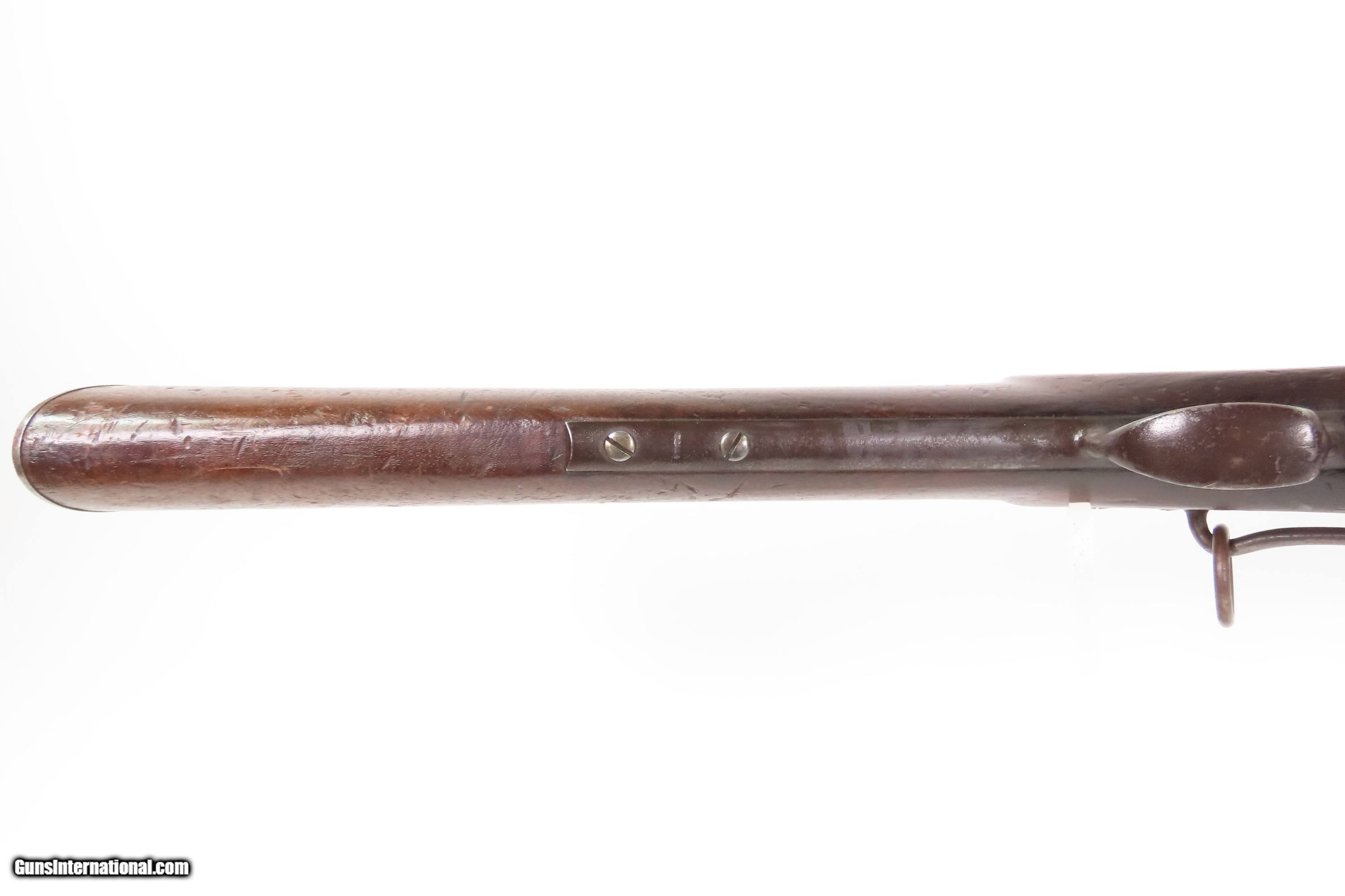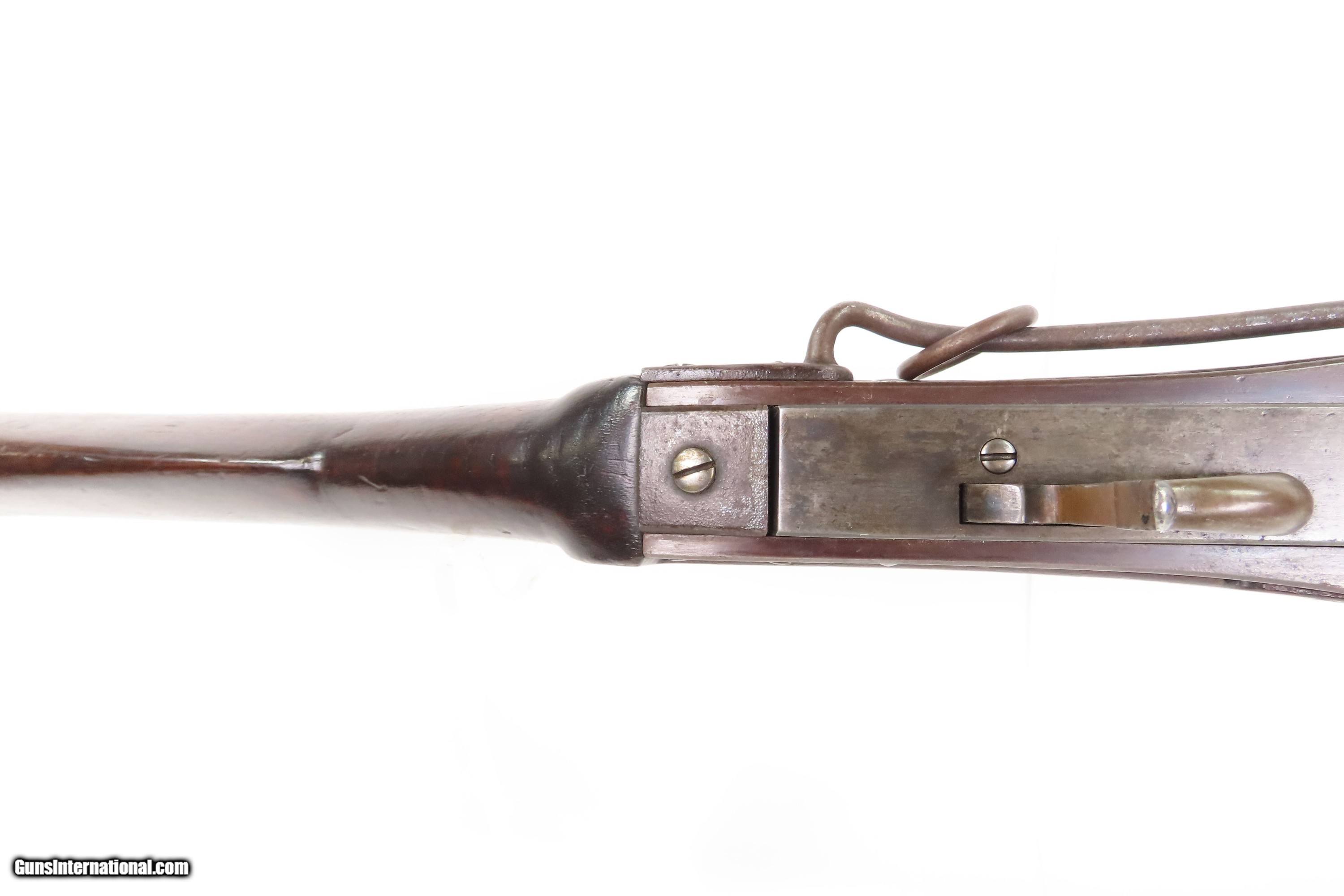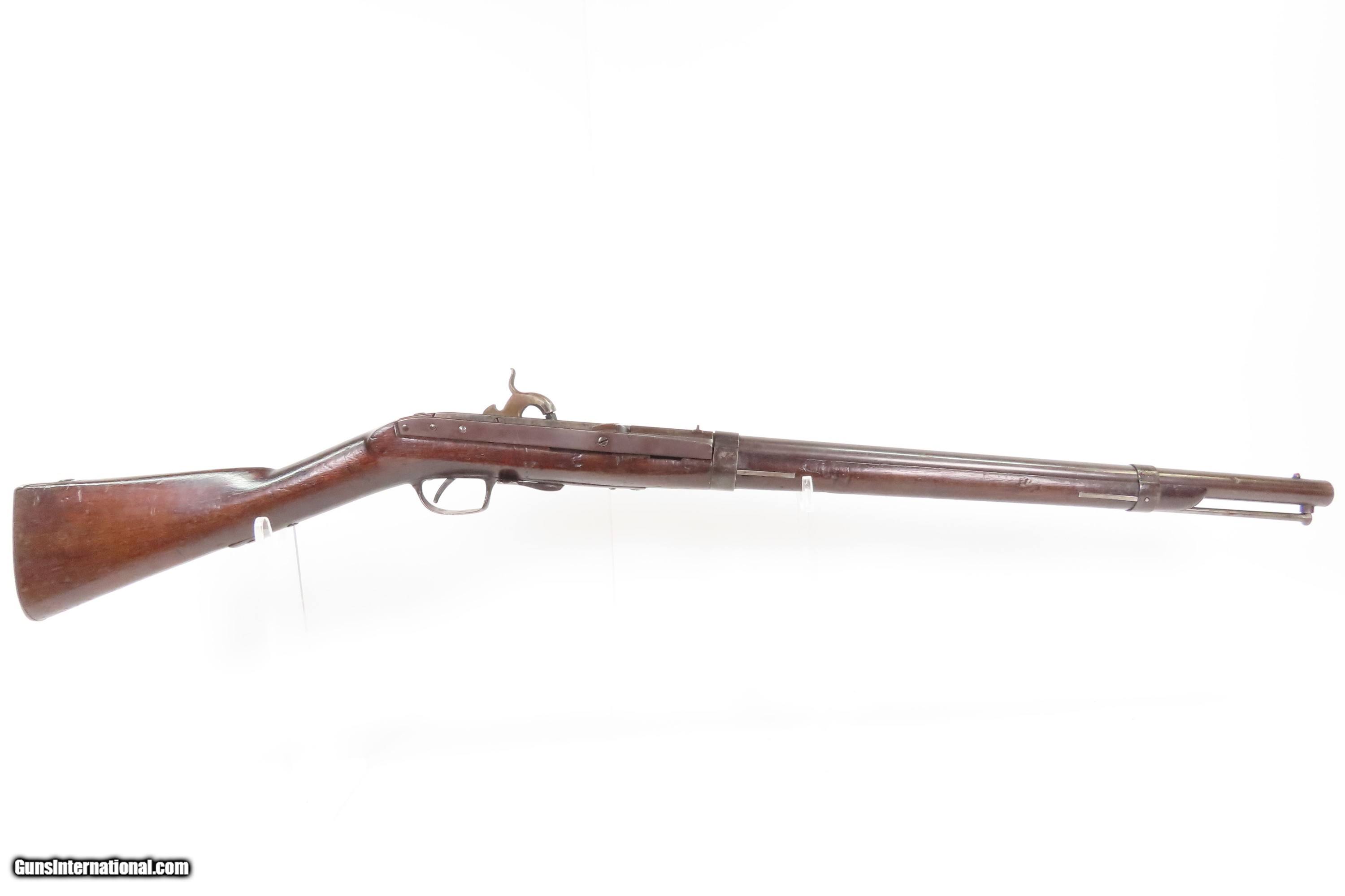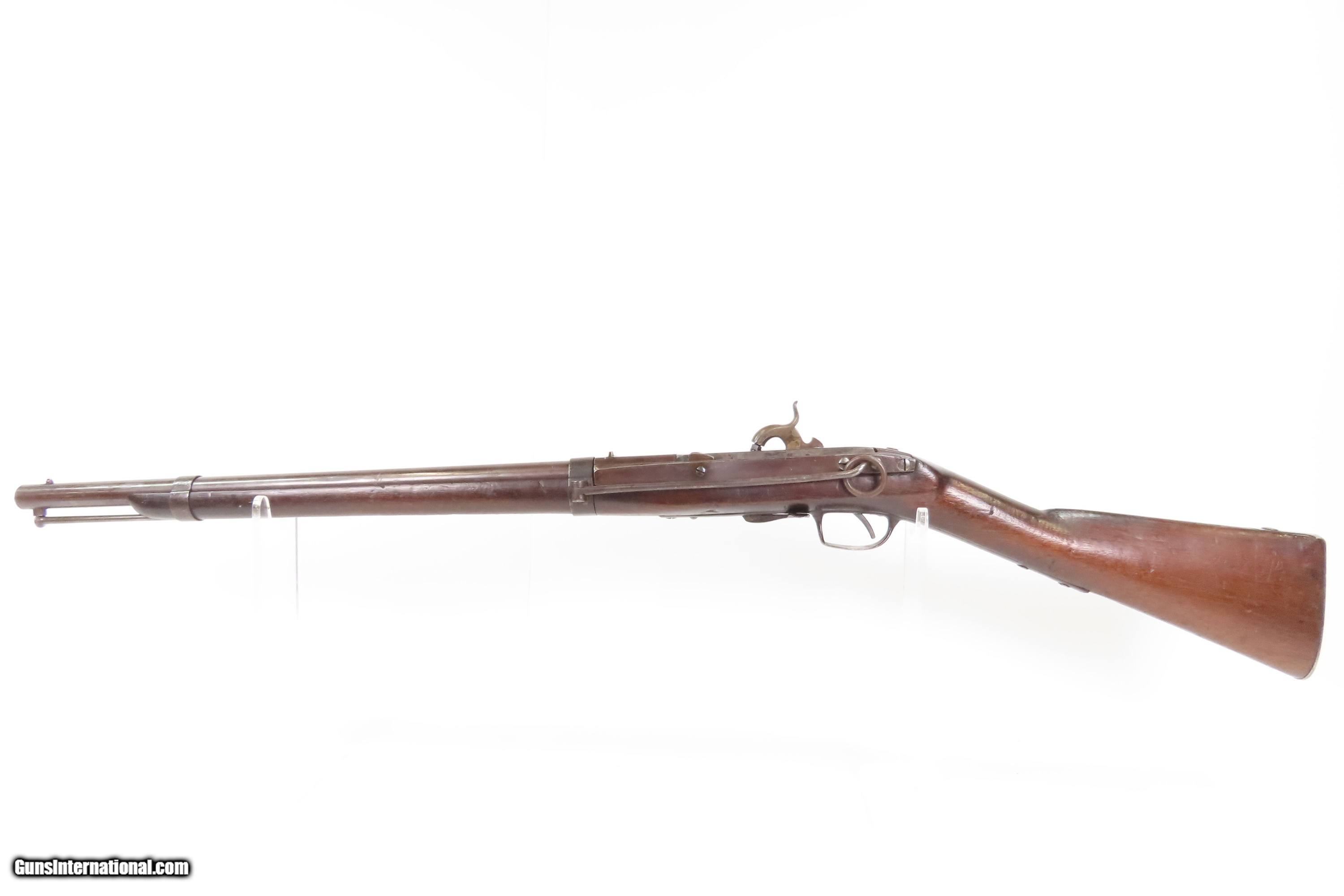 Description: Antique SIMEON NORTH U.S. Model 1840 HALL Breech Loading CAVALRY CARBINE 1 of 6,001 Scarce RIFLED Type II “FISHTAIL” Here Ancestry Guns presents an antique Scarce Rifled Simeon North Contract U.S. Model 1840 Type II “Fishtail” Hall Breech Loading Percussion Saddle Ring made in Middletown, Connecticut during its production run between 1840 and 1843. A native of Berlin, Connecticut, Simeon North was one of the most influential arms makers of the early republic beginning with manufacturing the first U.S. martial pistols in 1799 (the North-& Cheney Model 1799s) and finally ending with the Model 1843 Hall carbines right up to his death in 1852. He was influential in developing the first milling machines and also helped establish truly interchangeable parts on U.S. martial arms. He manufactured 6,501 of these Model 1840 Hall carbines in 1840 through 1843. 6,001 of them including this one were the standard Type II with the distinctive "fishtail" shaped breech lever. The vast majority of these were smoothbore, and some were later bored out to larger calibers and rifled, as is this example. North was better known for the rifles that he produced. In 1823, he won a government contract in which he supplied the army with standard breech-loading rifles. These initially were flintlock arms, but in 1843 North submitted a new design for governmental approval. His revamped model was christened "North's Improvement" for its improved method of working the breech mechanism. Until then, breech-loading rifles were flawed with loose seams between the chamber and the barrel, causing flames to spurt out the back and losing some velocity because of this gas leakage. North's design made the breech mechanism fit more closely to the barrel, thus reducing the loss of velocity. His adaptation of the Hall percussion breechloader was a success with the army, and he continued filling orders until his death in 1852. The overall condition is good. Deep brown original patina. The stock is fine showing little wear. The action is excellent. The bore is bright and has strong rifling. Markings are worn but remain legible. “R.A.P” hand inscribed on the left buttstock. Own the original! This is a legitimate antique and not a reproduction. Barrel is 21 inches. Caliber: .52 Percussion Overall condition as seen in photos. Very Fast. Very Safe. FREE SHIPPING WORLDWIDE. Delivered directly to your door by express mail! Guaranteed AUTHENTIC & Includes CERTIFICATE OF AUTHENTICITY. $6200 #259384 Antique: Yes Price: $6,200.00 Buy Now Pay with