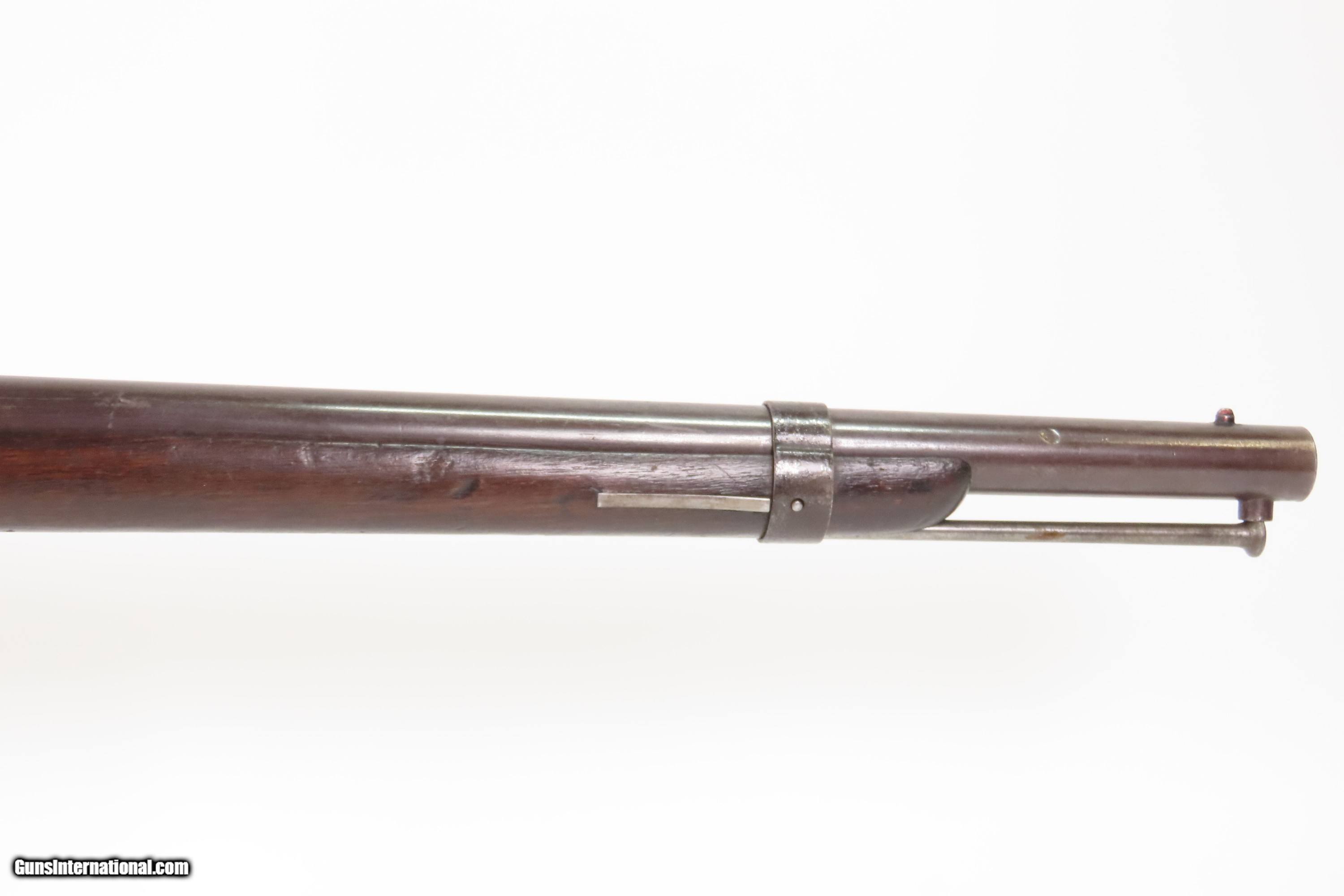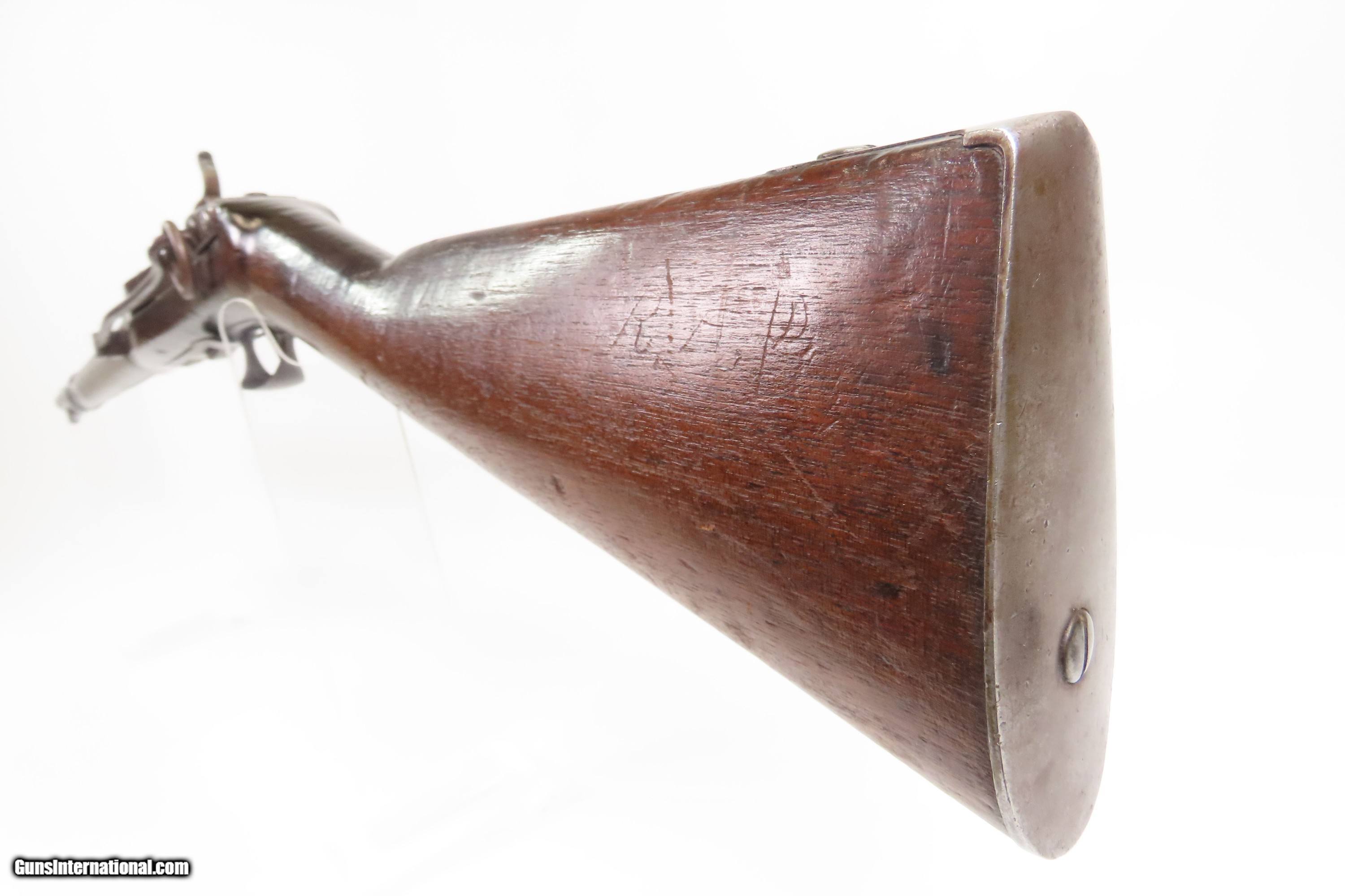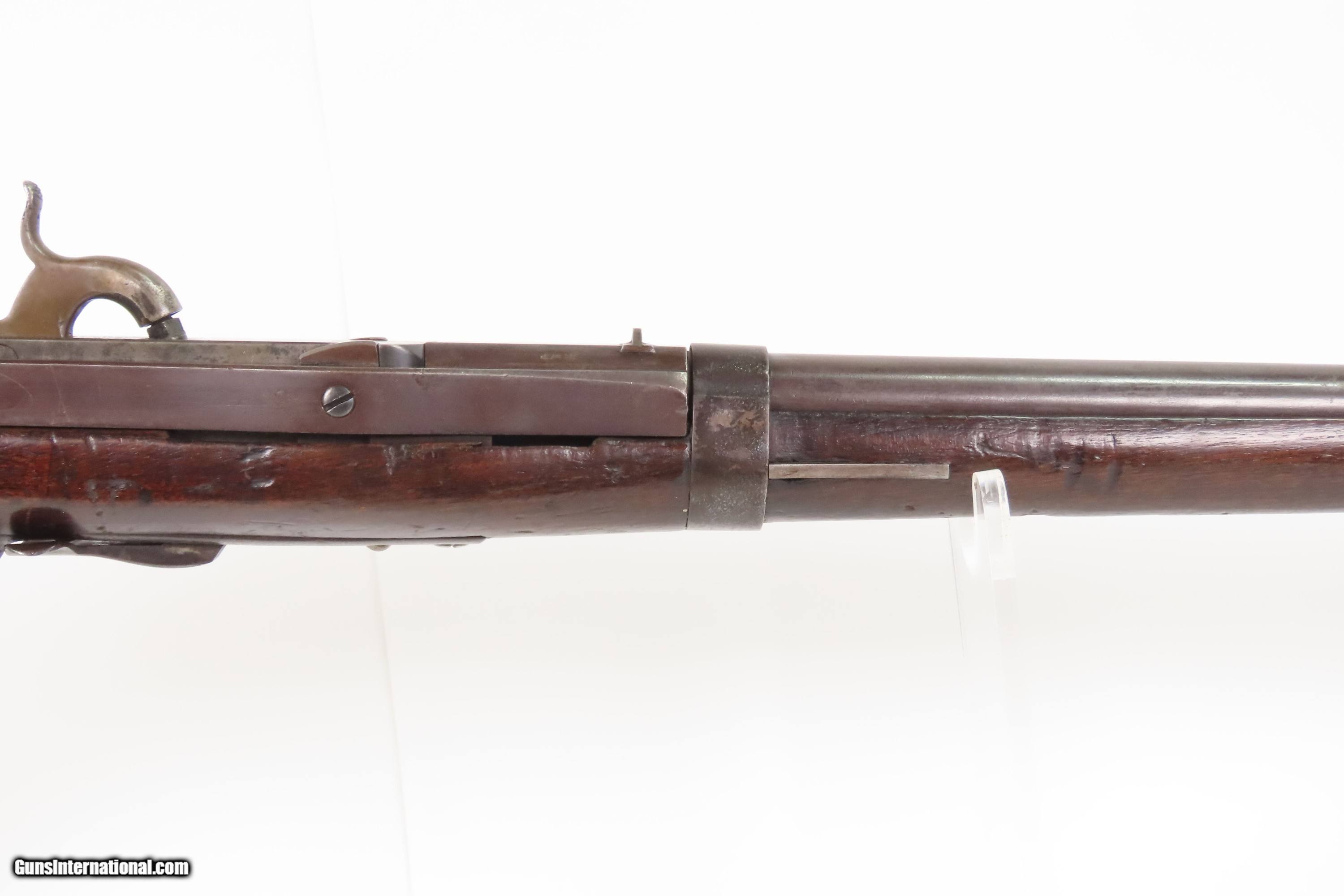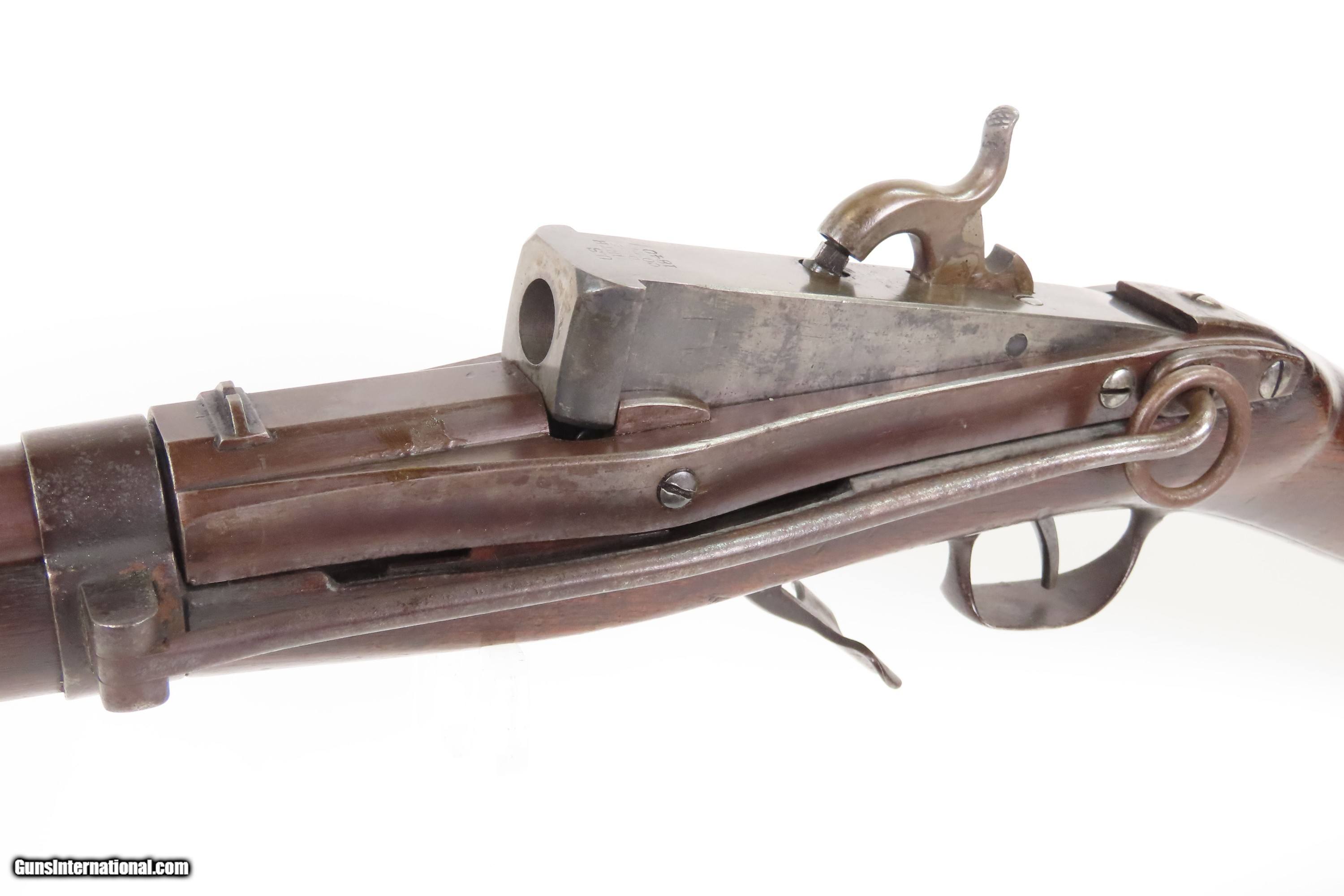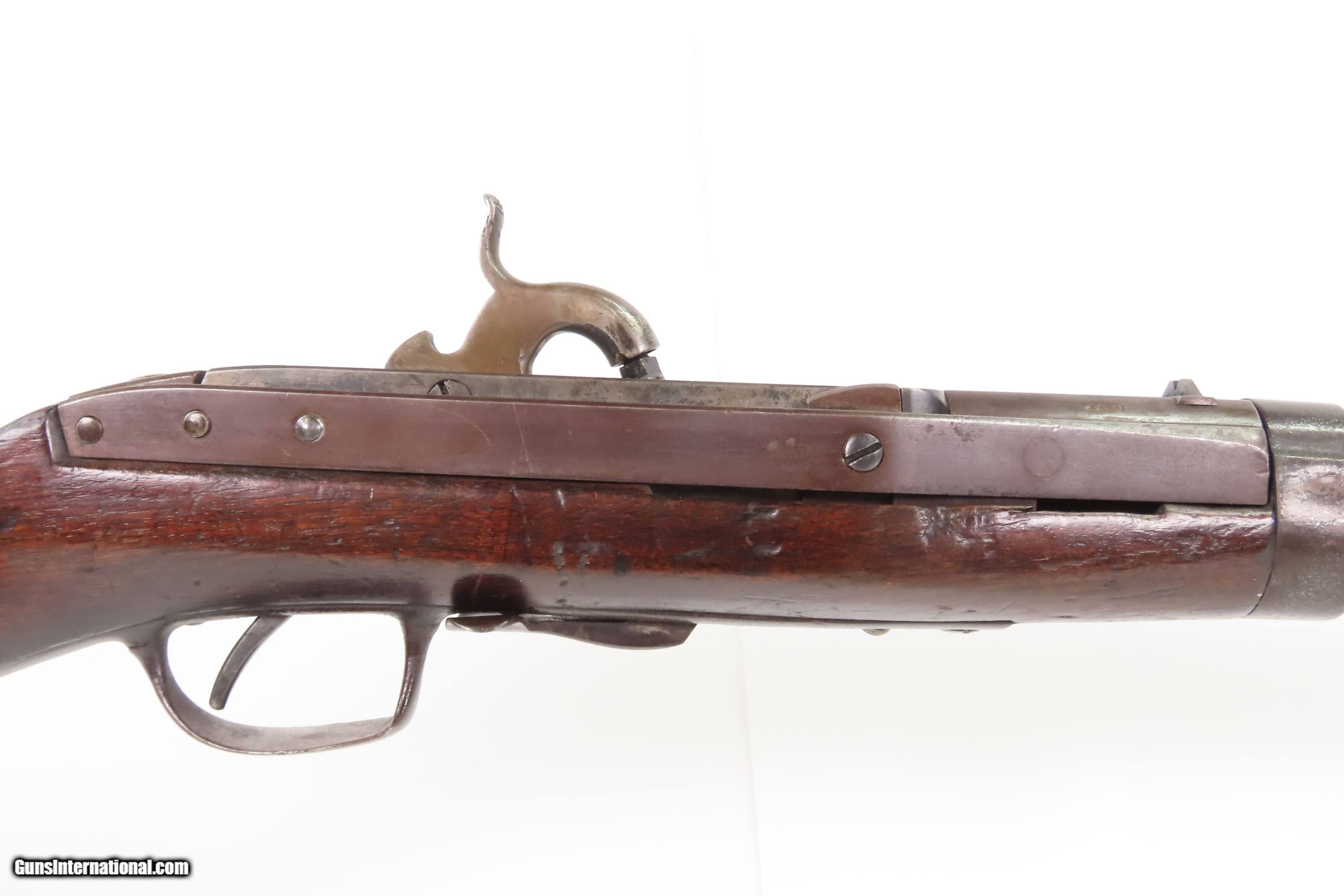 Description: Antique SIMEON NORTH U.S. Model 1840 HALL Breech Loading CAVALRY CARBINE 1 of 6,001 Scarce RIFLED Type II “FISHTAIL” Here Ancestry Guns presents an antique Scarce Rifled Simeon North Contract U.S. Model 1840 Type II “Fishtail” Hall Breech Loading Percussion Saddle Ring made in Middletown, Connecticut during its production run between 1840 and 1843. A native of Berlin, Connecticut, Simeon North was one of the most influential arms makers of the early republic beginning with manufacturing the first U.S. martial pistols in 1799 (the North-& Cheney Model 1799s) and finally ending with the Model 1843 Hall carbines right up to his death in 1852. He was influential in developing the first milling machines and also helped establish truly interchangeable parts on U.S. martial arms. He manufactured 6,501 of these Model 1840 Hall carbines in 1840 through 1843. 6,001 of them including this one were the standard Type II with the distinctive "fishtail" shaped breech lever. The vast majority of these were smoothbore, and some were later bored out to larger calibers and rifled, as is this example. North was better known for the rifles that he produced. In 1823, he won a government contract in which he supplied the army with standard breech-loading rifles. These initially were flintlock arms, but in 1843 North submitted a new design for governmental approval. His revamped model was christened "North's Improvement" for its improved method of working the breech mechanism. Until then, breech-loading rifles were flawed with loose seams between the chamber and the barrel, causing flames to spurt out the back and losing some velocity because of this gas leakage. North's design made the breech mechanism fit more closely to the barrel, thus reducing the loss of velocity. His adaptation of the Hall percussion breechloader was a success with the army, and he continued filling orders until his death in 1852. The overall condition is good. Deep brown original patina. The stock is fine showing little wear. The action is excellent. The bore is bright and has strong rifling. Markings are worn but remain legible. “R.A.P” hand inscribed on the left buttstock. Own the original! This is a legitimate antique and not a reproduction. Barrel is 21 inches. Caliber: .52 Percussion Overall condition as seen in photos. Very Fast. Very Safe. FREE SHIPPING WORLDWIDE. Delivered directly to your door by express mail! Guaranteed AUTHENTIC & Includes CERTIFICATE OF AUTHENTICITY. $6200 #259384 Antique: Yes Price: $6,200.00 Buy Now Pay with