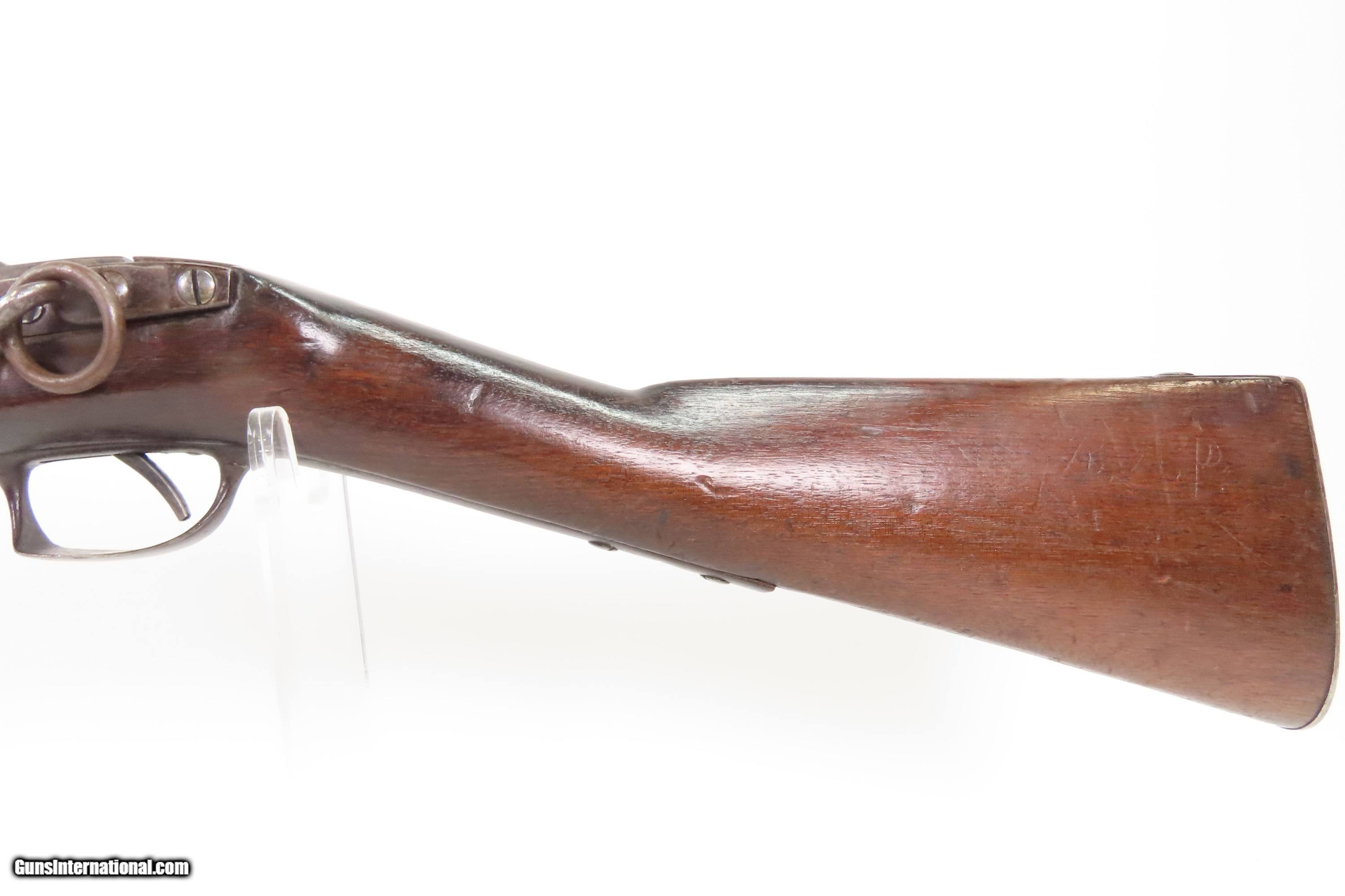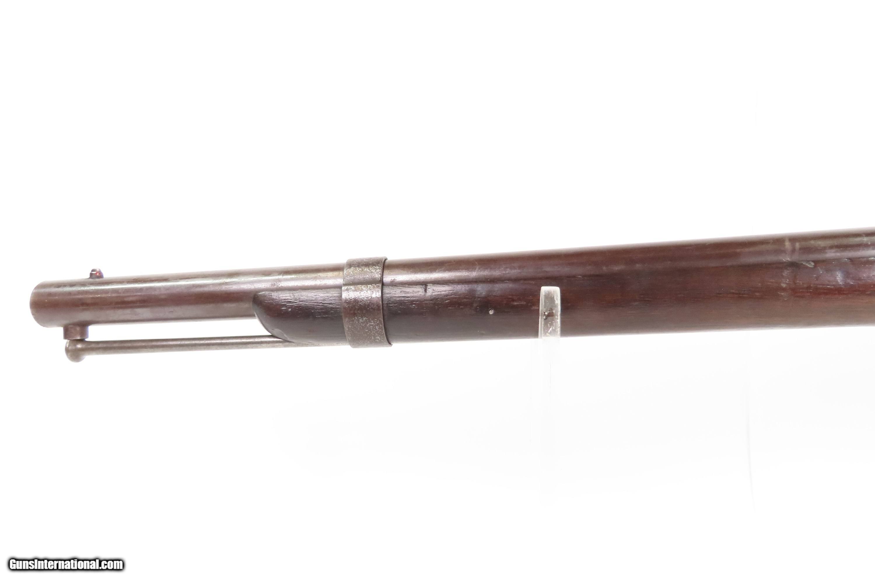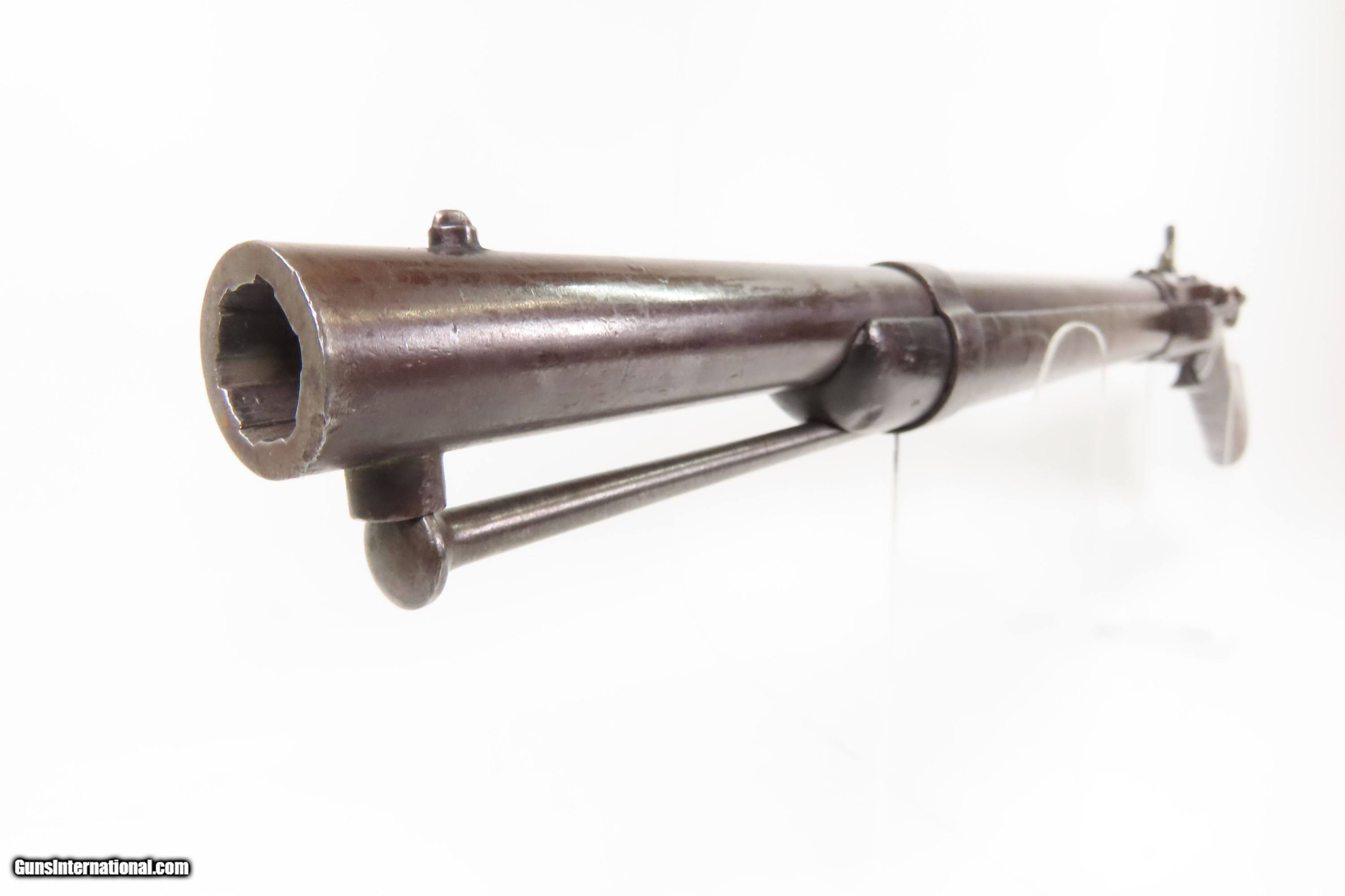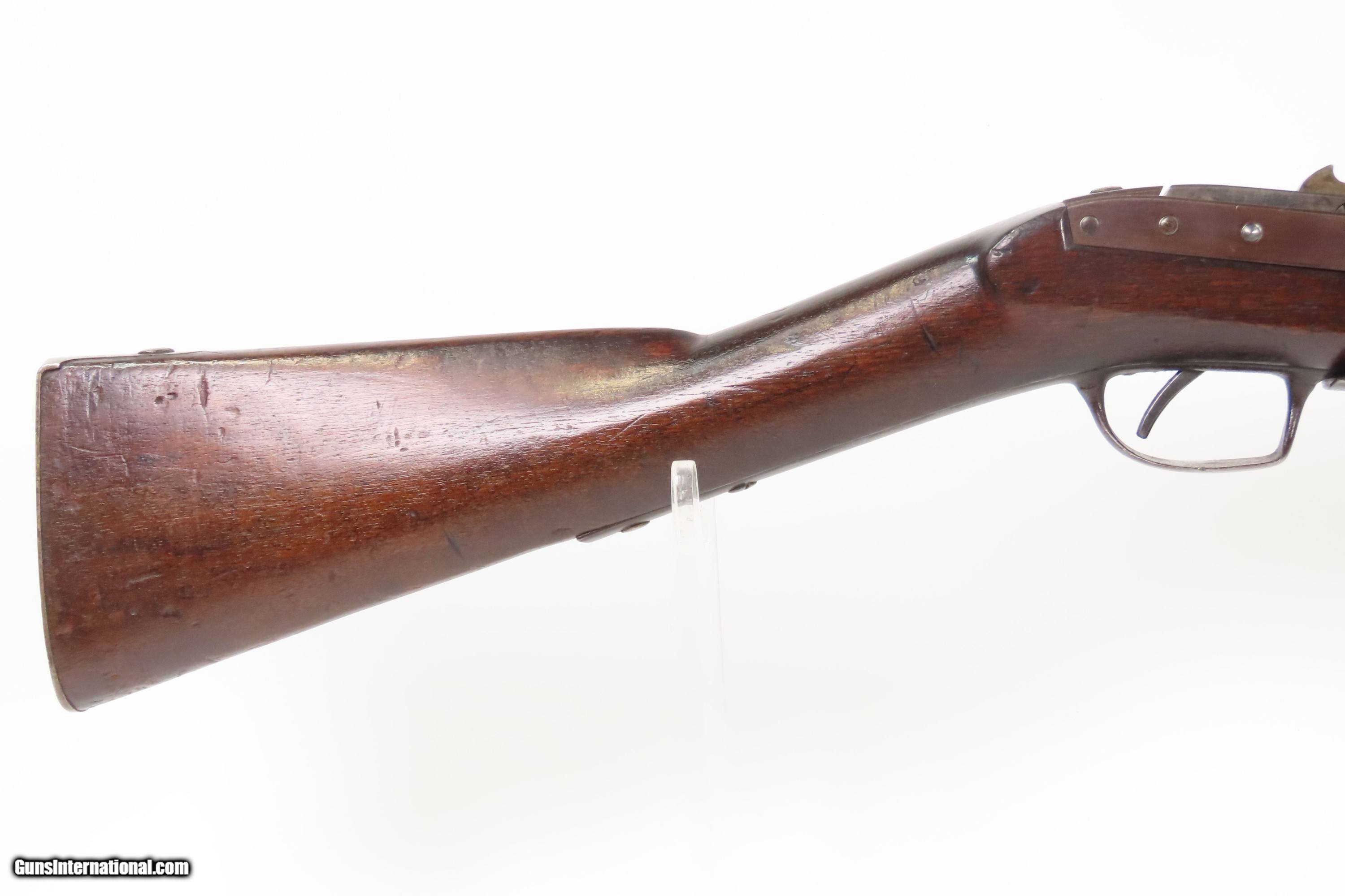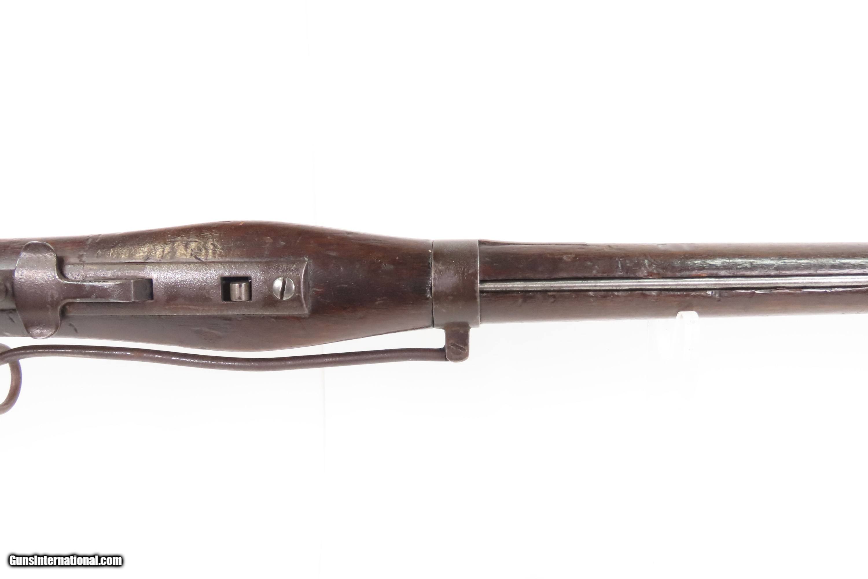 Description: Antique SIMEON NORTH U.S. Model 1840 HALL Breech Loading CAVALRY CARBINE 1 of 6,001 Scarce RIFLED Type II “FISHTAIL” Here Ancestry Guns presents an antique Scarce Rifled Simeon North Contract U.S. Model 1840 Type II “Fishtail” Hall Breech Loading Percussion Saddle Ring made in Middletown, Connecticut during its production run between 1840 and 1843. A native of Berlin, Connecticut, Simeon North was one of the most influential arms makers of the early republic beginning with manufacturing the first U.S. martial pistols in 1799 (the North-& Cheney Model 1799s) and finally ending with the Model 1843 Hall carbines right up to his death in 1852. He was influential in developing the first milling machines and also helped establish truly interchangeable parts on U.S. martial arms. He manufactured 6,501 of these Model 1840 Hall carbines in 1840 through 1843. 6,001 of them including this one were the standard Type II with the distinctive "fishtail" shaped breech lever. The vast majority of these were smoothbore, and some were later bored out to larger calibers and rifled, as is this example. North was better known for the rifles that he produced. In 1823, he won a government contract in which he supplied the army with standard breech-loading rifles. These initially were flintlock arms, but in 1843 North submitted a new design for governmental approval. His revamped model was christened "North's Improvement" for its improved method of working the breech mechanism. Until then, breech-loading rifles were flawed with loose seams between the chamber and the barrel, causing flames to spurt out the back and losing some velocity because of this gas leakage. North's design made the breech mechanism fit more closely to the barrel, thus reducing the loss of velocity. His adaptation of the Hall percussion breechloader was a success with the army, and he continued filling orders until his death in 1852. The overall condition is good. Deep brown original patina. The stock is fine showing little wear. The action is excellent. The bore is bright and has strong rifling. Markings are worn but remain legible. “R.A.P” hand inscribed on the left buttstock. Own the original! This is a legitimate antique and not a reproduction. Barrel is 21 inches. Caliber: .52 Percussion Overall condition as seen in photos. Very Fast. Very Safe. FREE SHIPPING WORLDWIDE. Delivered directly to your door by express mail! Guaranteed AUTHENTIC & Includes CERTIFICATE OF AUTHENTICITY. $6200 #259384 Antique: Yes Price: $6,200.00 Buy Now Pay with