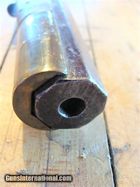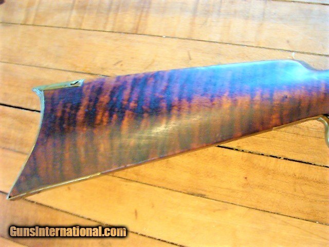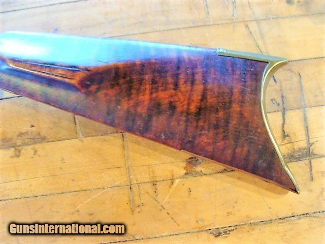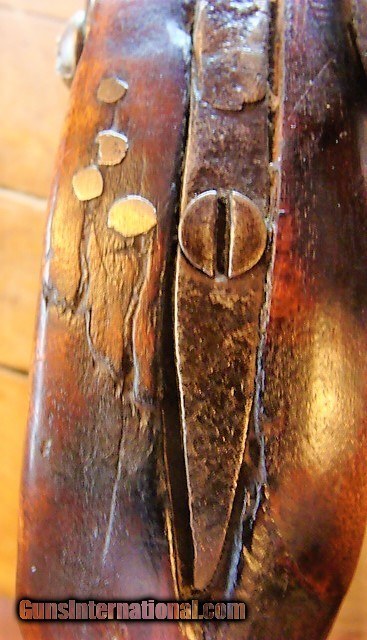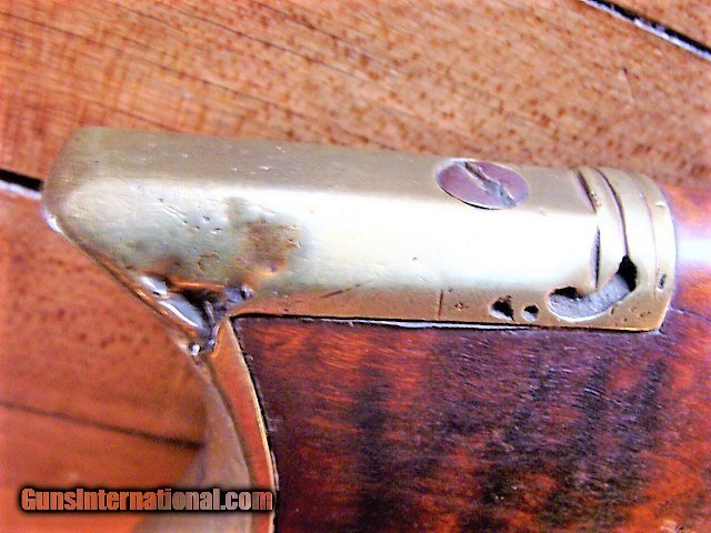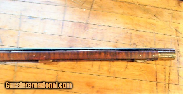 Description: From a mid-west sale, a very nice full stock Antique eastern style 32 caliber Percussion Rifle. The beautiful wood of the Tiger Striped maple is aged to a uniform color with no cracks however, there are dents and dings and a small amount of wood wood loss at the fine edge of the forend and a couple of very neat old repairs next to the tang and forward of the enterance thimble (see photos). The stock is solid (not loose) and has a brass nose cap, 2 brass thimbles & entry thmble, brass trigger guard and crescent butt plate. The metal finish is a mottled brown patina with some oxidation (see photos). The gun is 50" over all length with a 34 3/4"barrel (What I can see of the bore looks dark....I have not cleaned this gun) the ram rod is missing. There is a fixed rear sight (right wing missing, see photos) and a blade front sight. The double set trigger and lock need adjustment or repair as the lock will not hold full cock. The lock has some stamps but are unreadable (see photos). At the sale they said this rifle has been converted from a flintlock but I can not comfirm that. The brass butt plate and trigger guard are undamaged (see photos). I can not guarantee a gun this old will shoot however it appears, with a little freshening up, this gun could be back in the field or on the target range. At the sale they had no additional history about the gun however, everything appears old and original to my untrained eye but since I can not guarantee the origins of this gun I am offering it with a 100% satisfaction guarantee, if it does not live up to your expectations in any way return it for a full and speedy refund including your return shipping (see my feedback). We trade guns. NO FFL REQUIRED....CAN BE SHIPPED TO A RESIDENTIAL ADDRESS. I do not recommend firing any used weapon until it has been thoroughly examined by a certified gunsmith.