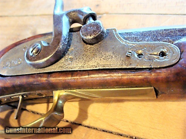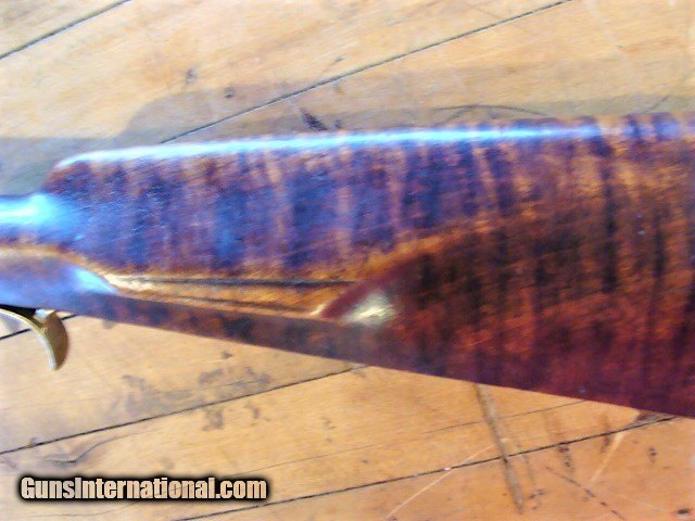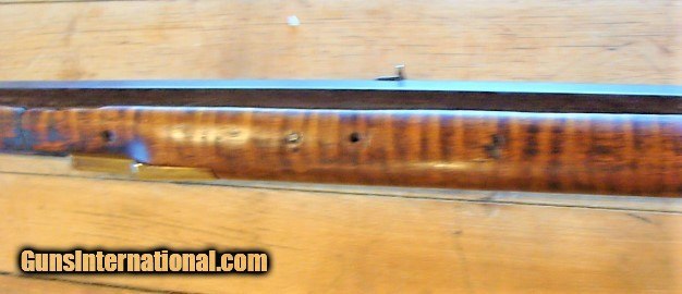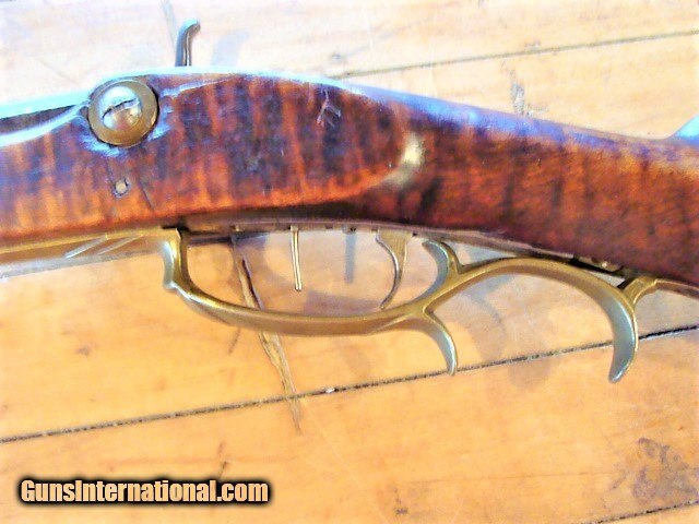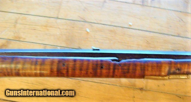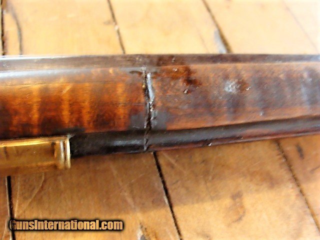 Description: From a mid-west sale, a very nice full stock Antique eastern style 32 caliber Percussion Rifle. The beautiful wood of the Tiger Striped maple is aged to a uniform color with no cracks however, there are dents and dings and a small amount of wood wood loss at the fine edge of the forend and a couple of very neat old repairs next to the tang and forward of the enterance thimble (see photos). The stock is solid (not loose) and has a brass nose cap, 2 brass thimbles & entry thmble, brass trigger guard and crescent butt plate. The metal finish is a mottled brown patina with some oxidation (see photos). The gun is 50" over all length with a 34 3/4"barrel (What I can see of the bore looks dark....I have not cleaned this gun) the ram rod is missing. There is a fixed rear sight (right wing missing, see photos) and a blade front sight. The double set trigger and lock need adjustment or repair as the lock will not hold full cock. The lock has some stamps but are unreadable (see photos). At the sale they said this rifle has been converted from a flintlock but I can not comfirm that. The brass butt plate and trigger guard are undamaged (see photos). I can not guarantee a gun this old will shoot however it appears, with a little freshening up, this gun could be back in the field or on the target range. At the sale they had no additional history about the gun however, everything appears old and original to my untrained eye but since I can not guarantee the origins of this gun I am offering it with a 100% satisfaction guarantee, if it does not live up to your expectations in any way return it for a full and speedy refund including your return shipping (see my feedback). We trade guns. NO FFL REQUIRED....CAN BE SHIPPED TO A RESIDENTIAL ADDRESS. I do not recommend firing any used weapon until it has been thoroughly examined by a certified gunsmith.