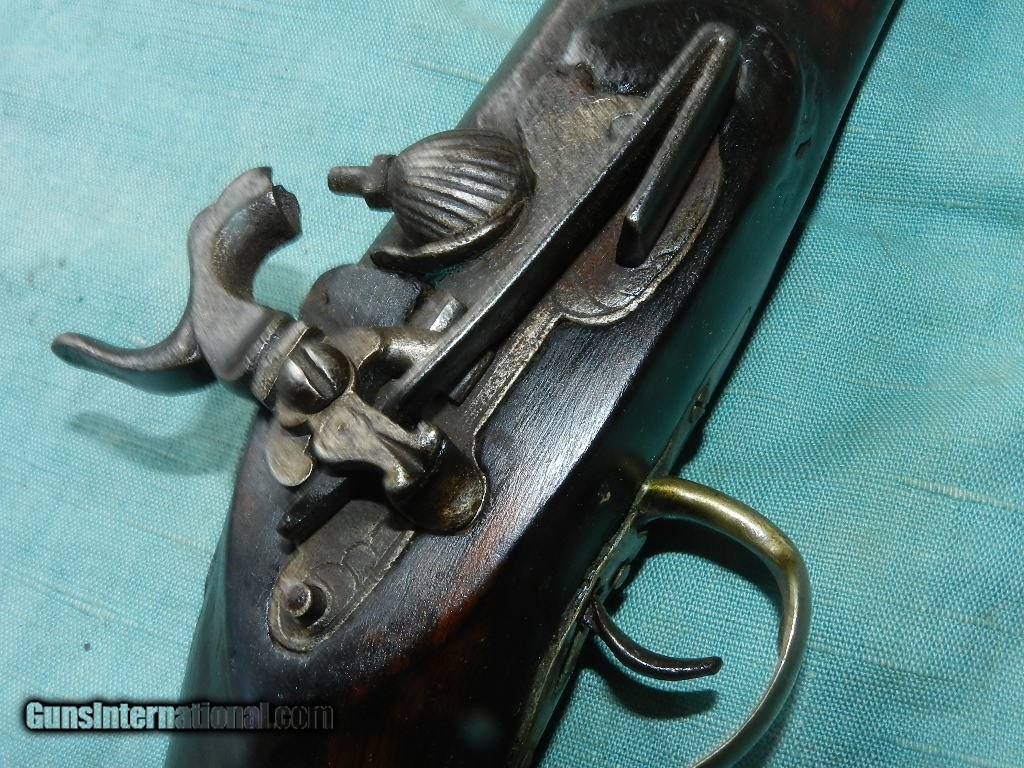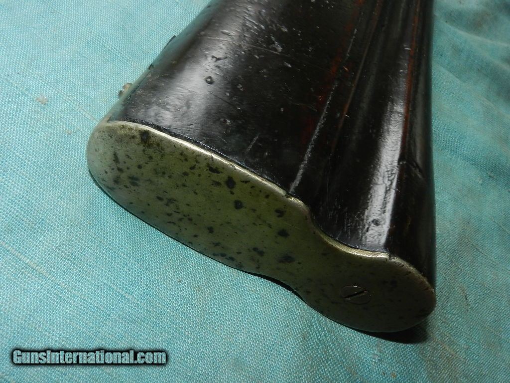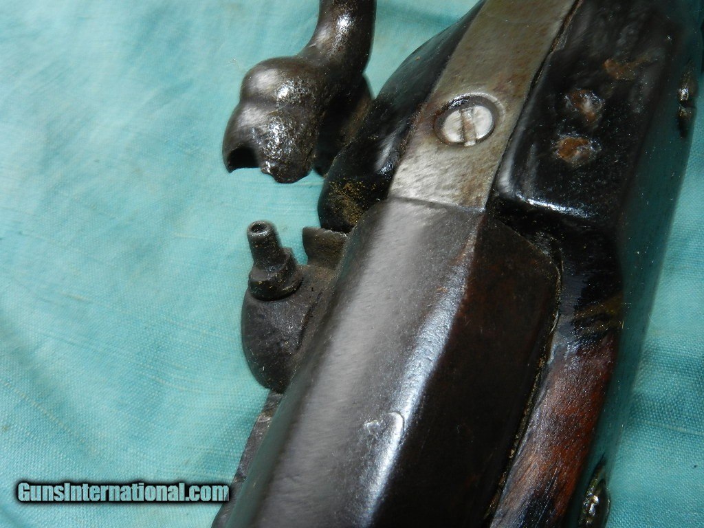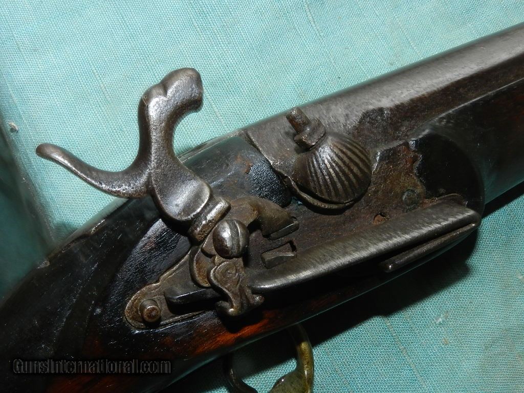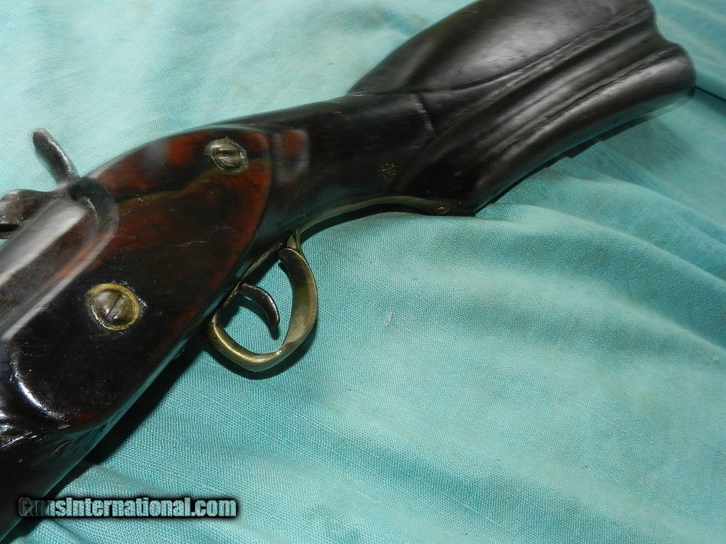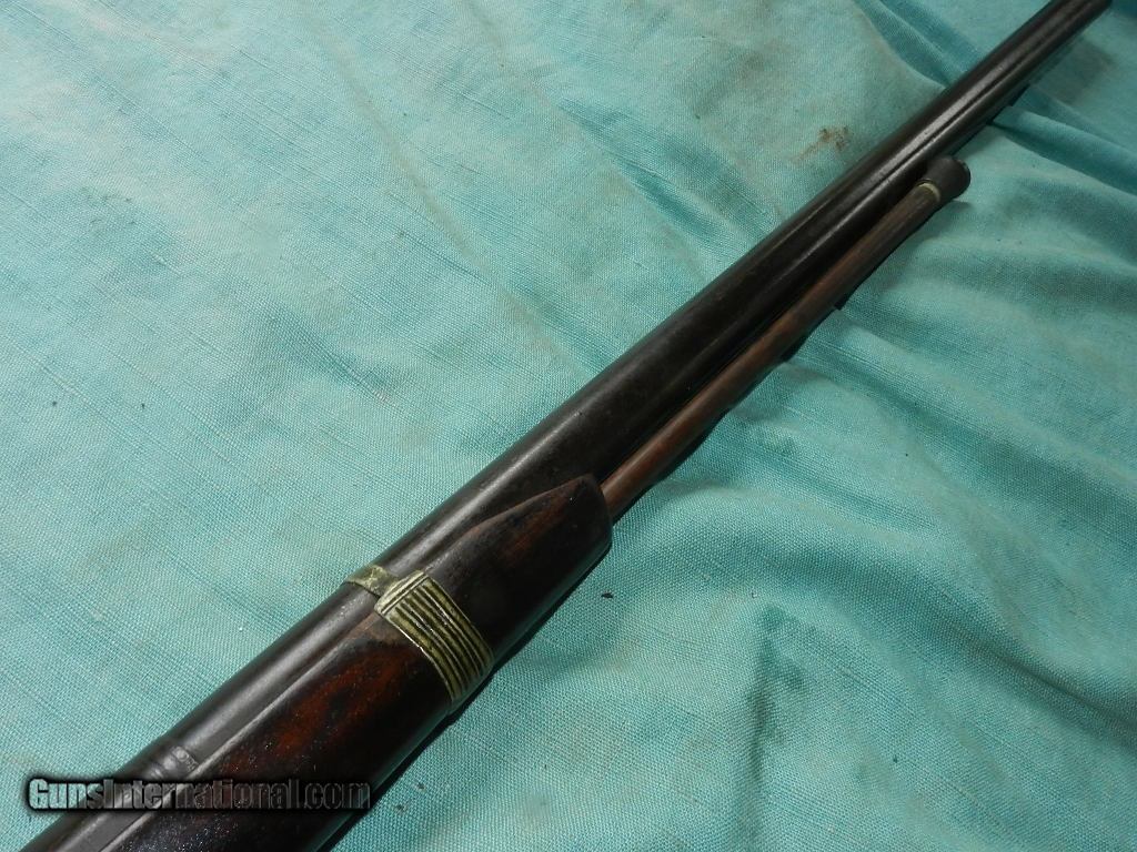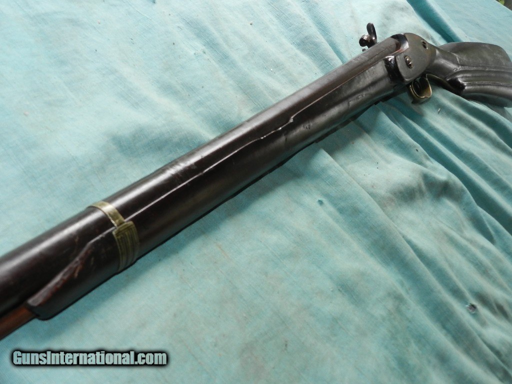 Description: SOLD A colorful Asia Minor/Carpathian Mountain Patilla Lock Miquelet Musket, with a about a 72 caliber smoothbore, 37 1/2” part octagon, part round barrel with a heavily oxidized bore.Overall measuring about 53" long.The barrel is an overall soft brown lightly oxidized patina and features turned medial at the point of transition and a lightly scalloped nipple bolster. The Patilla style lock shows light chiseling of the bridle and hammer. There is a single silver capucine and a nickel silver triggerguard and buttplate. The Germanic Jaeger hardwood stock rates perhaps fair showing a deeply fluted butt with light comb carving and remnants of coarse carved checkering, now primarily smooth. . A later shortened ramrod is present. The lock does actually function mechanically. Possibly having been used over 100 years in remote mountain countries.Certainly conjures one's imagination of how many native hands this gun had gone through! When buying a gun always have it examined by a competent gunsmith before shooting. To buy a gun from me you must get a direct email for me, with details, and shipping cost. We don’t have a web site .I prefer money orders or a check. Item ships when funds come in. I try to keep guns affordable, which means I make less money than most dealers. You won’t get altitude sickness, or nose bleed, with my prices! I consistently have the best selection of older guns If you attempt to buy, you must still contact us for details . Best to email to buy. Sometimes a local person can stop buy and purchase before the gun is removed. Sometimes not home to get calls. Some guns are required shipment to a gun dealer near you for a transfer to you when it arrives. Otherwise many older or black powder guns ship to your door. With the widest selection of older guns at great prices, We don’t have a store, and sell on the internet only. I’m easy to get along with. Thank You SOLD Antique: Yes |
