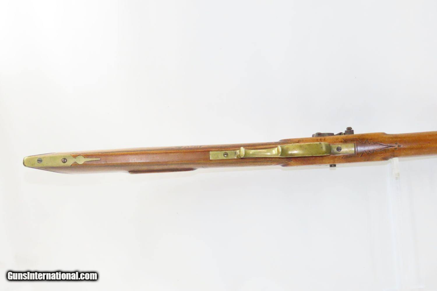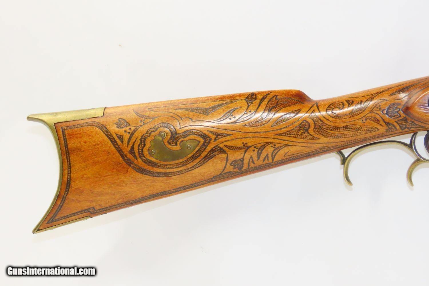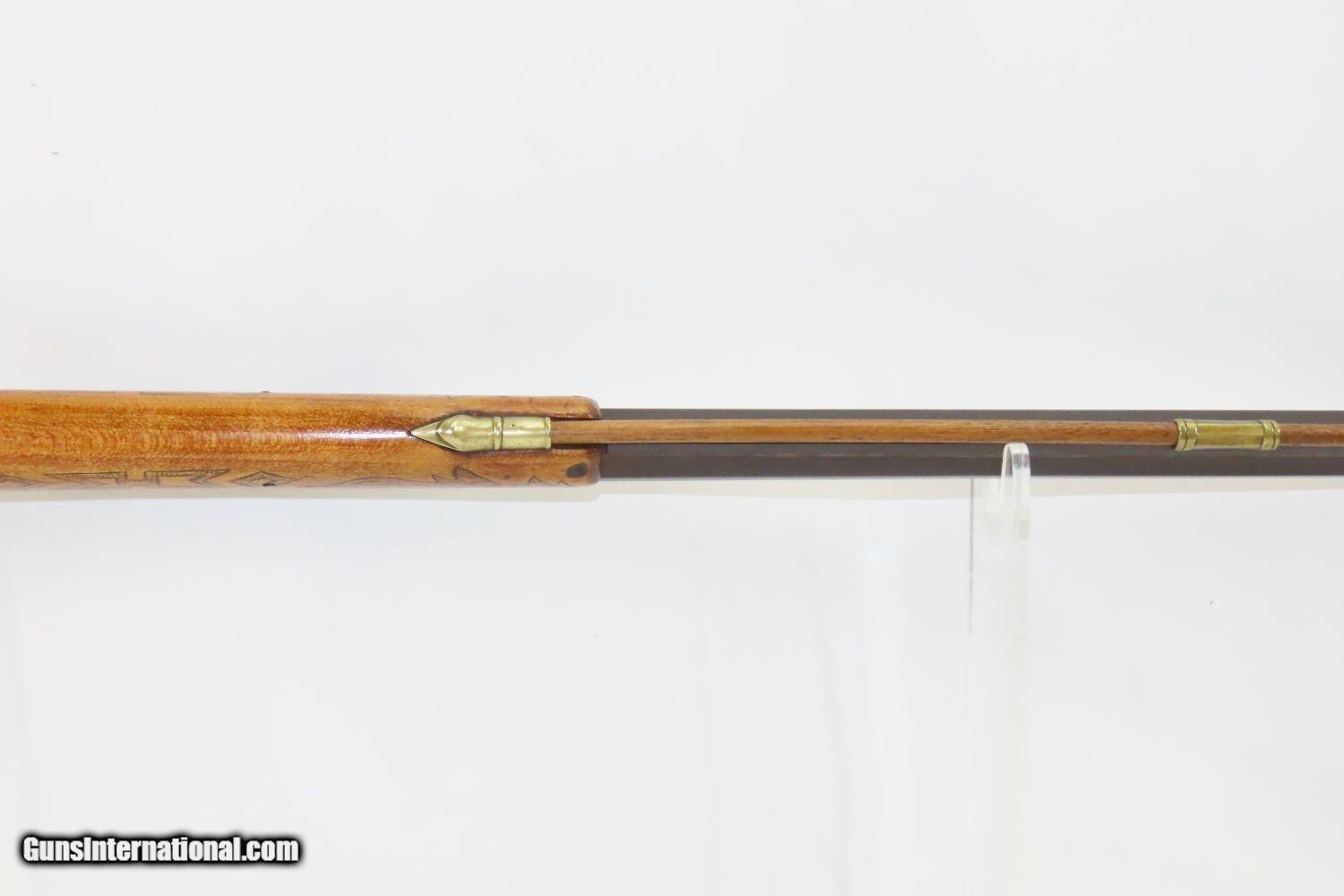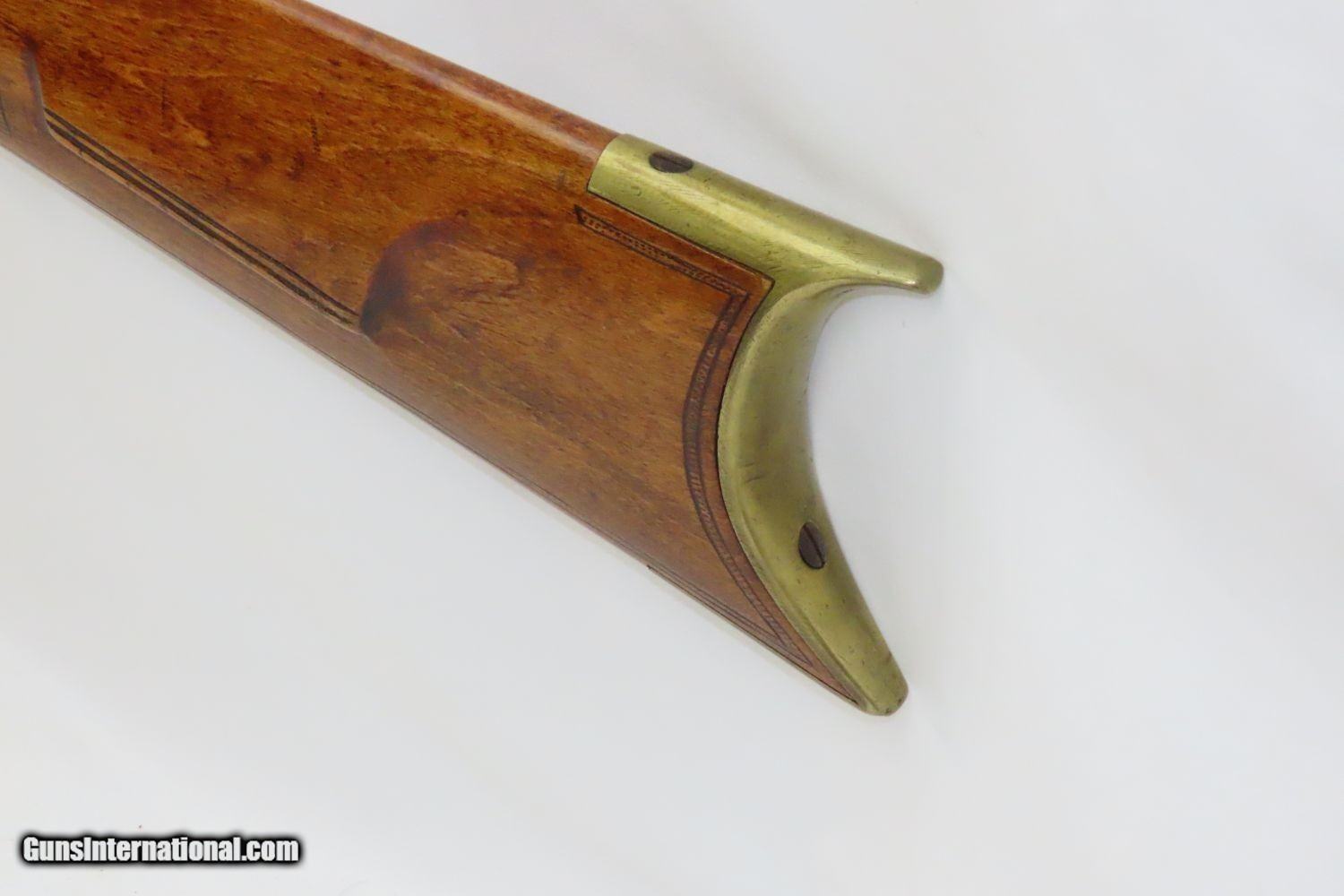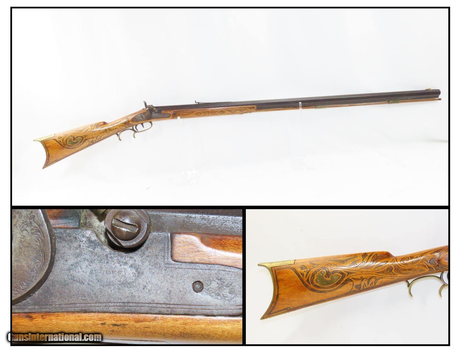 Description: ATTRACTIVE Scrolled Maple Stocked LONG RIFLE .35 Caliber Percussion Antique Small to Medium Game Frontier Long Arm Here we present an antique Percussion Half-Stocked Long Rifle. Though this rifle has been restocked, all of its primary parts are from the 1840s-60s era, including the G. Goulcher lock. This example features a long, 39-inch octagonal barrel. Such a weapon would have been used for self-defense and providing protection for the homestead. Though faint, “G. GOULCHER” can be read on the lock. Goulcher was active in New York in the 1850s and 1860s, and some have even speculated that he only made locks. Rifle manufacture in the mid-to-late 19th Century was rapidly changing over from thousands of craftsmen all over the United States and on the Frontier making and selling their wares, to the large factories with standardized assembly lines and modern manufacturing techniques. Many makers’ names of the so-called Kentucky long rifles have been lost over time. This rifle is one such example. This is an interesting piece all around! The overall condition is very good. Strong action. The bore is in good shape. Ornately scroll inscribed, solid stock. Golcher engraved lock. Here’s a true looker for the collection! Own the original! This is a legitimate antique and not a reproduction. Barrel is 39 inches. Caliber: .35 Percussion Overall condition as seen in photos. Very Fast. Very Safe. FREE SHIPPING WORLDWIDE. Delivered directly to your door by express mail! Guaranteed AUTHENTIC & Includes CERTIFICATE OF AUTHENTICITY. ancestryguns $1285 #210397 SOLD Antique: Yes |