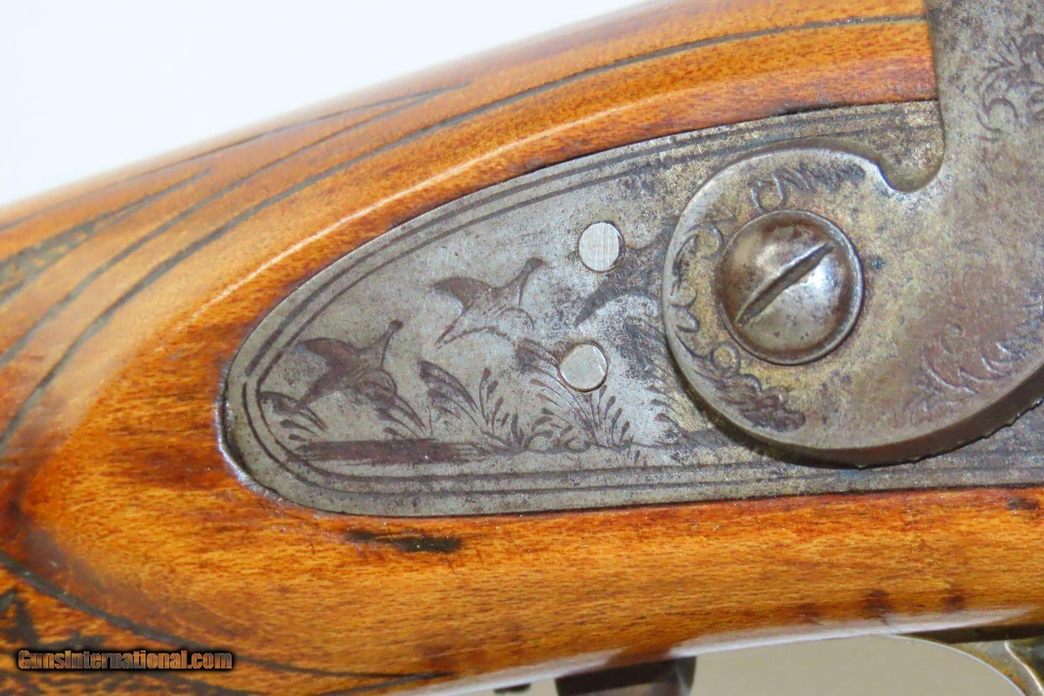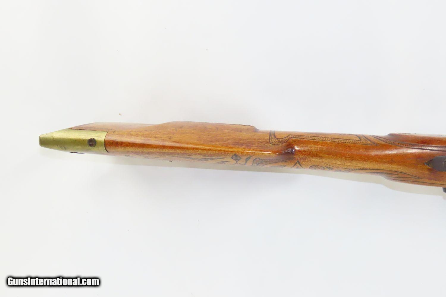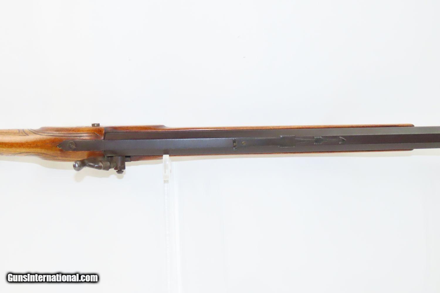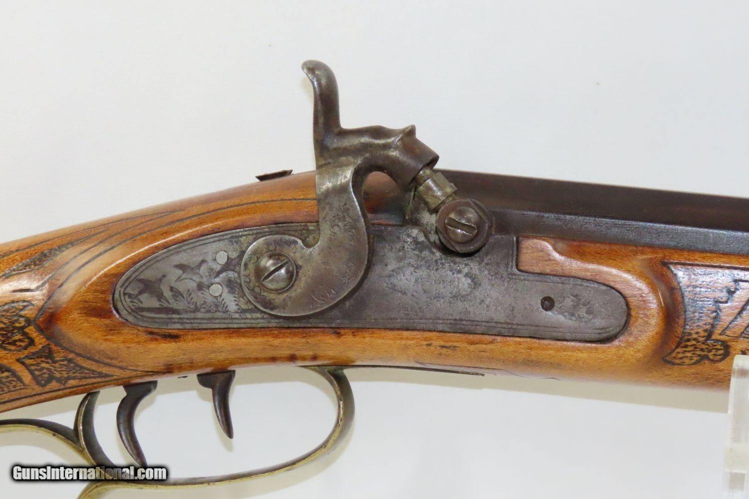 Description: ATTRACTIVE Scrolled Maple Stocked LONG RIFLE .35 Caliber Percussion Antique Small to Medium Game Frontier Long Arm Here we present an antique Percussion Half-Stocked Long Rifle. Though this rifle has been restocked, all of its primary parts are from the 1840s-60s era, including the G. Goulcher lock. This example features a long, 39-inch octagonal barrel. Such a weapon would have been used for self-defense and providing protection for the homestead. Though faint, “G. GOULCHER” can be read on the lock. Goulcher was active in New York in the 1850s and 1860s, and some have even speculated that he only made locks. Rifle manufacture in the mid-to-late 19th Century was rapidly changing over from thousands of craftsmen all over the United States and on the Frontier making and selling their wares, to the large factories with standardized assembly lines and modern manufacturing techniques. Many makers’ names of the so-called Kentucky long rifles have been lost over time. This rifle is one such example. This is an interesting piece all around! The overall condition is very good. Strong action. The bore is in good shape. Ornately scroll inscribed, solid stock. Golcher engraved lock. Here’s a true looker for the collection! Own the original! This is a legitimate antique and not a reproduction. Barrel is 39 inches. Caliber: .35 Percussion Overall condition as seen in photos. Very Fast. Very Safe. FREE SHIPPING WORLDWIDE. Delivered directly to your door by express mail! Guaranteed AUTHENTIC & Includes CERTIFICATE OF AUTHENTICITY. ancestryguns $1285 #210397 SOLD Antique: Yes |