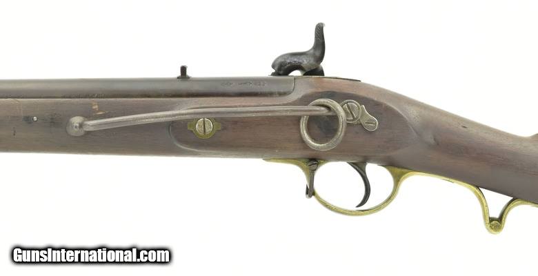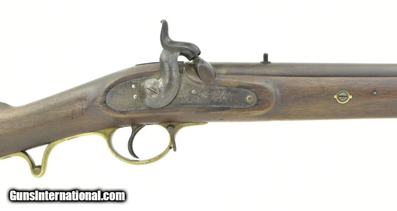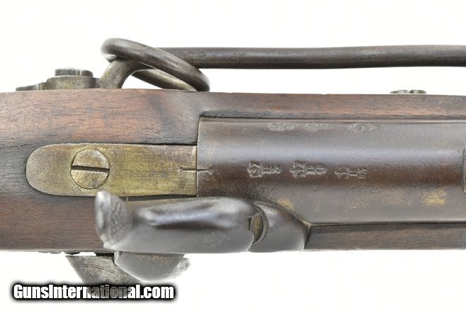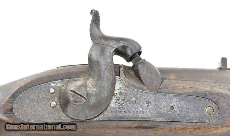 British Pattern 1842 cavalry carbine. 20â…›” round smoothbore barrel with fine bore. Lock has crown “VR” over “Tower” dated “1847” with a crown broad arrow ordnance mark to the right. Metal is very good with smooth brown patina, areas of minor pitting on lock and hammer. Usual proof marks are on the barrel, which is approximately .65 caliber. Wood is very good with a small piece missing at the rear of the lock. Brass furniture Is nicely aged with butt plate tang having a “G/43” issue mark. Sling ring, bar and captured cleaning rod are present. Action functions properly. A scarce early percussion carbine in really nice condition.