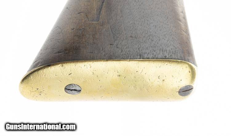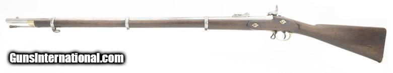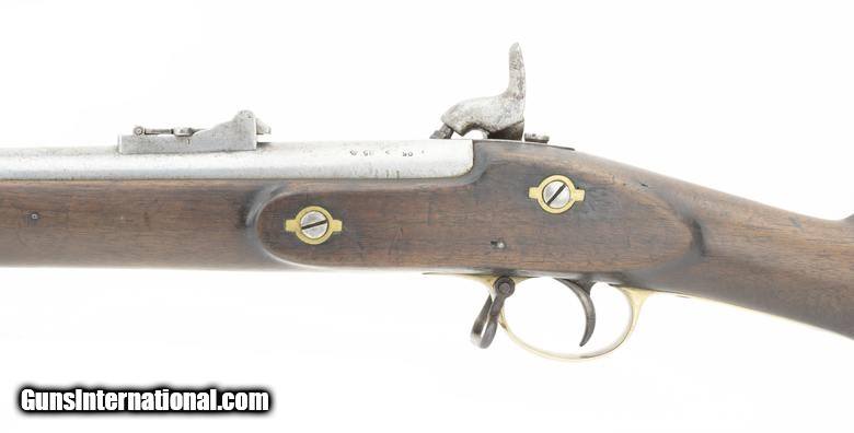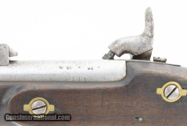 Description: British Pattern 1853 Enfield Rifle with Possible Confederate Connections. Original .577 caliber 59” round barrel is now approximately .59 caliber smoothbore with a fair bore. Barrel has a smooth bright finish overall with pits polished out in the breech area. Barrel has the usual Birmingham proofs with the two “25” which denote .577 caliber. The lock has a crown to the rear and 1861 / Tower to the front. The hammer has light pitting on the off-side and the lock and bands are smooth. Stock is very good with no chips or cracks. It is maked ”W.L. Sargent between the toe and trigger guard tang . The trigger guards tamped “CSA”, the authenticity of which we cannot verify. Action functions correctly. Pritchard and Huey, in “The English Connection” states that William Lucas Sargeant, 74 Edmund St., Birmingham, was one of the larger and more important Birmingham Arms manufacturers (pg. 73) They also included W. L. Sargent on their list of known manufactures with reliable Confederate Association (pg. 100). This Enfield undoubtedly saw service during the Civil War and mostly likely with Confederate forces. SOLD Antique: Yes |