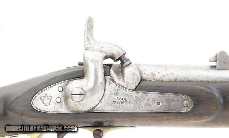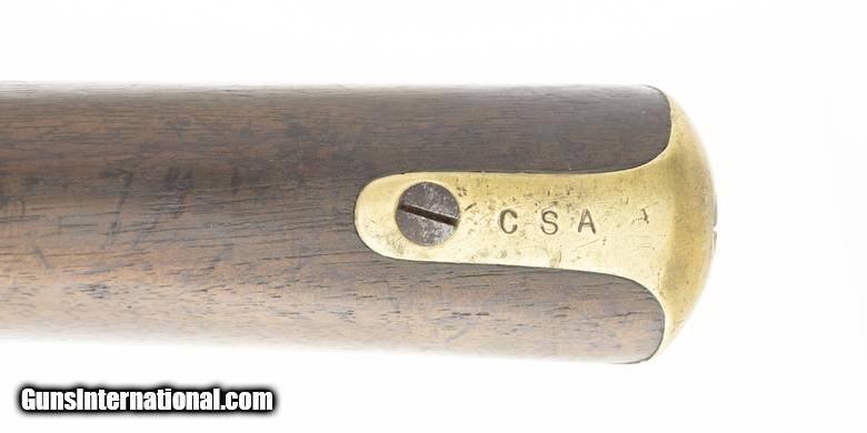British Pattern 1853 Enfield Rifle with Possible Confederate Connections. Original .577 caliber 59” round barrel is now approximately .59 caliber smoothbore with a fair bore. Barrel has a smooth bright finish overall with pits polished out in the breech area. Barrel has the usual Birmingham proofs with the two “25” which denote .577 caliber. The lock has a crown to the rear and 1861 / Tower to the front. The hammer has light pitting on the off-side and the lock and bands are smooth. Stock is very good with no chips or cracks. It is maked ”W.L. Sargent between the toe and trigger guard tang . The trigger guards tamped “CSA”, the authenticity of which we cannot verify. Action functions correctly. Pritchard and Huey, in “The English Connection” states that William Lucas Sargeant, 74 Edmund St., Birmingham, was one of the larger and more important Birmingham Arms manufacturers (pg. 73) They also included W. L. Sargent on their list of known manufactures with reliable Confederate Association (pg. 100). This Enfield undoubtedly saw service during the Civil War and mostly likely with Confederate forces.