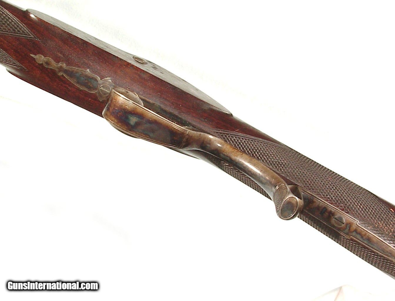 Description: .577 caliber, 33" round barrel with patent hinged breech and steel ramrod underneath. Casehardened lock, hammer, mounts, buttplate, and patchbox. Checkered walnut stock. Tangent type folding ladder rear sight. In beautiful near mint unused original condition. Retaining all of the case colors and blue. Mint bore. In it's original oak box complete with accessories that includes a perfect Sykes pig skin, silver mounted flask. Spectacular in all respects. SOLD Antique: Yes |