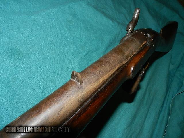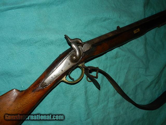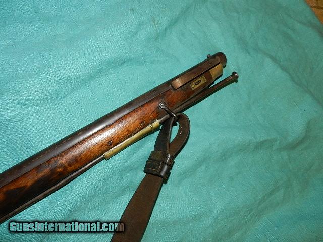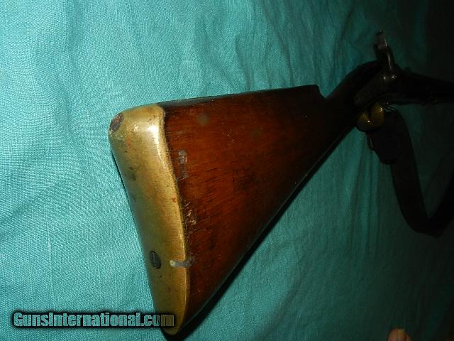 Description: A Brunswick percussion .65 cal rifle with a 35 1/2" long barrel, and and dark, but lightly pitted bore. The metal is brown with areas of light pitting but no rusted out! Butt-stock doesnot have a patchbox, and the stock has staining, and small chips, and very small age cracks , nothing wide open or parts broke. this doesn't look like the current greasy imports.Lock works good, and this gun has an iron ramrod, and a leather sling.Some dents, or pitting about half way down the barrel externally. Some wood separation near the lock.Overall a nice wall hanger.We don’t have a store, and sell on the internet only. We don’t have a. OUR DESCRIPTIONS ARE ACCURATE.THREE DAY INSPECTION ON ALL PURCHASES. SOLD Antique: Yes |