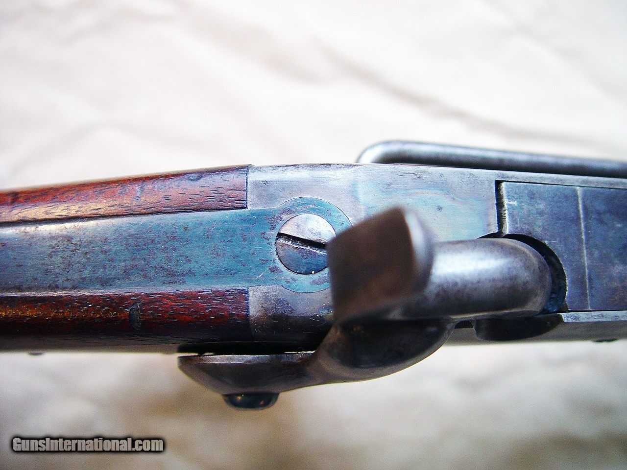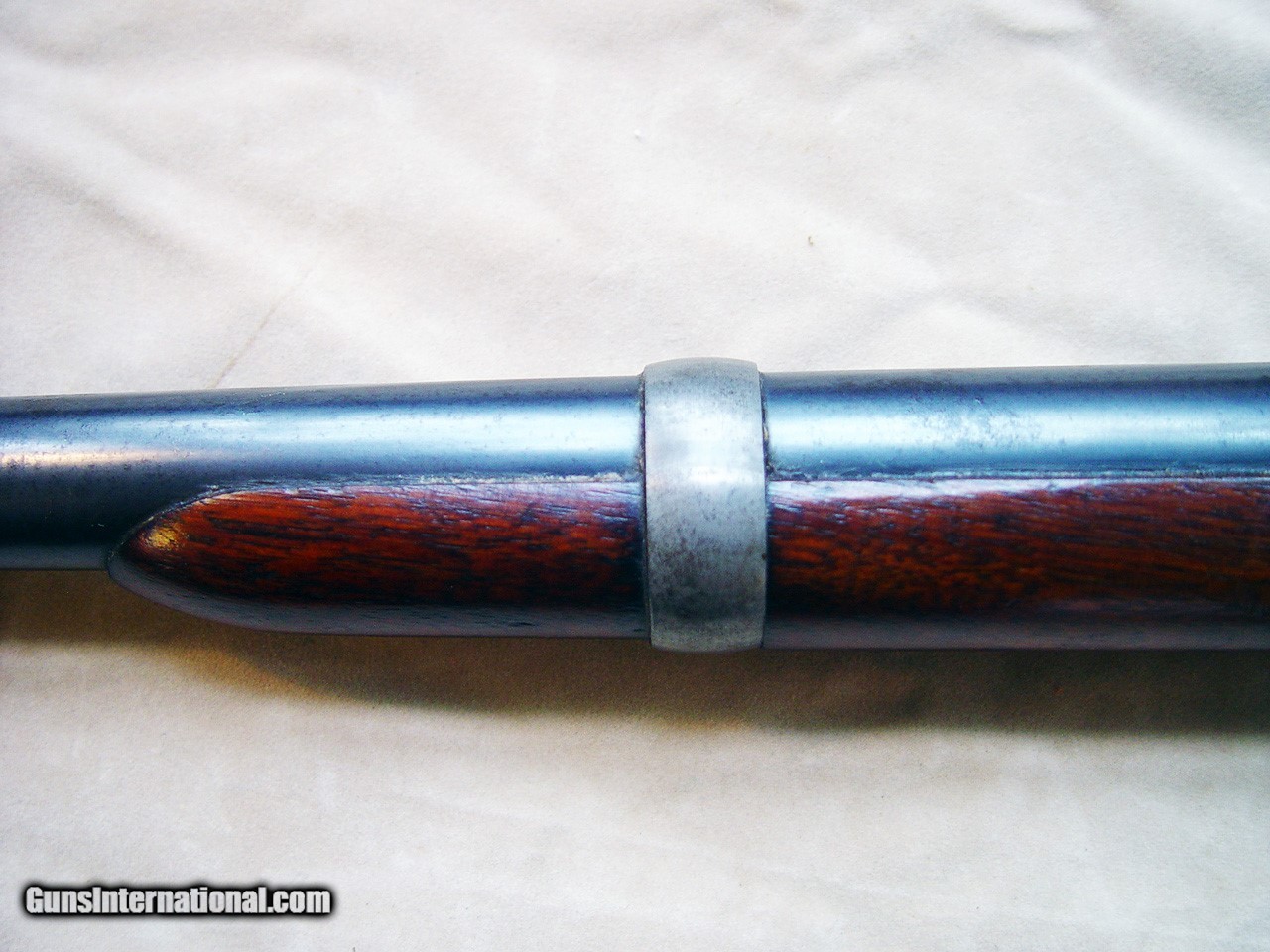 Description: Offered is a very fine example of a 5th Model Burnside saddle ring carbine. This old percussion breech loading carbine is in exceptionally good condition with no cracks in the wood, a considerable amount of the color case hardening on the receiver and hammer, about 98% original blue on the barrel, a couple of light dings in the wood, beautiful bright shiny bore and all matching parts. Inspector's cartouches are sharp, initials have been carved on the stock as can be seen in my pictures. It does show wear and very light pitting and freckling on the saddle ring and ring mount. SOLD Antique: Yes Manufacturer: Burnside Model: 5th Model Caliber Info: .54 Condition: Very good plus to excellent Metal Condition: very good plus Wood Condition: very good plus Bore Condition: excellent |