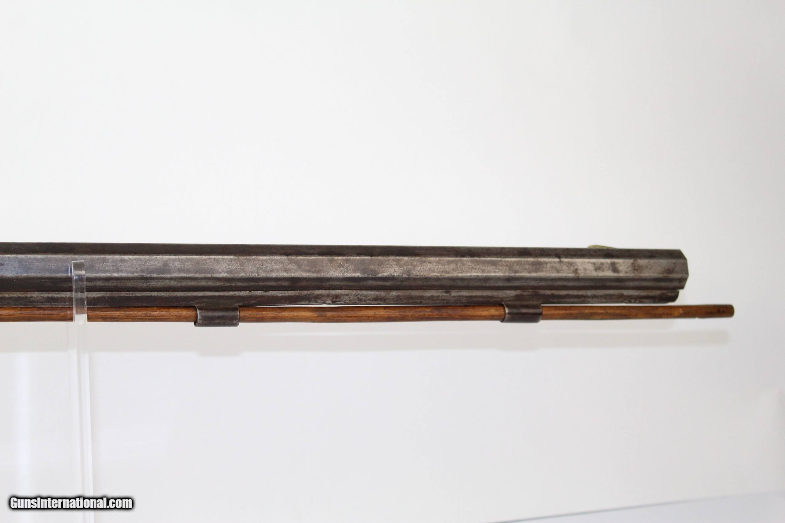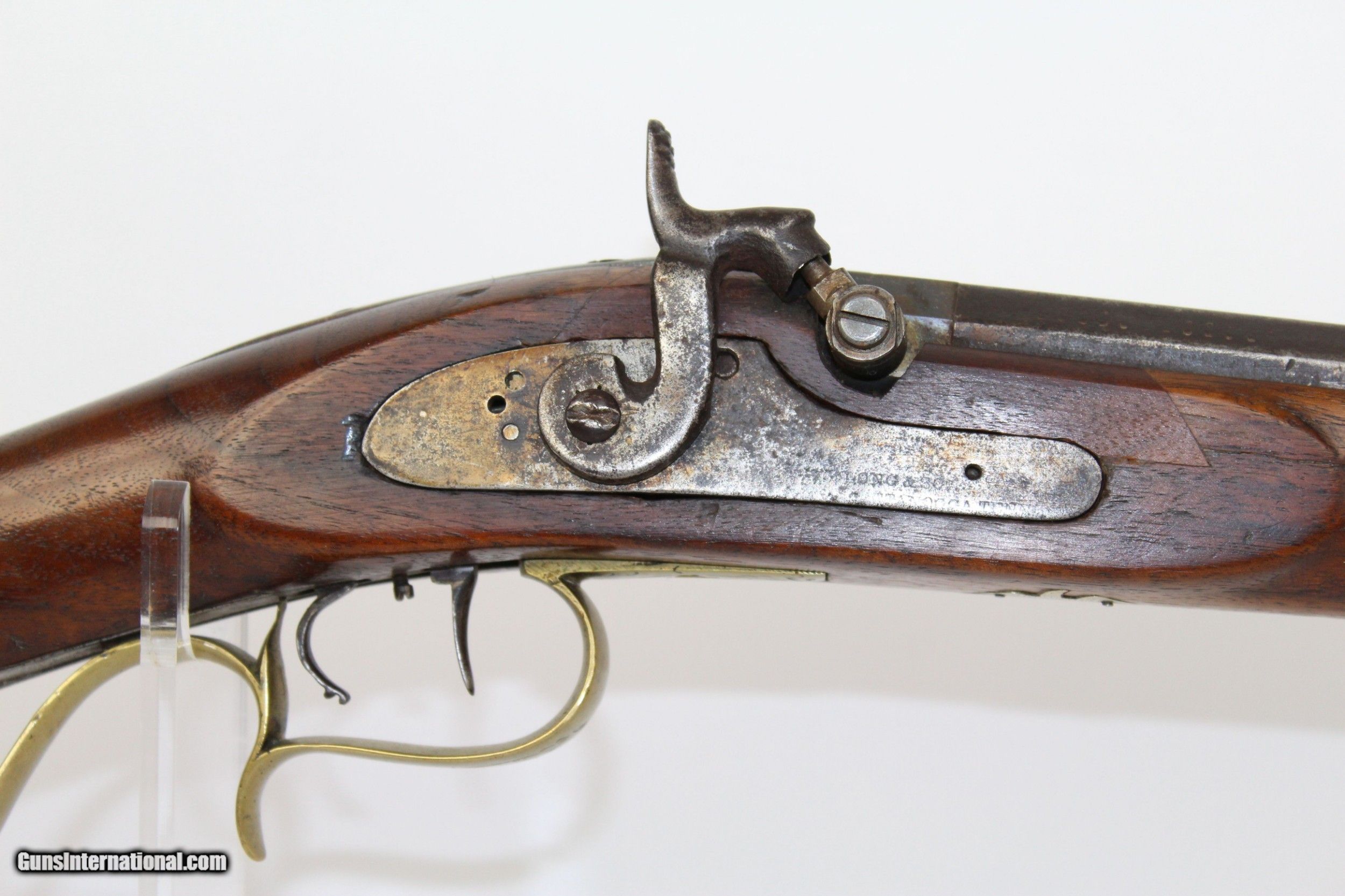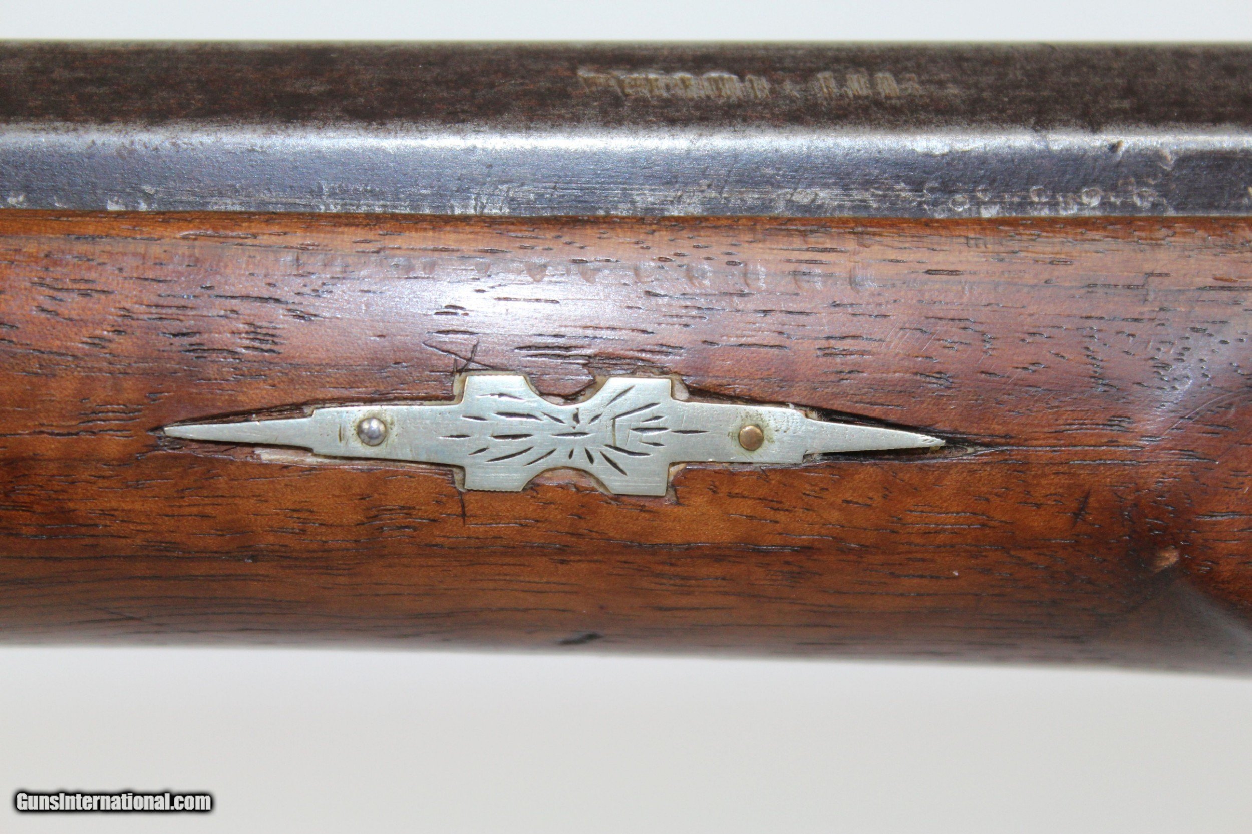 Description: CHATANOOGA, TN Antique DeLong & Son LONG RIFLE .44 Caliber Percussion Tennessee Rifle Here we present an antique DeLong & Son Half Stock Rifle, manufactured circa the latter half of the 19th Century in Chattanooga, Tennessee. Lucius DeLong operated in Chattanooga circa 1860-1890 under the trade name “DeLong & Son”. This would have made a great rifle for just about anything one would need in the mid-19th Century: game for the pot or protection for the homestead. This rifle features a nearly 34 inch barrel in .44 caliber. Both the top of the barrel and the lock are marked “DELONG & SON/CHATTANOOGA TENN”. These original components have been restocked but thankfully kept together in a newer setting. The fore end is pewter with the rest of the hardware being brass. Trigger guard is engraved and there are several decorative escutcheons throughout, one in the shape of an eagle. The overall condition is good. The metal surfaces are dark with age. The markings are clear and legible. The stock is in good shape. The lines at the top and bottom of the butt stock are not cracks but an attempt at a decorative border. The bore is nearly bright with sharp rifling. The action on this rifle is not currently functional, though there is good spring tension. It is very likely that the set trigger needs dialing in. Here is a scarce rifle from Chattanooga, Tennessee! Own the original! This is a legitimate antique and not a reproduction. Barrel is 33-3/4 inches. Caliber: .44 Percussion Overall condition as seen in photos. Very Fast. Very Safe. FREE SHIPPING WORLDWIDE. Delivered directly to your door by express mail! Guaranteed AUTHENTIC & Includes CERTIFICATE OF AUTHENTICITY. ancestryguns $1650 #7160 SOLD Antique: Yes |