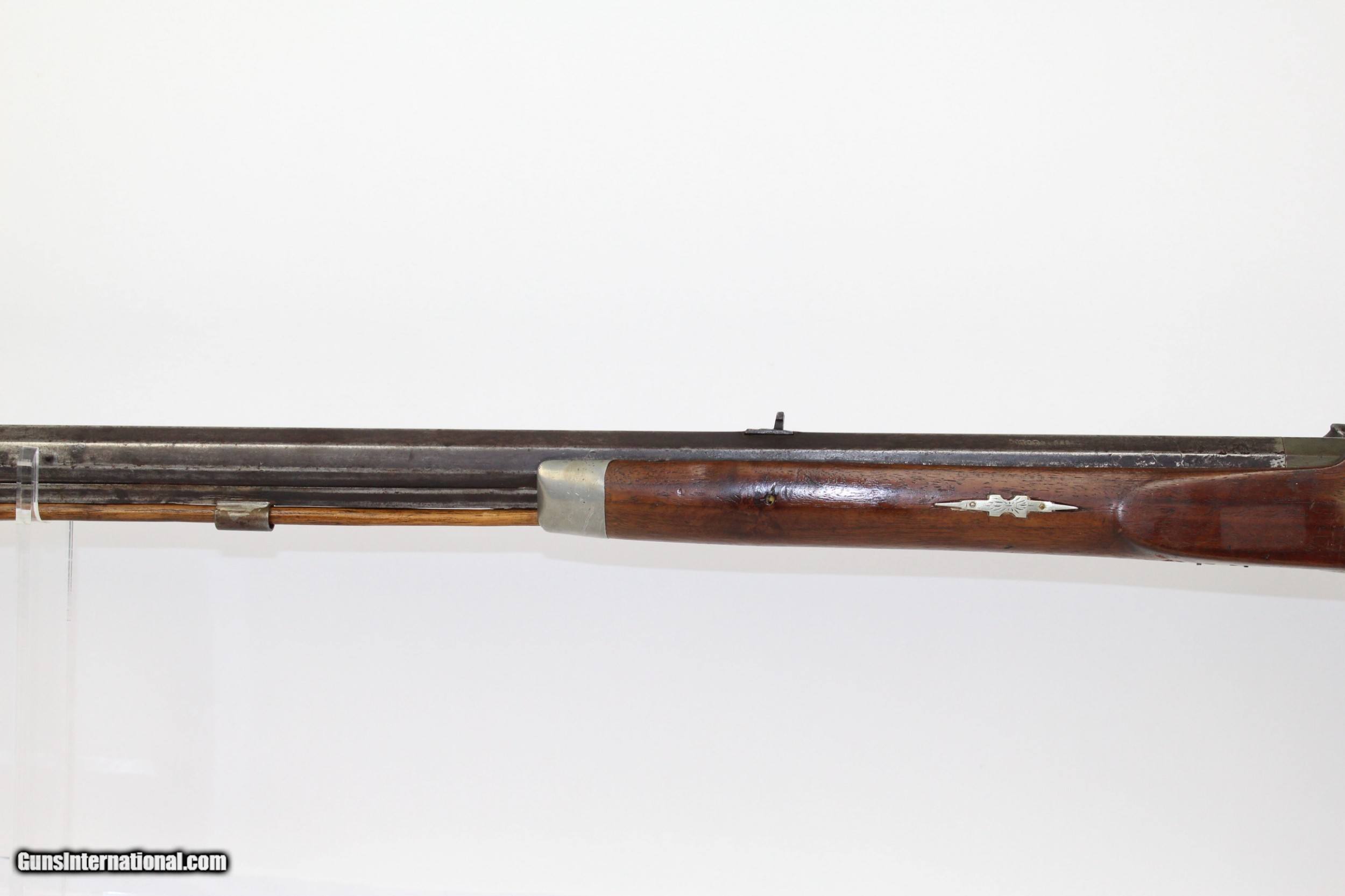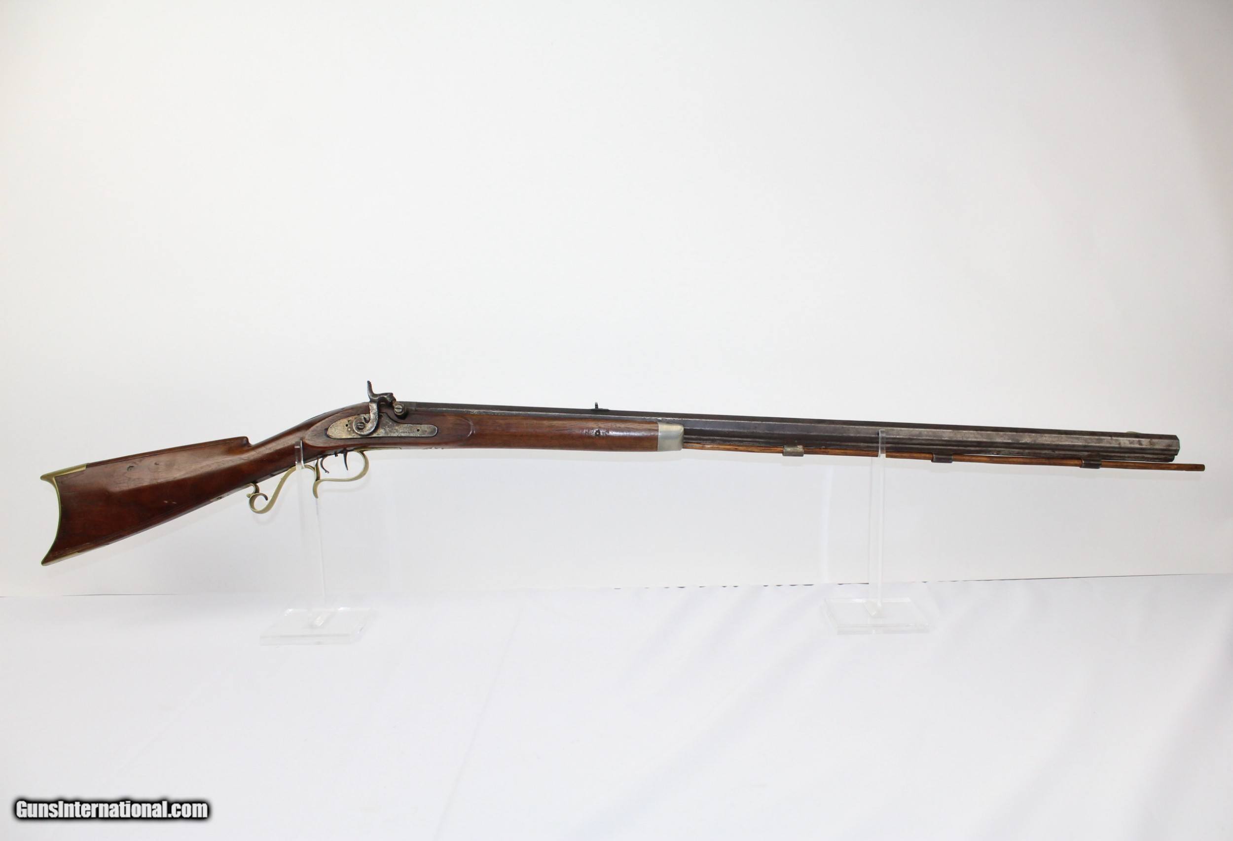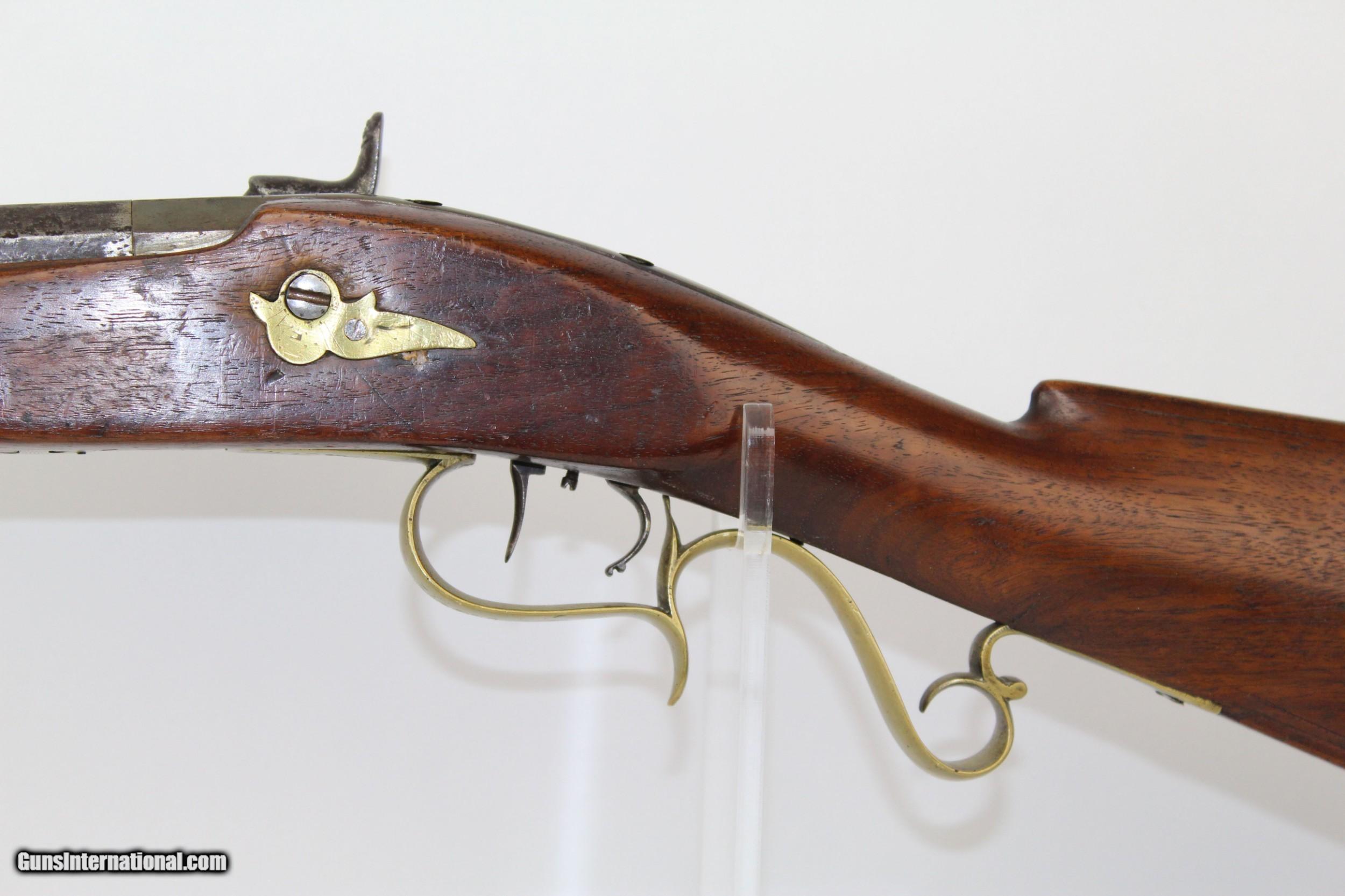 Description: CHATANOOGA, TN Antique DeLong & Son LONG RIFLE .44 Caliber Percussion Tennessee Rifle Here we present an antique DeLong & Son Half Stock Rifle, manufactured circa the latter half of the 19th Century in Chattanooga, Tennessee. Lucius DeLong operated in Chattanooga circa 1860-1890 under the trade name “DeLong & Son”. This would have made a great rifle for just about anything one would need in the mid-19th Century: game for the pot or protection for the homestead. This rifle features a nearly 34 inch barrel in .44 caliber. Both the top of the barrel and the lock are marked “DELONG & SON/CHATTANOOGA TENN”. These original components have been restocked but thankfully kept together in a newer setting. The fore end is pewter with the rest of the hardware being brass. Trigger guard is engraved and there are several decorative escutcheons throughout, one in the shape of an eagle. The overall condition is good. The metal surfaces are dark with age. The markings are clear and legible. The stock is in good shape. The lines at the top and bottom of the butt stock are not cracks but an attempt at a decorative border. The bore is nearly bright with sharp rifling. The action on this rifle is not currently functional, though there is good spring tension. It is very likely that the set trigger needs dialing in. Here is a scarce rifle from Chattanooga, Tennessee! Own the original! This is a legitimate antique and not a reproduction. Barrel is 33-3/4 inches. Caliber: .44 Percussion Overall condition as seen in photos. Very Fast. Very Safe. FREE SHIPPING WORLDWIDE. Delivered directly to your door by express mail! Guaranteed AUTHENTIC & Includes CERTIFICATE OF AUTHENTICITY. ancestryguns $1650 #7160 SOLD Antique: Yes |