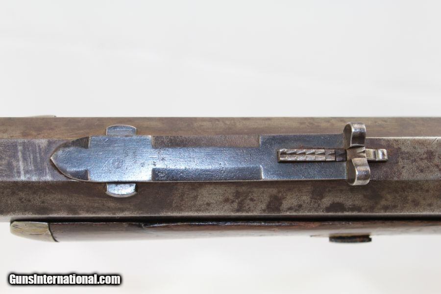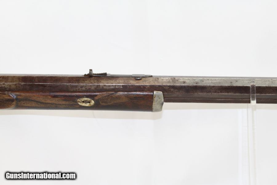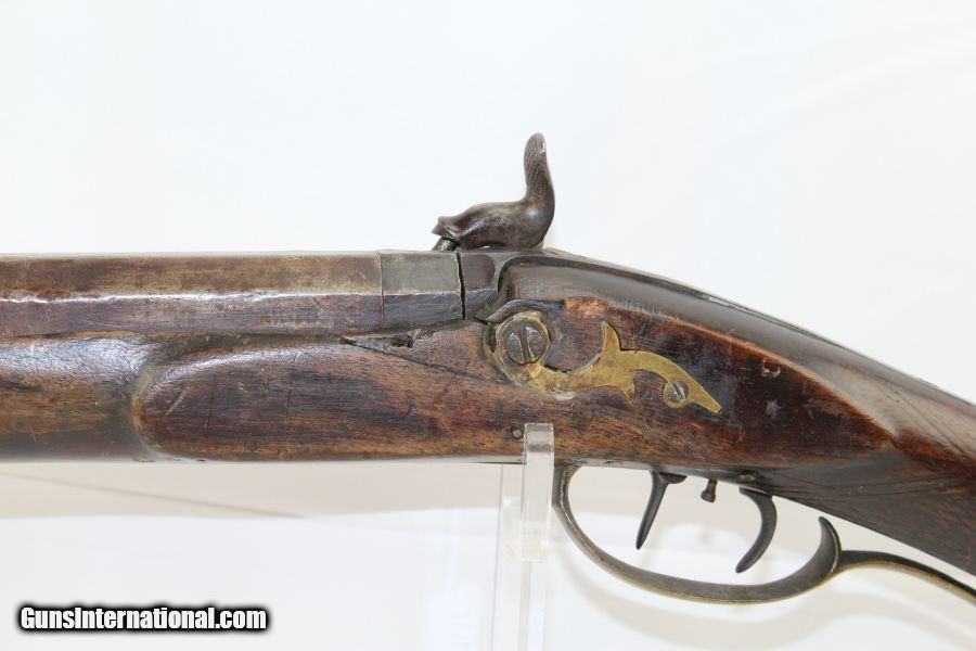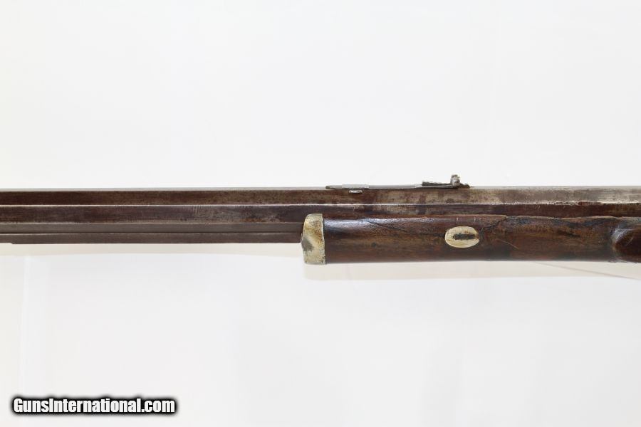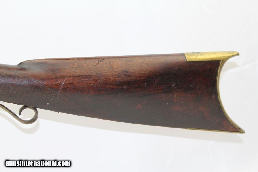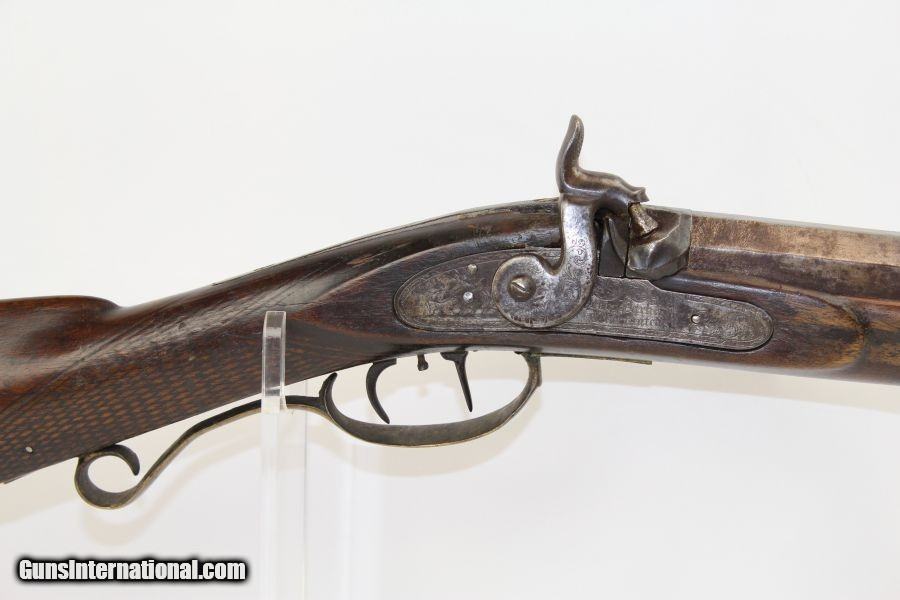 Description: CHATHAM, ONTARIO Marked LONG RIFLE by NICHOL .41 Caliber Bore w/ “Henry Parker” Lock Here we present an antique Half-Stock Long Rifle by Thomas Nichol, made circa the 1850s in Chatham, Canadian West, now Ontario, Canada. The lock is marked “Henry Parker” and the barrel is marked “T. Nichol, Chatham, C.W.” with an address of “No. 129 GT”. “CW” refers to “Canadian West”, the name the region was known by prior to “Ontario”. In 1831, Thomas Nichol emigrated from Edinburgh, Scotland with his family at age 3, settling in Quebec. In 1851, he opened a gun shop in Chatham. Circa 1885 he was also making roller skates, a fairly new invention, in addition to his firearms. His son would keep up the family business in the form of a more general sporting goods store. Thomas would pass away at age 77 on March 2, 1905. This .41 caliber rifle features brass hardware. The lock is nicely engraved and marked “HENRY PARKER/WARRANTED” in gothic script. It also features double set triggers. Henry Parker was a well-known lock maker operating out of Trenton, New Jersey. This rifle was used hard, unsurprising since this was made for use in what was then the Canadian Frontier. The metal parts are dark with age. The markings are clear. The stock has been repaired and areas of checkering are worn. The bore is dark with visible rifling. The action is mobile but not currently functional. Own the original! This is a legitimate antique and not a reproduction. Barrel is 32 inch octagon. Caliber: .41 Percussion Overall condition as seen in photos. Very Fast. Very Safe. FREE SHIPPING WORLDWIDE. Delivered directly to your door by express mail! Guaranteed AUTHENTIC & Includes CERTIFICATE OF AUTHENTICITY. ancestryguns $1250 #8060 SOLD Antique: Yes |
