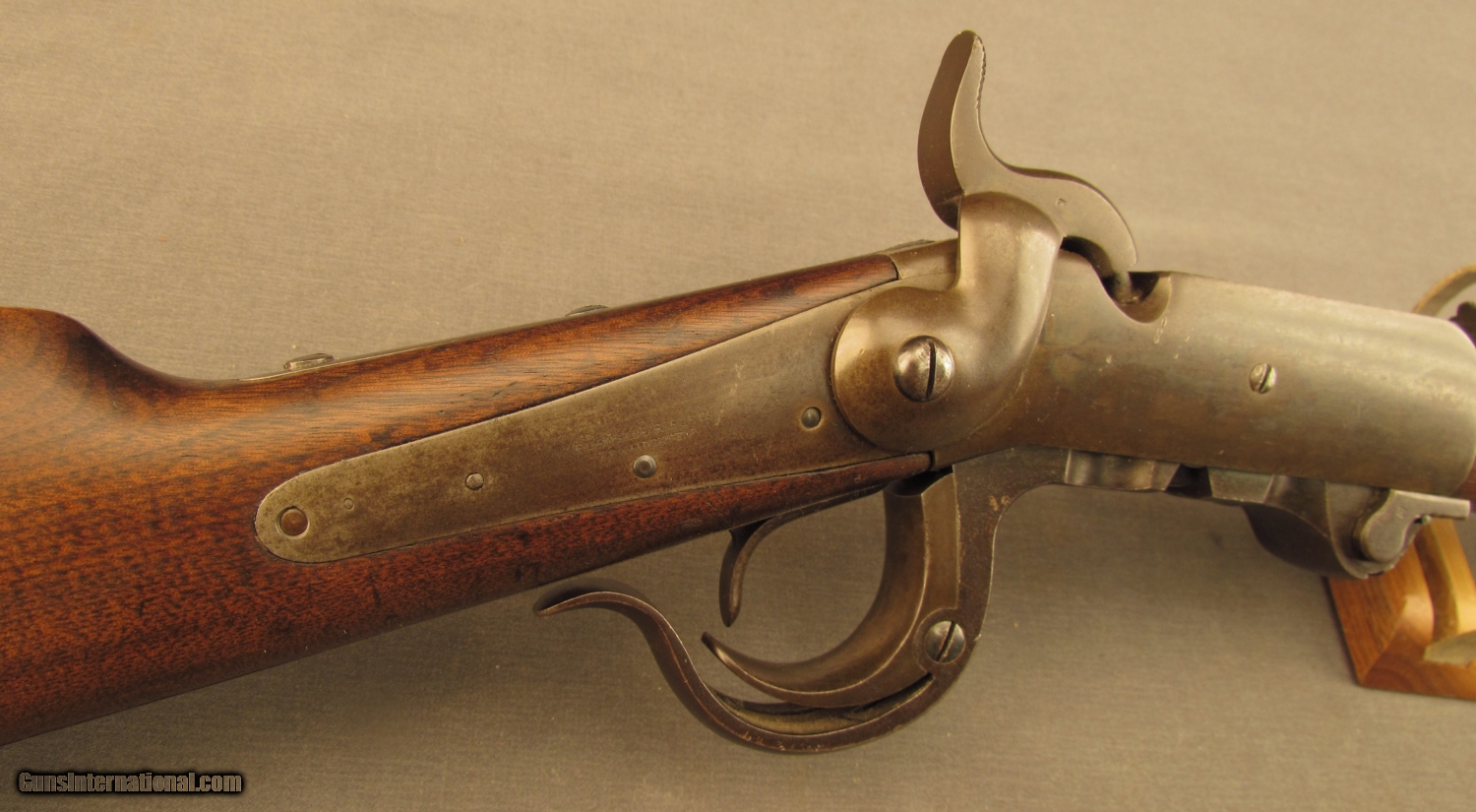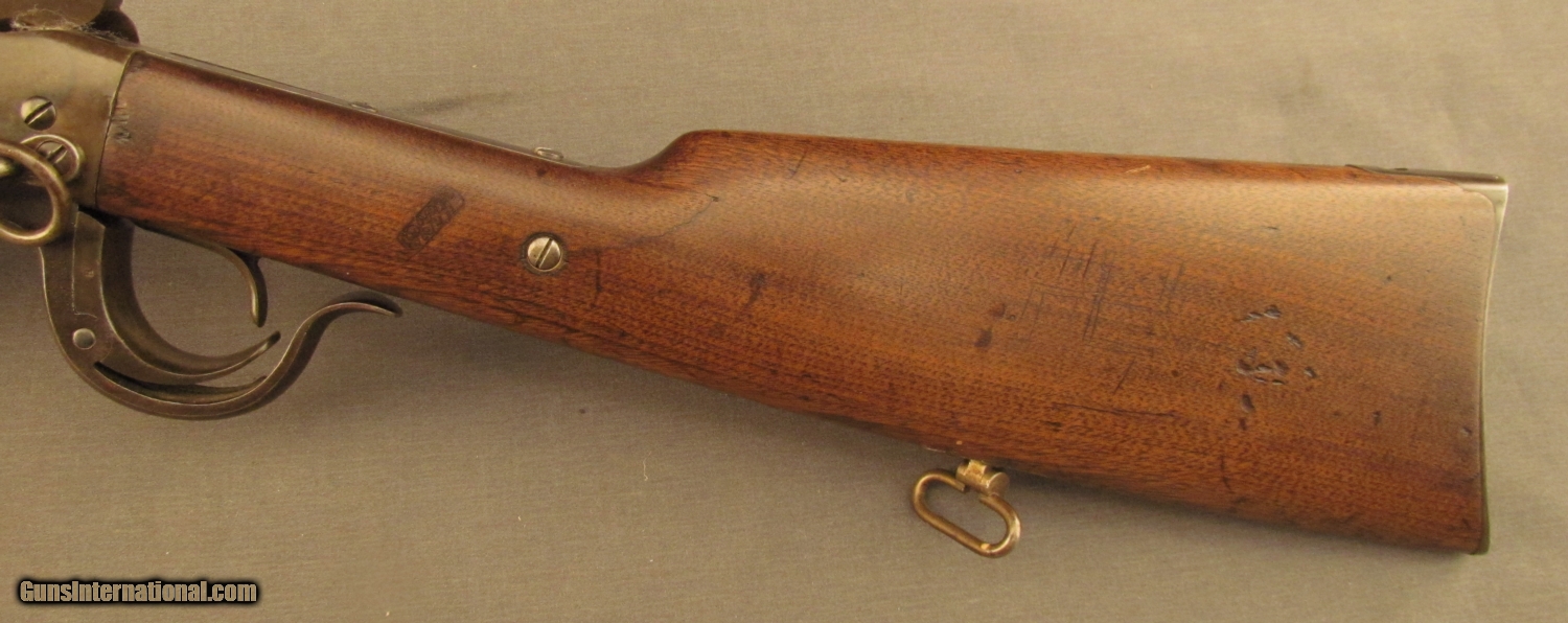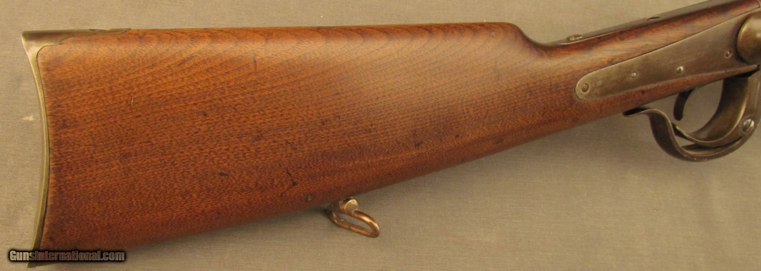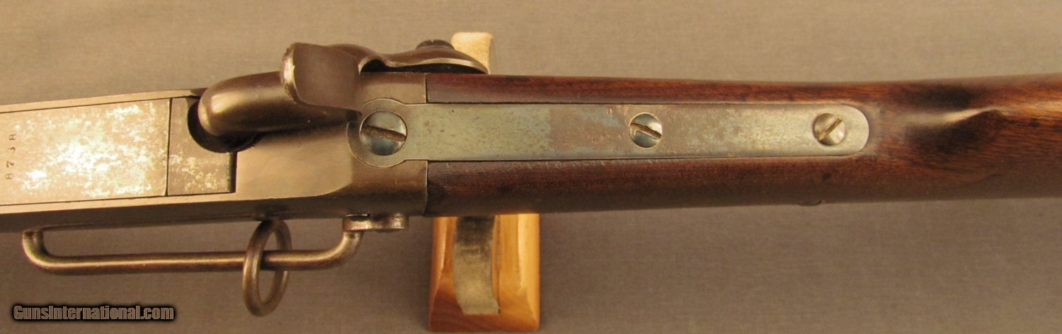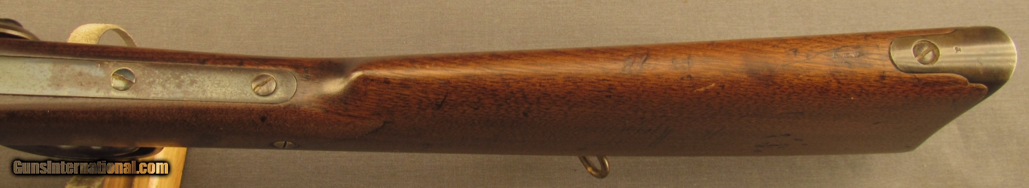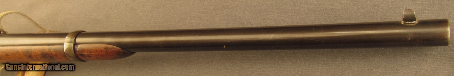 Description: Serial #8738, .54 Caliber, 21” barrel with a fine, bright bore that has a very small amount of mild freckling near the muzzle. This is a very nice carbine that retains 60-70% of the original blue turning plum-brown on the barrel with some silvering at the muzzle. The hammer, receiver, and buttplate have developed a smooth, mottled gray-black patina with traces of the original, still bright fire blue finish remaining on the protected areas and especially on the sides of the breech block. Original color case-hardening is faded but still very discenable on the frame. The walnut forend and buttstock have some small handling blemishes scattered about the newer oil finish, and the cartouches on the left side of the wrist are still quite clear and legible. The mechanical lock-up is solid and the action functions flawlessly. This is a very nice example of a Civil War Burnside in fine condition. Antique SOLD Antique: Yes Manufacturer: Burnside Model: Carbine Serial Number: 8738 Caliber Info: .54 Cal Gauge Info: .54 Cal |
