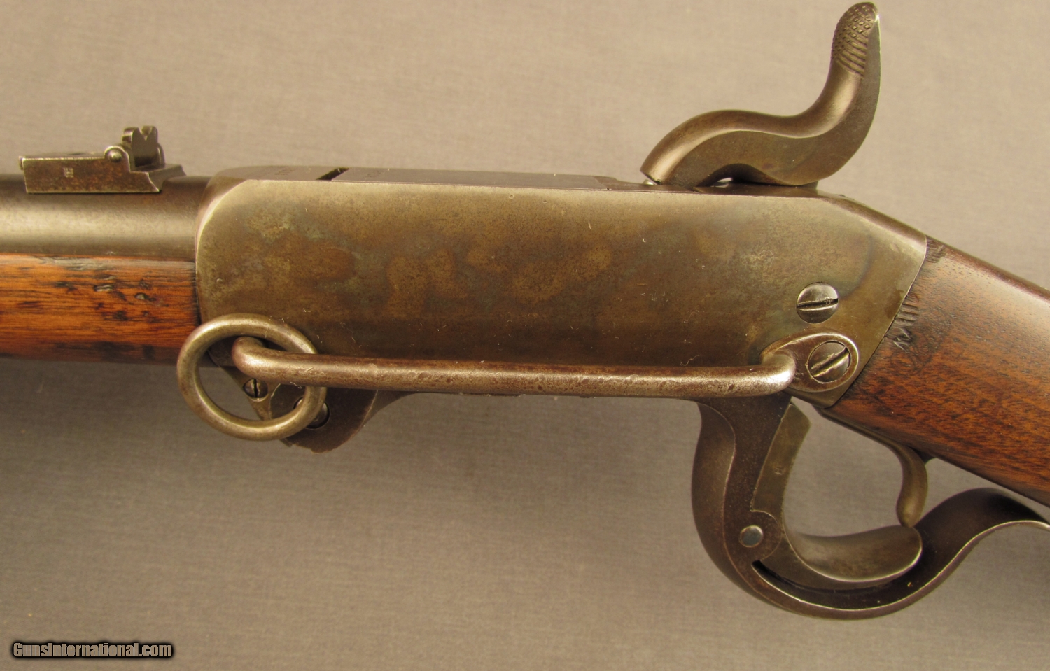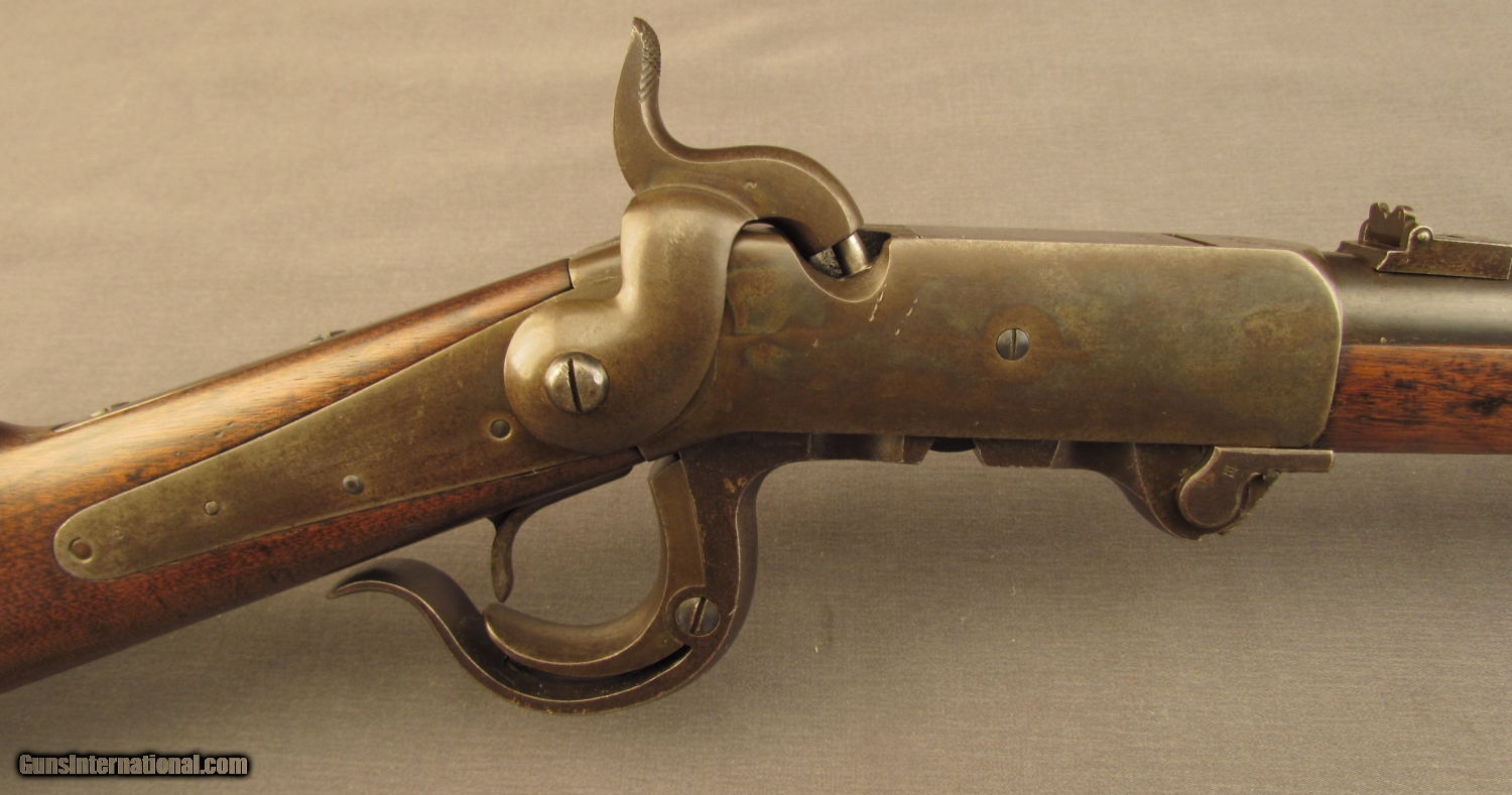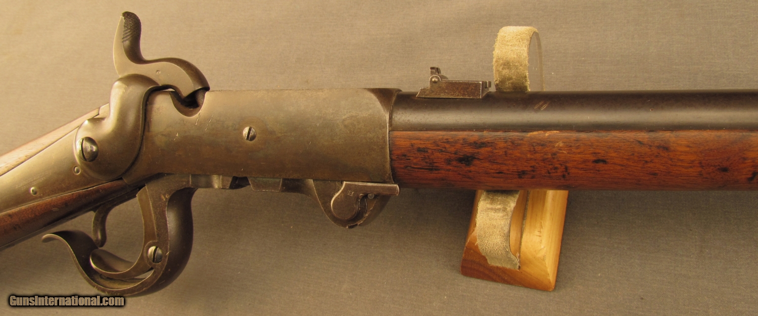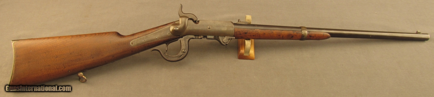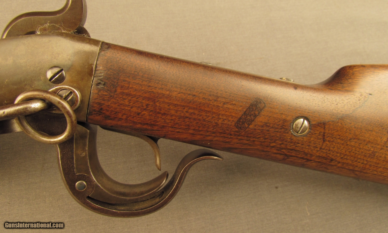 Description: Serial #8738, .54 Caliber, 21” barrel with a fine, bright bore that has a very small amount of mild freckling near the muzzle. This is a very nice carbine that retains 60-70% of the original blue turning plum-brown on the barrel with some silvering at the muzzle. The hammer, receiver, and buttplate have developed a smooth, mottled gray-black patina with traces of the original, still bright fire blue finish remaining on the protected areas and especially on the sides of the breech block. Original color case-hardening is faded but still very discenable on the frame. The walnut forend and buttstock have some small handling blemishes scattered about the newer oil finish, and the cartouches on the left side of the wrist are still quite clear and legible. The mechanical lock-up is solid and the action functions flawlessly. This is a very nice example of a Civil War Burnside in fine condition. Antique SOLD Antique: Yes Manufacturer: Burnside Model: Carbine Serial Number: 8738 Caliber Info: .54 Cal Gauge Info: .54 Cal |