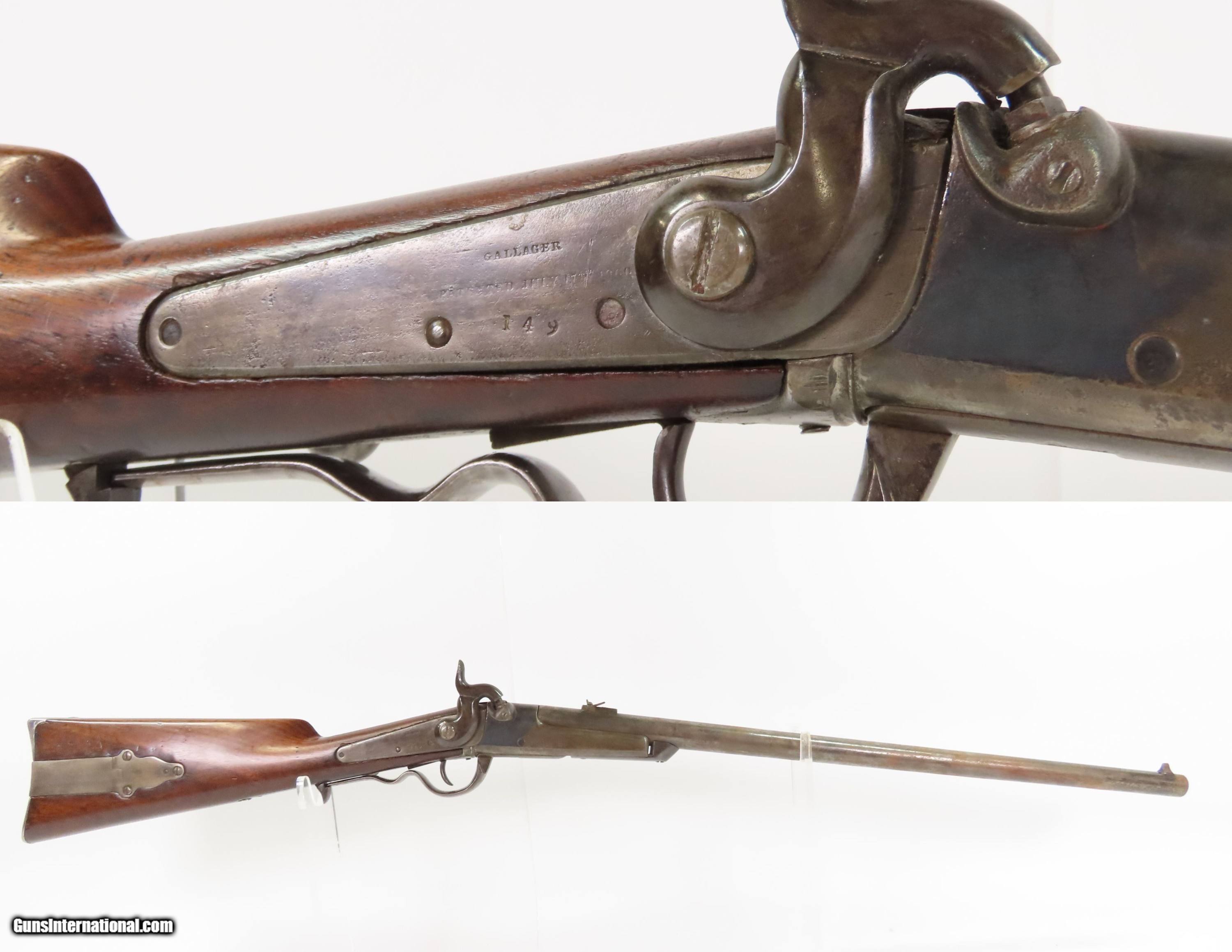 Description: CIVIL WAR Era Antique RICHARDSON & OVERMAN .52 GALLAGER Saddle Ring Carbine Civil War & WILD WEST Percussion Breach Loader Here we present an antique Civil War Era Richardson & Overman Gallager Patent Percussion Saddle Ring Carbine manufactured in the early 1860s in Philadelphia, Pennsylvania. This carbine was invented by South Carolina native Mahlon Gallager, who licensed the design to Richardson and Overman of Philadelphia for production. On August 31, 1861, the first Gallager was sold to the U.S. Army. 22,728 Gallager carbines were purchased during the Civil War and saw extensive use as a cavalry arm with the Union troops. Both percussion and metallic cartridge versions of the Gallager carbine were manufactured, but extraction problems with both cartridge types made this rifle somewhat unpopular with the troops that used it. This carbine fired an unprimed .50 caliber cartridge with a brass foil and paper-wrapped case. Ignition was provided by the percussion cap. A major fault of these carbines was the absence of a suitable extractor. The case had to be extracted with a knife or some other sharp tool. When the trigger guard lever is lowered, the barrel slides out from the frame and tips downward to receive the cartridge. This cavalry carbine was known to be used by the 2nd, 3rd, 4th and 6th Ohio, the 13th Tennessee, and the 3rd West Virginia cavalries. The overall condition is good. The bore is dim with serviceable rifling. Strong action, replacement nipple. Original gray patina throughout and a lightly weathered appearance. The original stock is solid with expected use, showing a slight gap between the receiver and wrist. The markings are worn but remain legible. Own the original! This is a legitimate antique and not a reproduction. Barrel is 22 inches. Caliber: .52 Percussion Overall condition as seen in photos. Very Fast. Very Safe. FREE SHIPPING WORLDWIDE. Delivered directly to your door by express mail! Guaranteed AUTHENTIC & Includes CERTIFICATE OF AUTHENTICITY. ancestryguns $2050 #256073 Antique: Yes Price: $2,050.00 Buy Now Pay with
