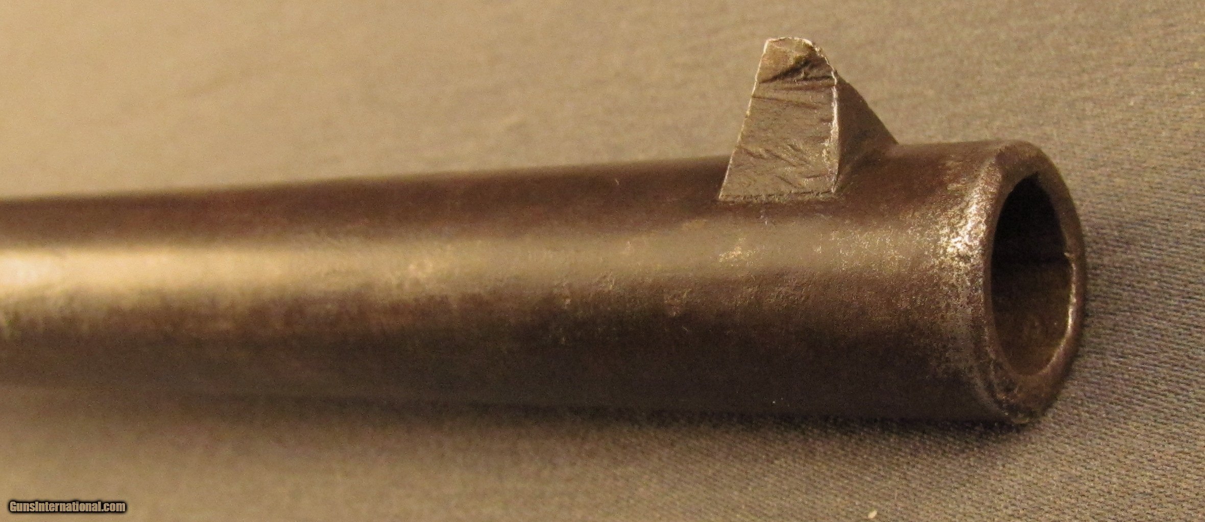 Description: Serial #1893, .52 Caliber, 20" octagon breech barrel with a good bore that has some dark spots of freckling within the grooves. This carbine has an overall dark plum-brown patina to the metal with mild pinprick pitting present throughout as well as a series of impact marks along the top of the frame and breechblock. Further impact marks carry over onto the breech-end of the barrel as well on and around the replacement fixed rear sight. The sling bar and ring are no longer present on the left side and the top tang has a somewhat jagged and irregular border along the front edge. The walnut stock has an added varnish finish over numerous small handling marks and blemishes but is not broken at the wrist and otherwise is in very good plus condition. The action locks up fairly tightly and is fully functional. This is an about good condition "Grapevine" carbine overall. Antique SOLD Antique: Yes Manufacturer: Gwyn & Campbell Model: Carbine Serial Number: 1893 Caliber Info: .52 Cal Gauge Info: .52 Cal |