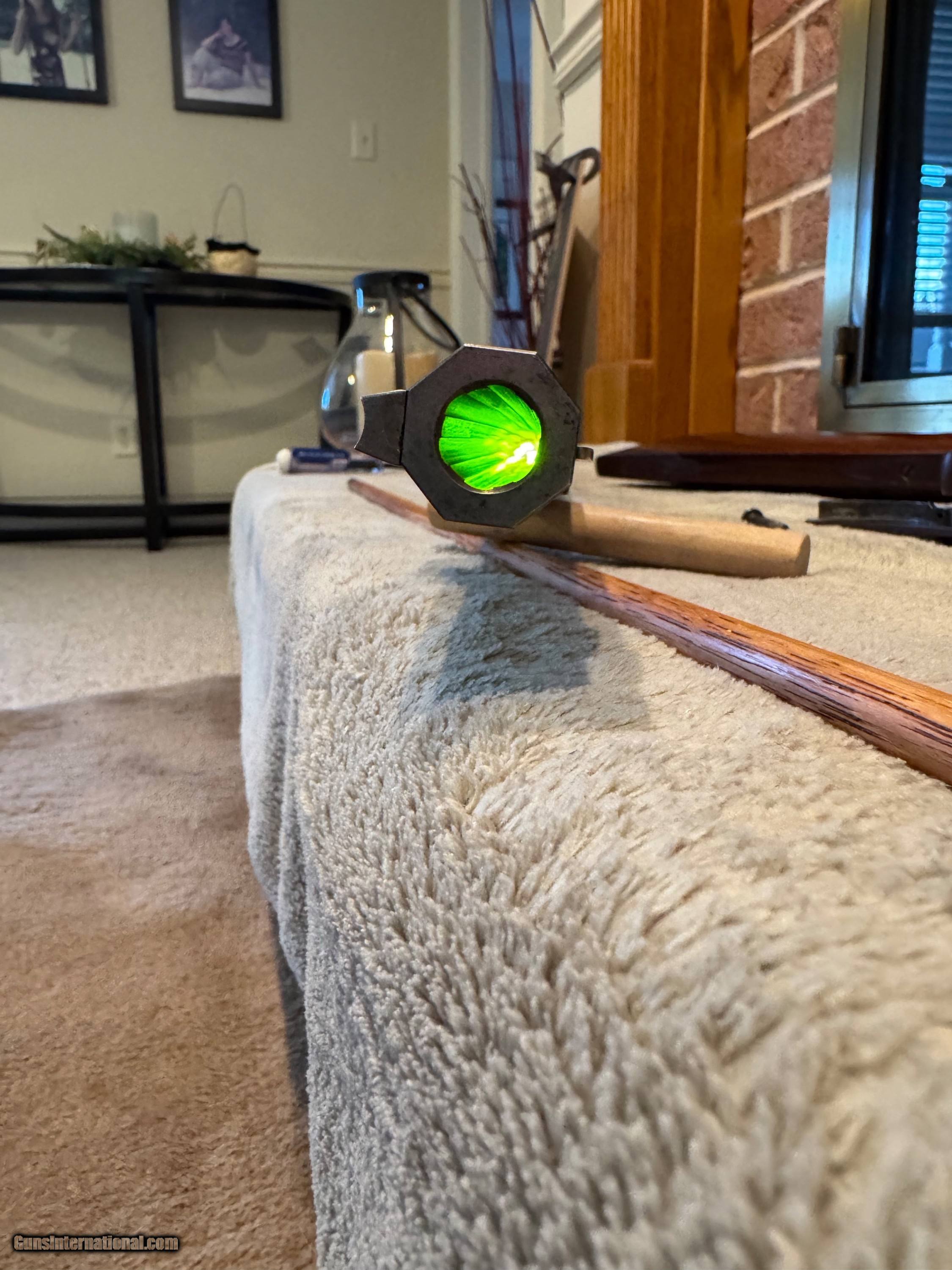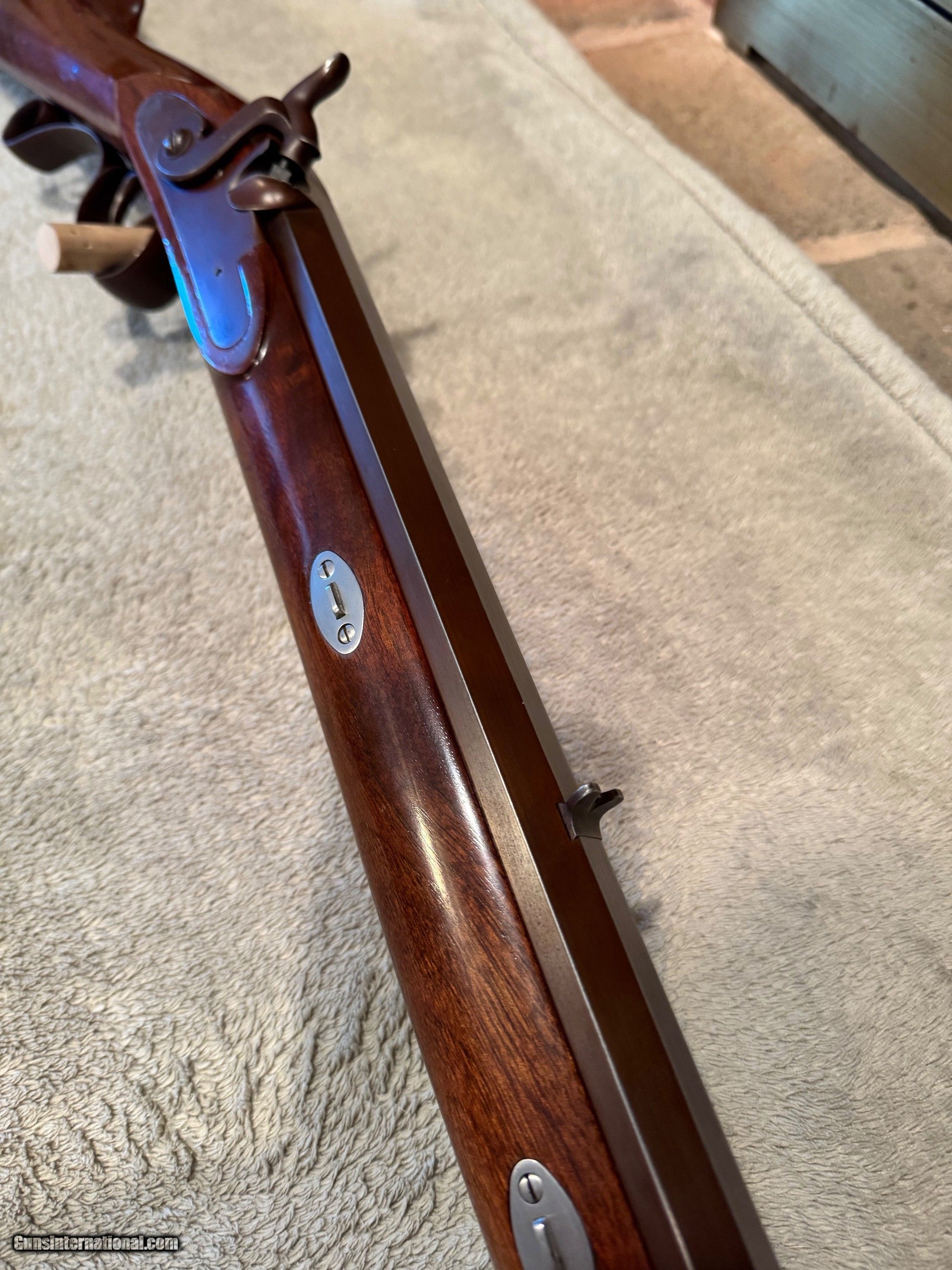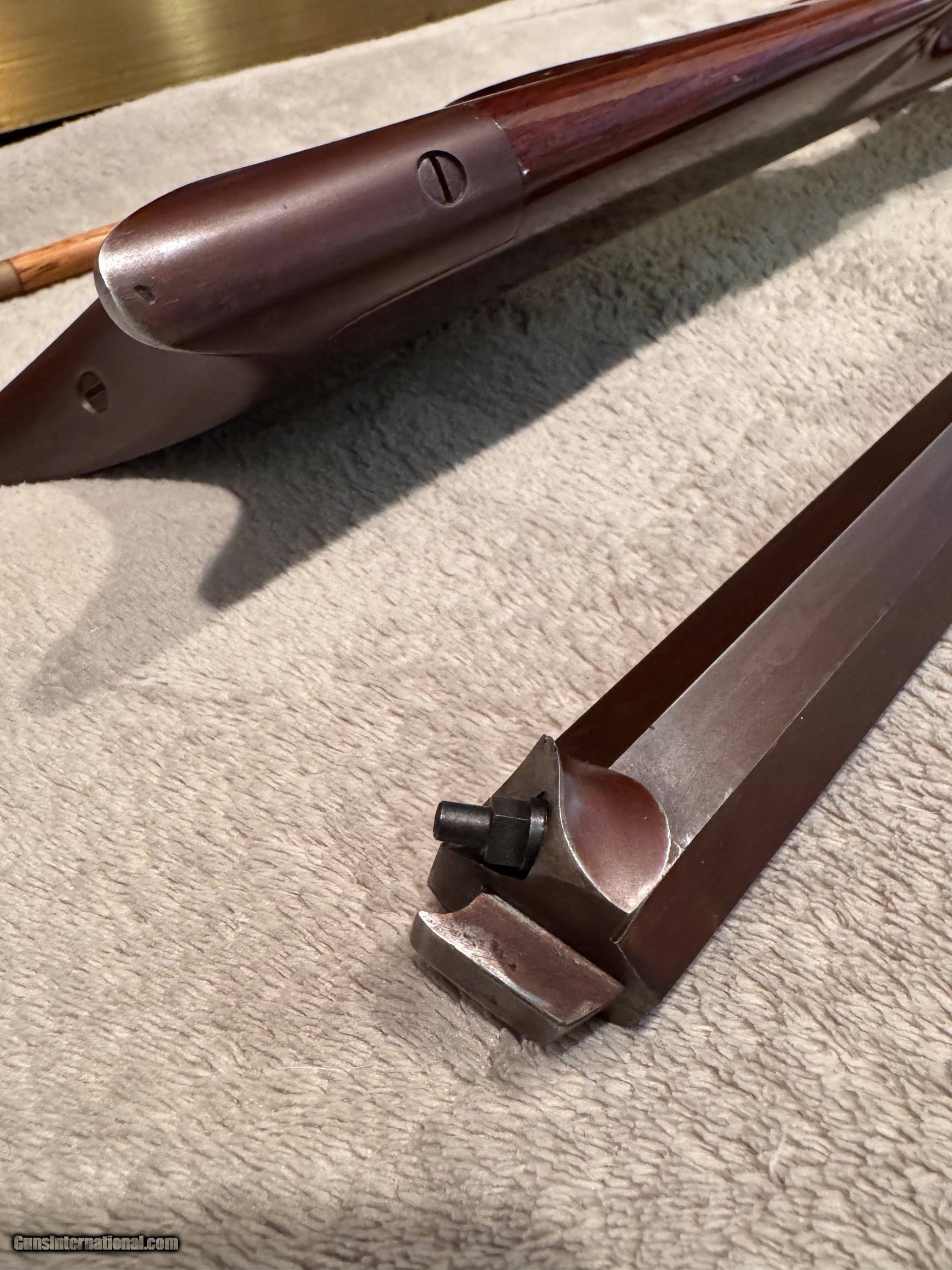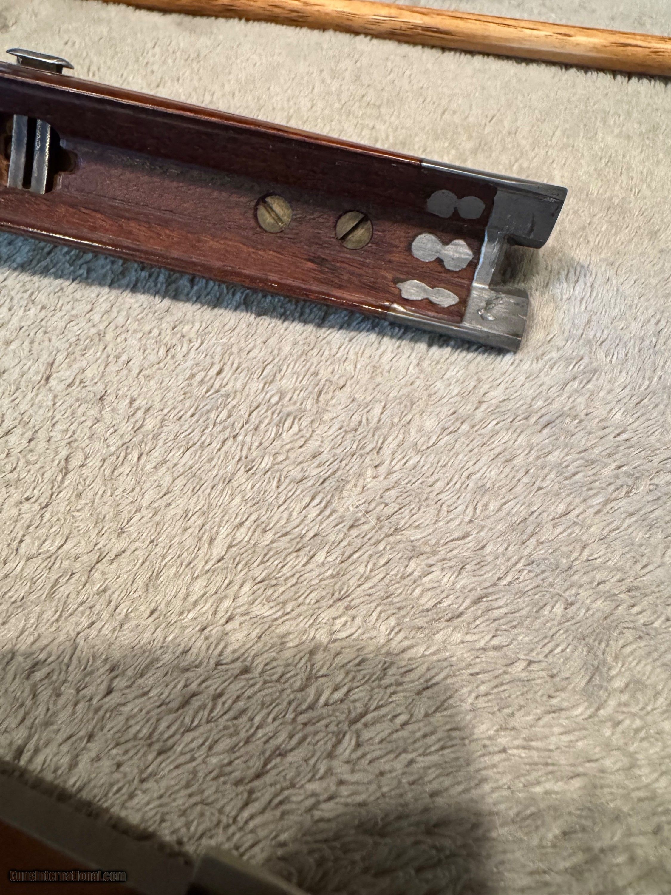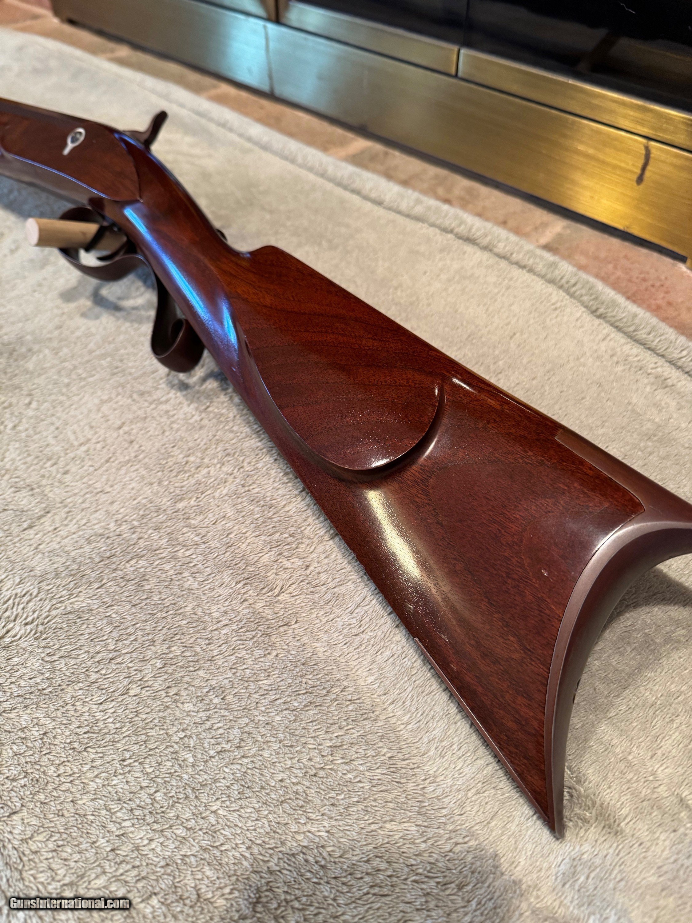 Description: This well made unknown maker rifle has a 32" tapered octagon barrel with a rear buckhorn sight and blade front sight, copper base silver blade. Rifle is in very good condition and ready to shoot. Length of pull: 13 5/8" Barrel length: 32" Barrel profile: tapered 1.120" at Breech, .970" at muzzle outer dimension. Trigger: Double set trigger Lock: SCHillinger name in side of lock (percussion) Stock: Walnut Caliber: .54 rifled, radius on bottom of rifling. Nose cap or Forearm tip: Poured Pewter. Money Order or Personal Checks excepted. Shipping $50.00 FFL is not required. Manufacturer: Unknown Model: Hawken Barrel Length: 32” Bore Info: .54 Condition: Good Metal Condition: Good Wood Condition: Good Bore Condition: Very good Barrel Type: Octagon Stock: Walnut Price: $1,100.00 Shipping: $50.00 Buy Now Contact Seller |