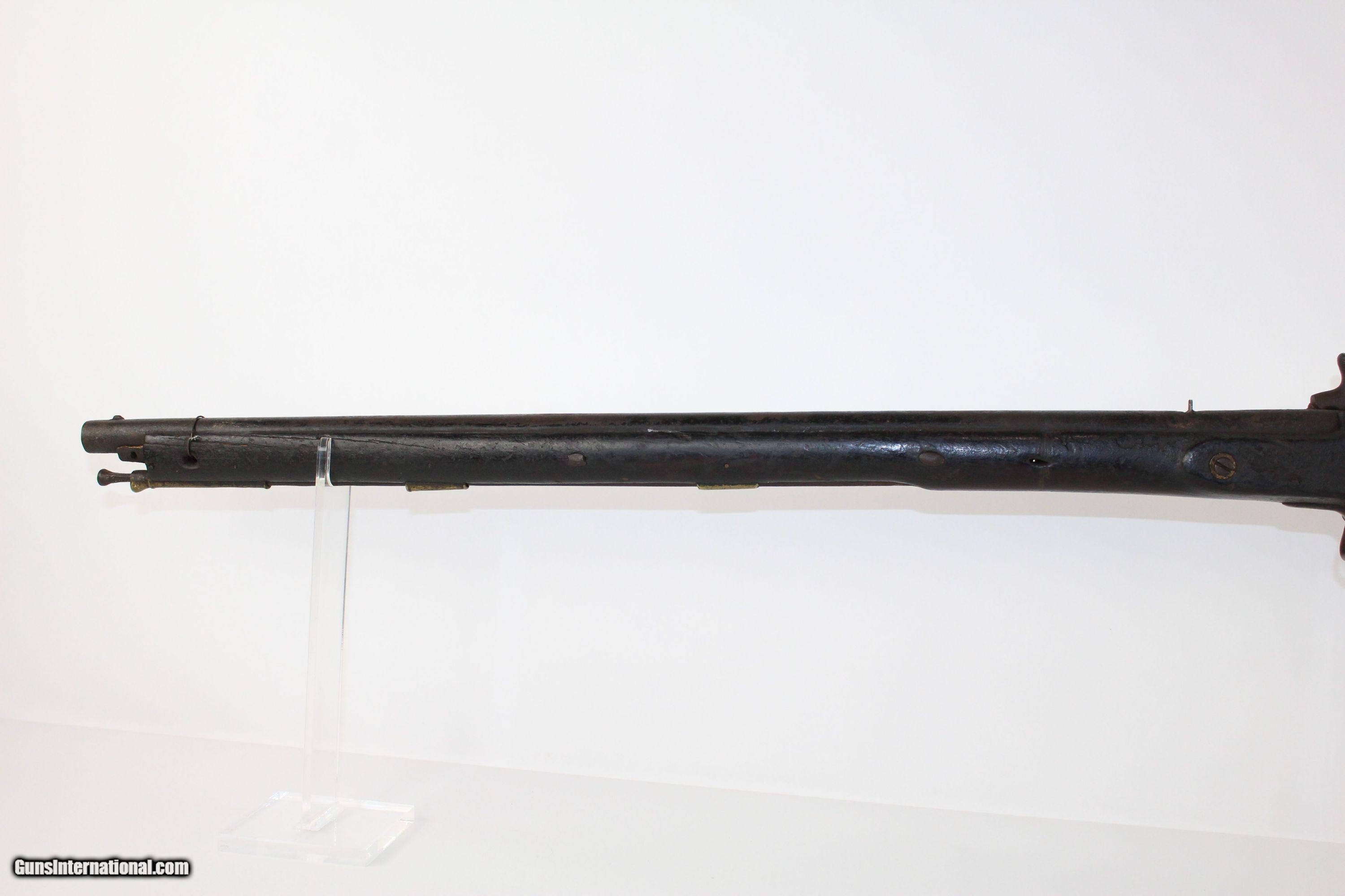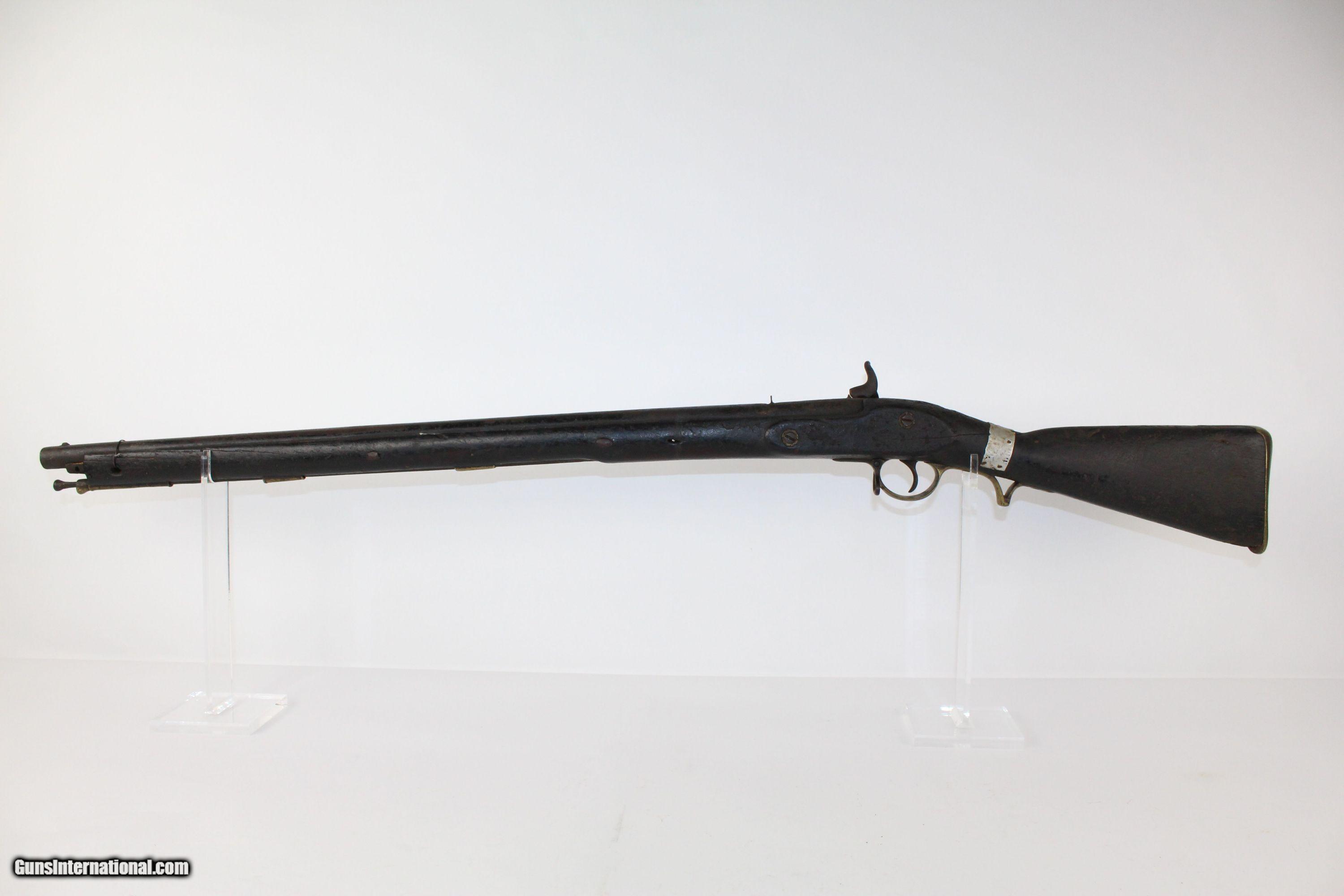 Description: EAST INDIA COMPANY Marked Pattern 1842 Musket With Rampant Lion Lock Here we present an antique East India Company Pattern 1842 Percussion Musket, made circa the 1840s. This musket was based on the British Brown Bess flintlock musket that was in previous use for decades. This musket would have served with the East India Company in an official capacity over the next several decades of the 19th Century. It is very likely that it was witness to the Indian Mutiny in 1857. This musket shows signs of use well after it was made obsolete, likely in Indian hands. The lock is marked with the Rampant Lion motif of the EIC. The overall condition is fair. The metal surfaces bear a very dark patina. The stock is very dark with age and possibly grease from storage. The toe of the stock has an old chip and the wrist features an old, somewhat primitive repair. The fore end cap is absent, and wire keeps the barrel tight with the end of the stock. The smooth bore is dark and untouched. The action is strong. Own the original! This is a legitimate antique and not a reproduction. Barrel is 32 inches. Caliber: .75 Percussion Overall condition as seen in photos. Very Fast. Very Safe. FREE SHIPPING WORLDWIDE. Delivered directly to your door by express mail! Guaranteed AUTHENTIC & Includes CERTIFICATE OF AUTHENTICITY. ancestryguns $850 #6053 SOLD Antique: Yes |