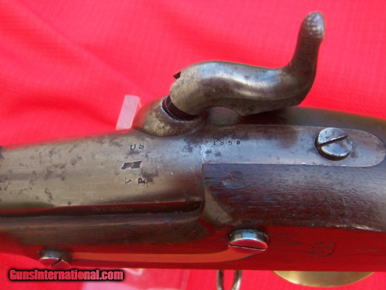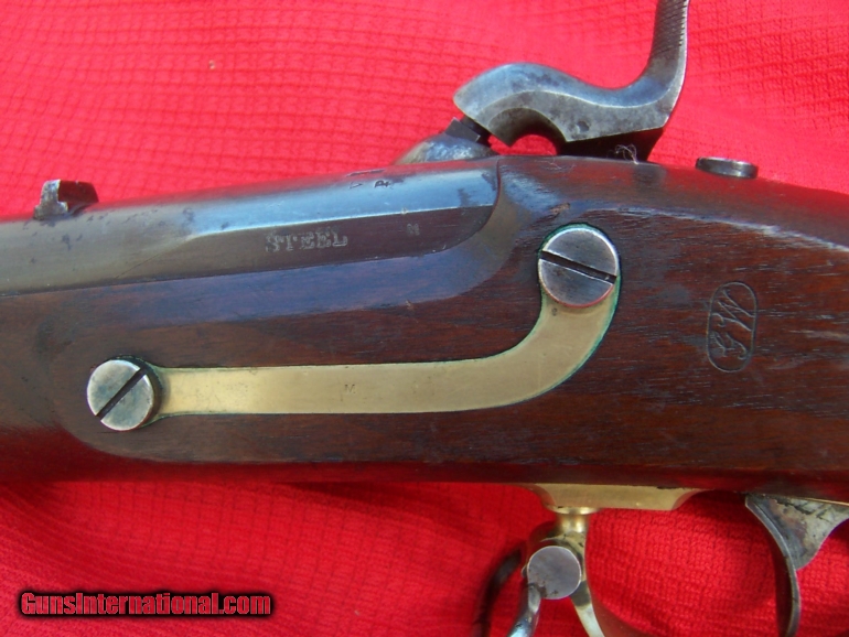 Description: Excellent Mississippi Rifle by Whitney with over 60% case colors and 70-80% original brown. Stock is excellent with sharp edges and mint inspection markings. The two cartouches are perfect. The bore is .54 caliber and this Miss. will be hard to improve upon. The pictures don't tell the story of the original red-brown finish on the barrel. There are some blemishes to the finish but the gun is just a great mississippi. More pictures are available. SOLD Antique: Yes |