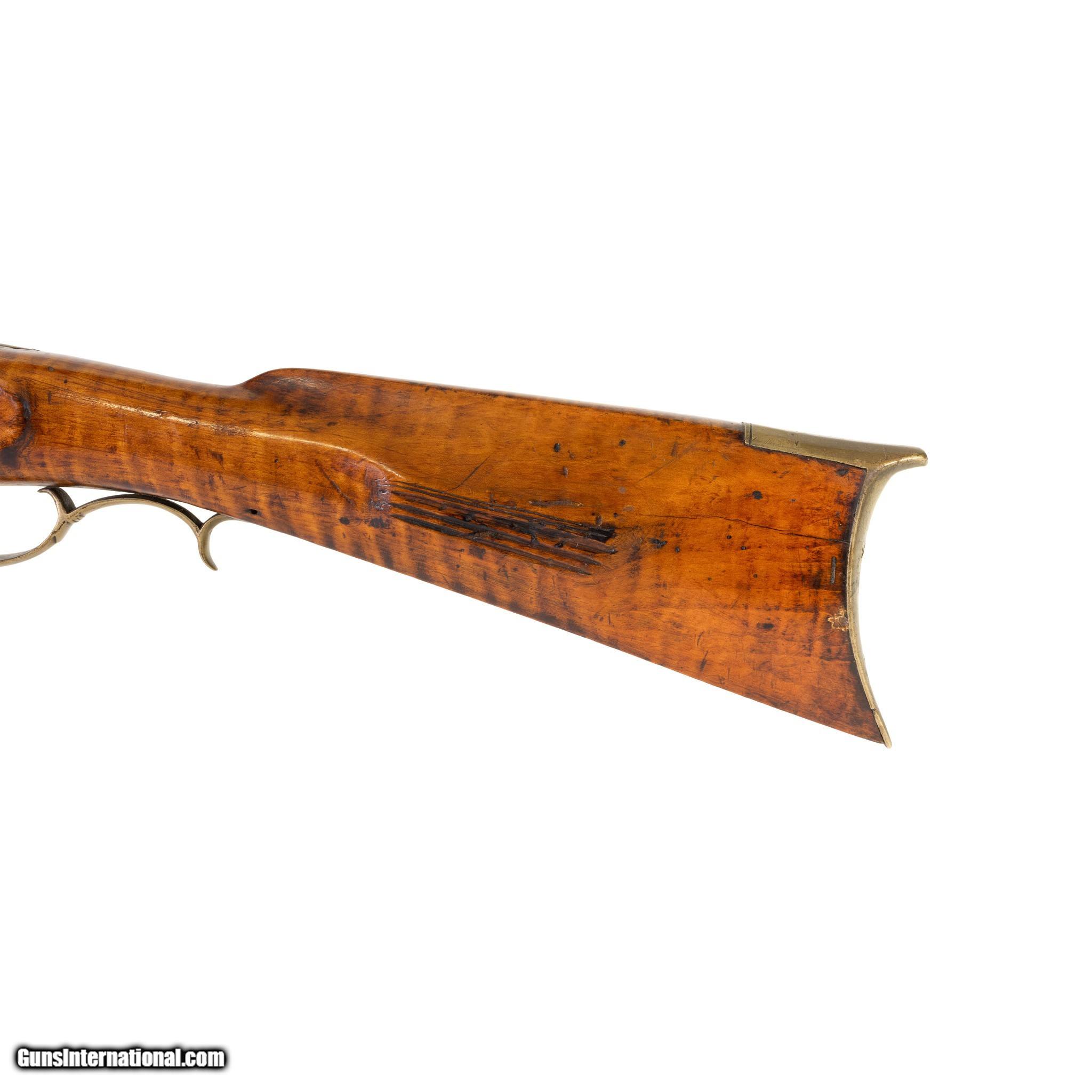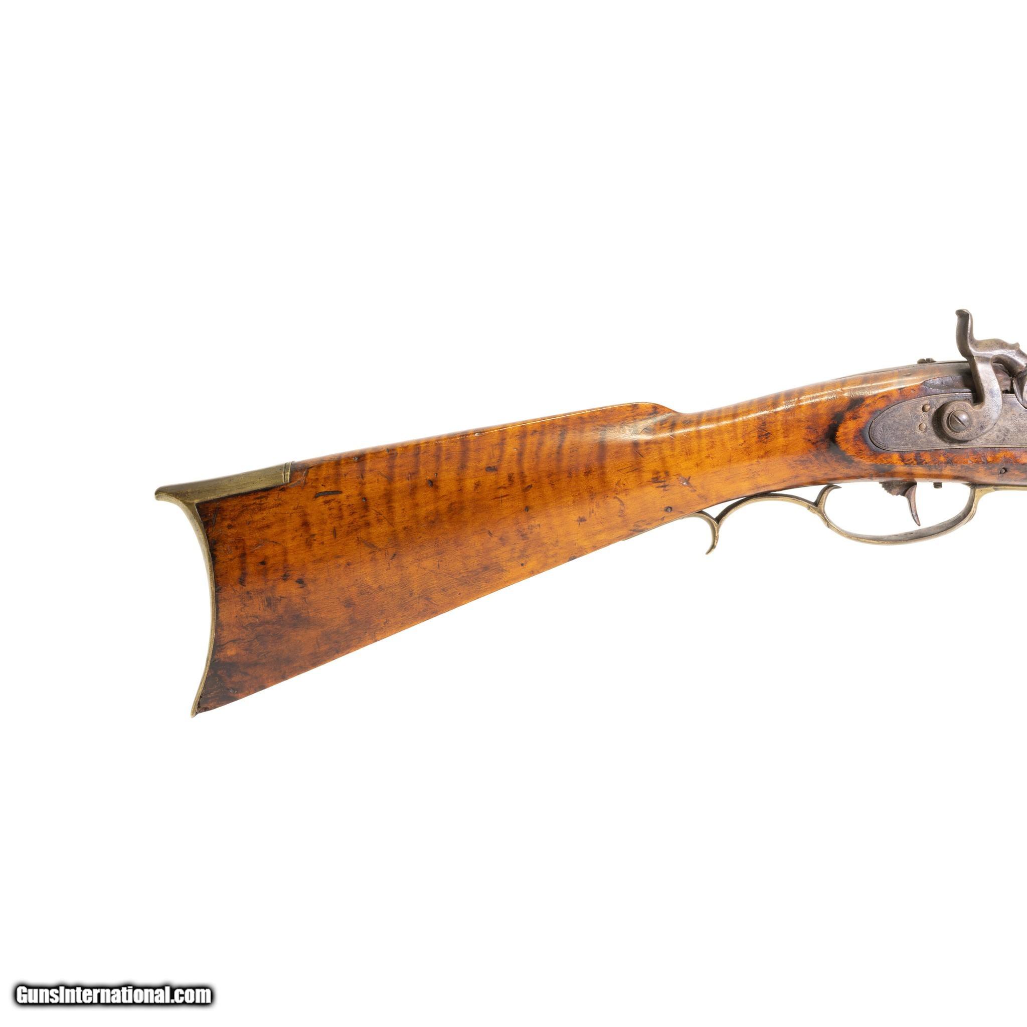Description: Flintlock to percussion conversion rifle with full-stock and 40 3/4" 70 cal. heavy octagon barrel. Lock is marked "Josh C Randall Warranted." The butt of the stock is a roman nose style with carved cheek piece and brass crescent buttplate. SOLD Antique: Yes |