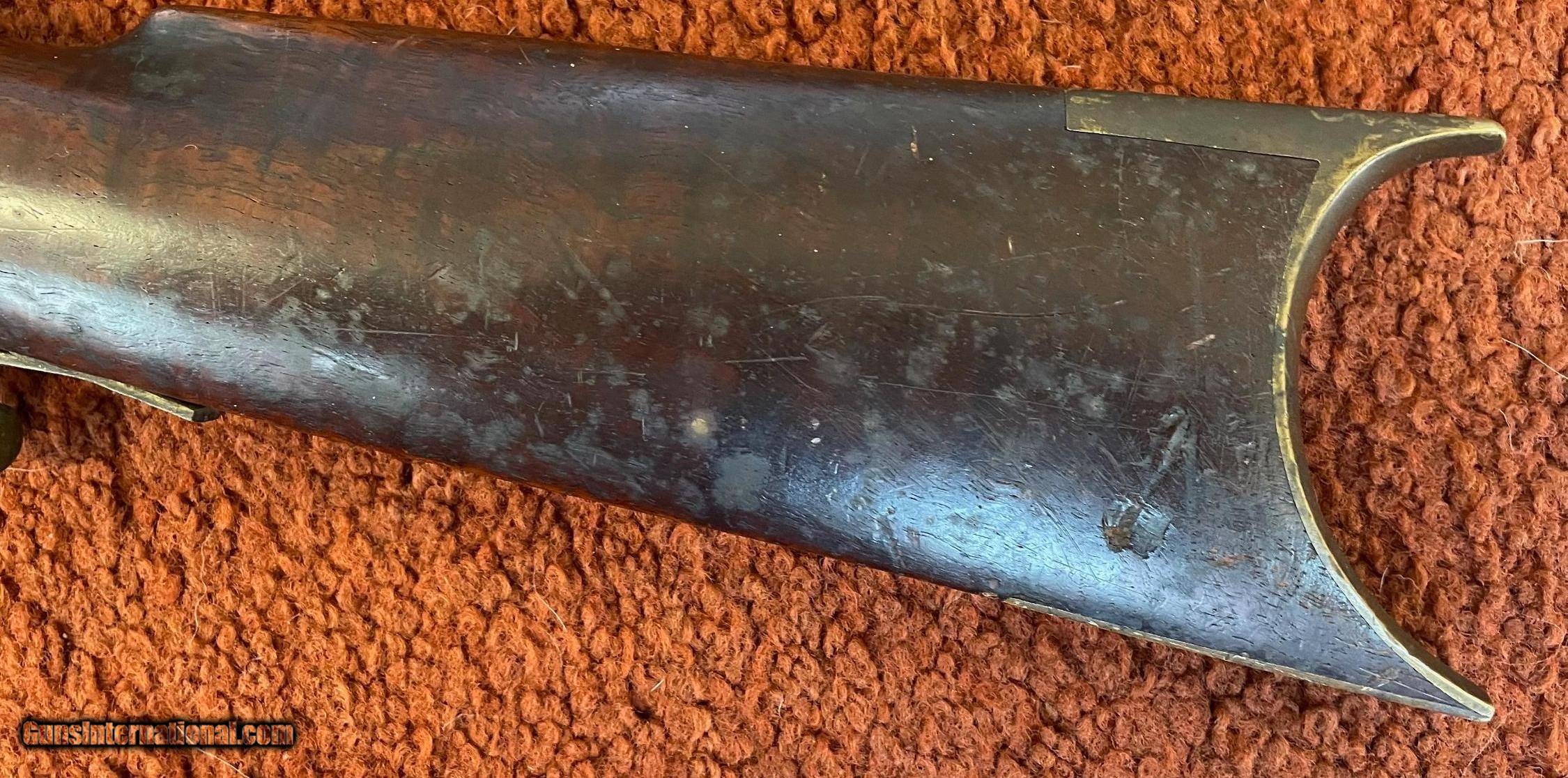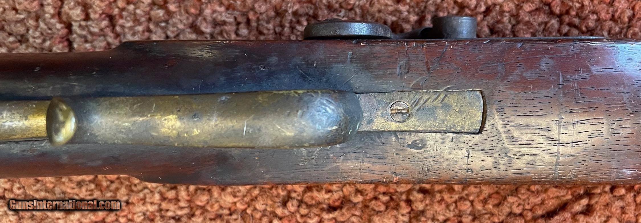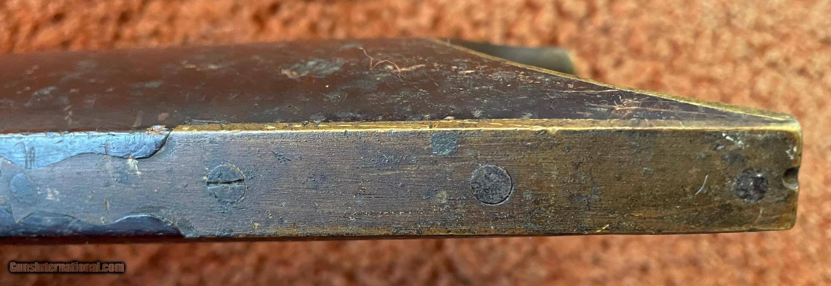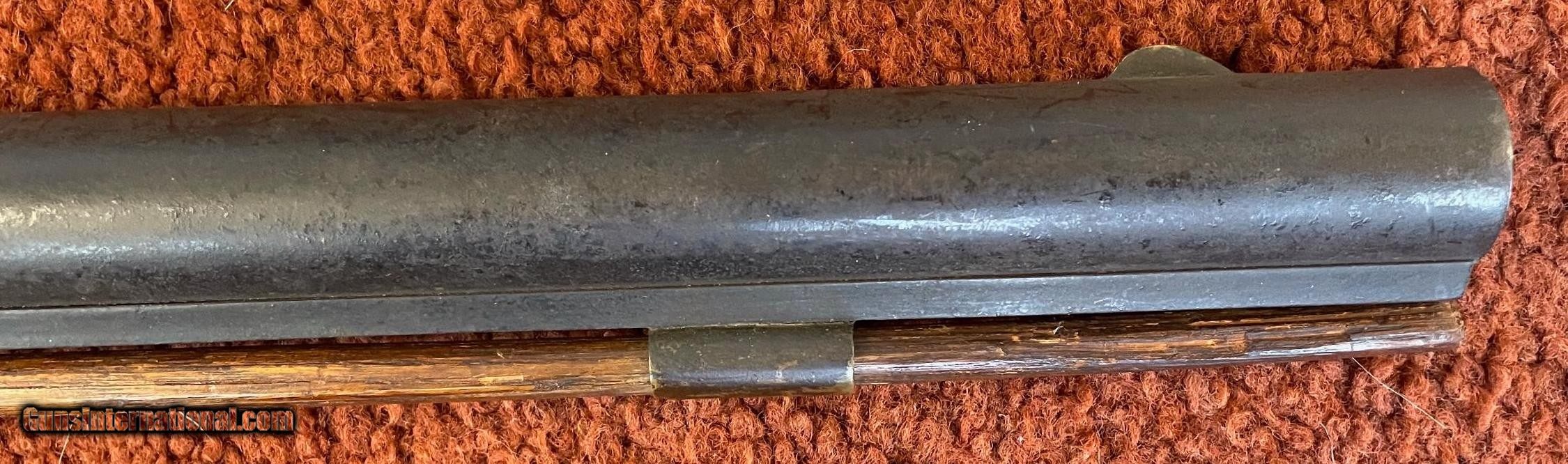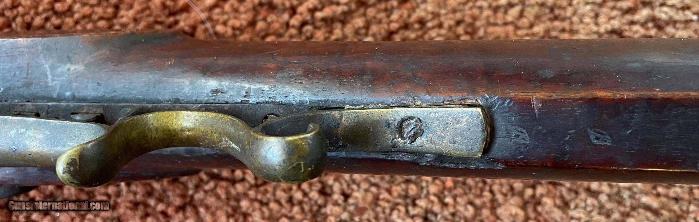 Description: This gun is from the late jim Dresslar collection. . Jim was the owner of the American Frontier Museum in Bargersville, Indiana. The bore measures .56" and is dark. The barrel measures 1.20" across the muzzle. The hammer does not hold on full cock. SOLD Antique: Yes Barrel Length: 27 Weight: 11 lbs. |