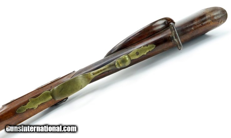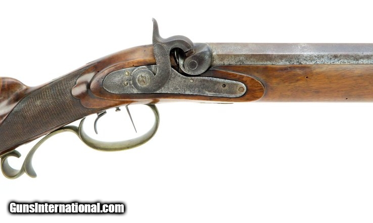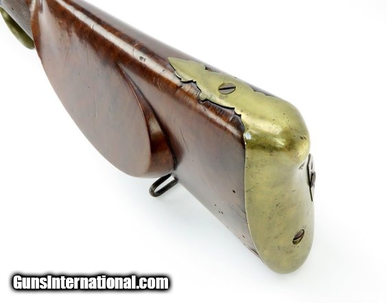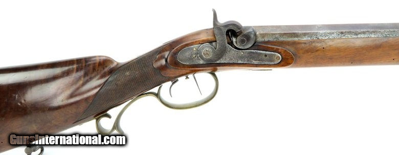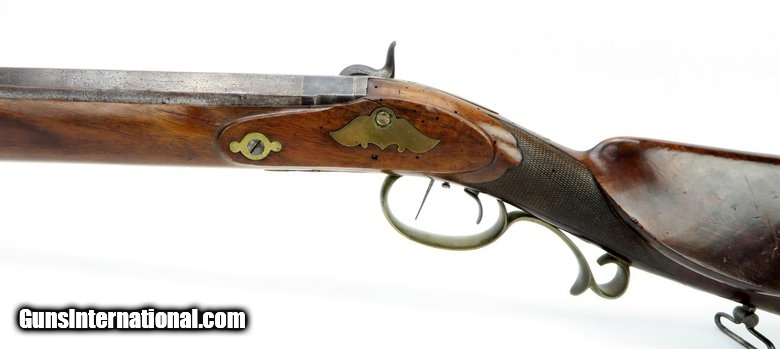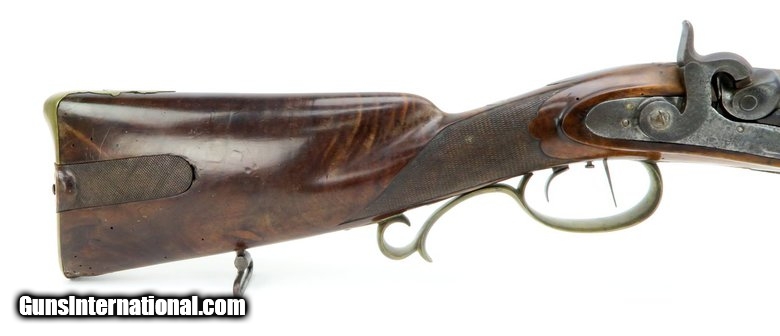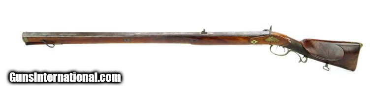 Description: " Heavy Barrel Percussion Target Rifle. Very Germanic in construction. No markings. Barrel has a brown patina with light pitting. This is a swamped barrel. Wood has cheek piece and checkered stock at wrist. There is also a patch box. Good looking gun reasonably priced. SOLD |