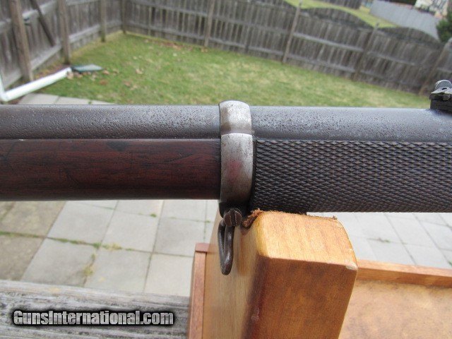 Description: DESCRIPTION: Enfield Model 1860 Percussion rifle, approximately 58 caliber, with 20" round barrel, correct blade front sight and correct musket-style ladder rear sight, nicely checkered walnut stock, brass butt plate, fore end cap and trigger guard, blued barrel, steel ram rod, and fully proofed on the barrel, lock plate and rear sight. Left side of butt stock has a 1 1/2" silver plate engraved with the logo of the Honourable Artillery Company and the name "Lewis T Crook" inscribed as well. Lewis T Crook entered the Honourable Artillery Company as a Captain in the late 1870s and was promoted to Major at some point, staying with the unit into the late 1880s. Further research has found that Major Crook was a Freemason and helped charter the lodge in Seaford, England. Available provenance will be included with the rifle. CONDITION: Barrel has turned a dark patina and has surface pinprick pitting throughout but all markings and proof marks remain clear. Brass pieces are uncleaned and have turned a nice mustard color. Bore is good with decent rifling and the expected black powder fouling. Action is strong. Nipple shows rust. Stocks in very nice condition. Engraving on plate is worn but still legible, including the "Arma Pacis Fulcra" Latin motto ("Armed Strength for Peace"). Grades NRA Antique Very Good and a neat old percussion rifle with provenance and military history to add to your collection! TERMS: No international sales. Antique so it can ship directly to you assuming your local laws allow it. Payment by bank check, money order, personal check, or all major credit cards with 3% convenience fee. 3 day non-firing inspection. Buyer pays return shipping. Offers considered. Thanks for looking. Interested in buying single pieces and collections of old firearms, especially Winchester, Colt, S&W, Marlin, Savage and Remington. 315.251.4799 with questions or concerns. SOLD Antique: Yes Manufacturer: Enfield Model: 1860 Serial Number: NSN Barrel Length: 20" round Caliber Info: 58 Percussion Condition: Very good Metal Condition: Very Good Wood Condition: Very good Bore Condition: Very good Triggers: Standard/plain |