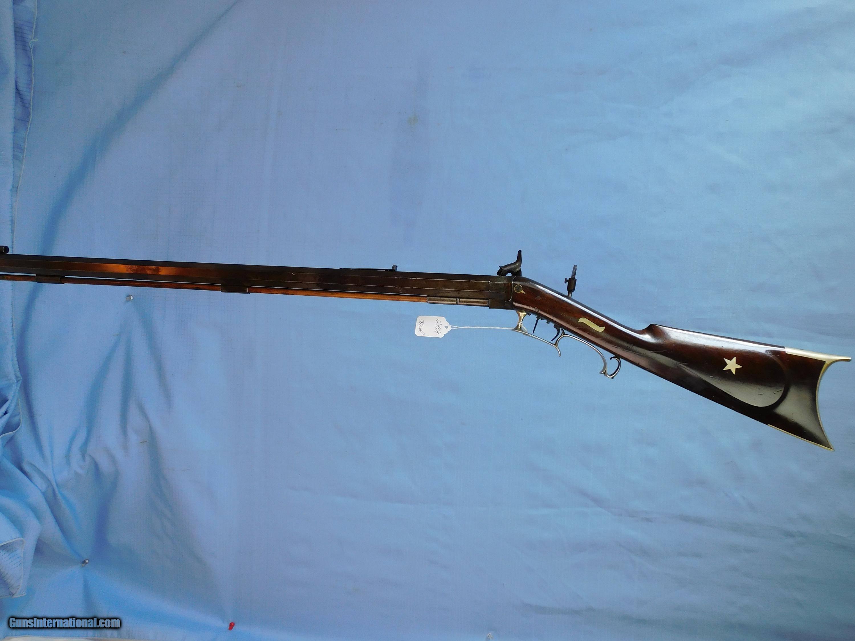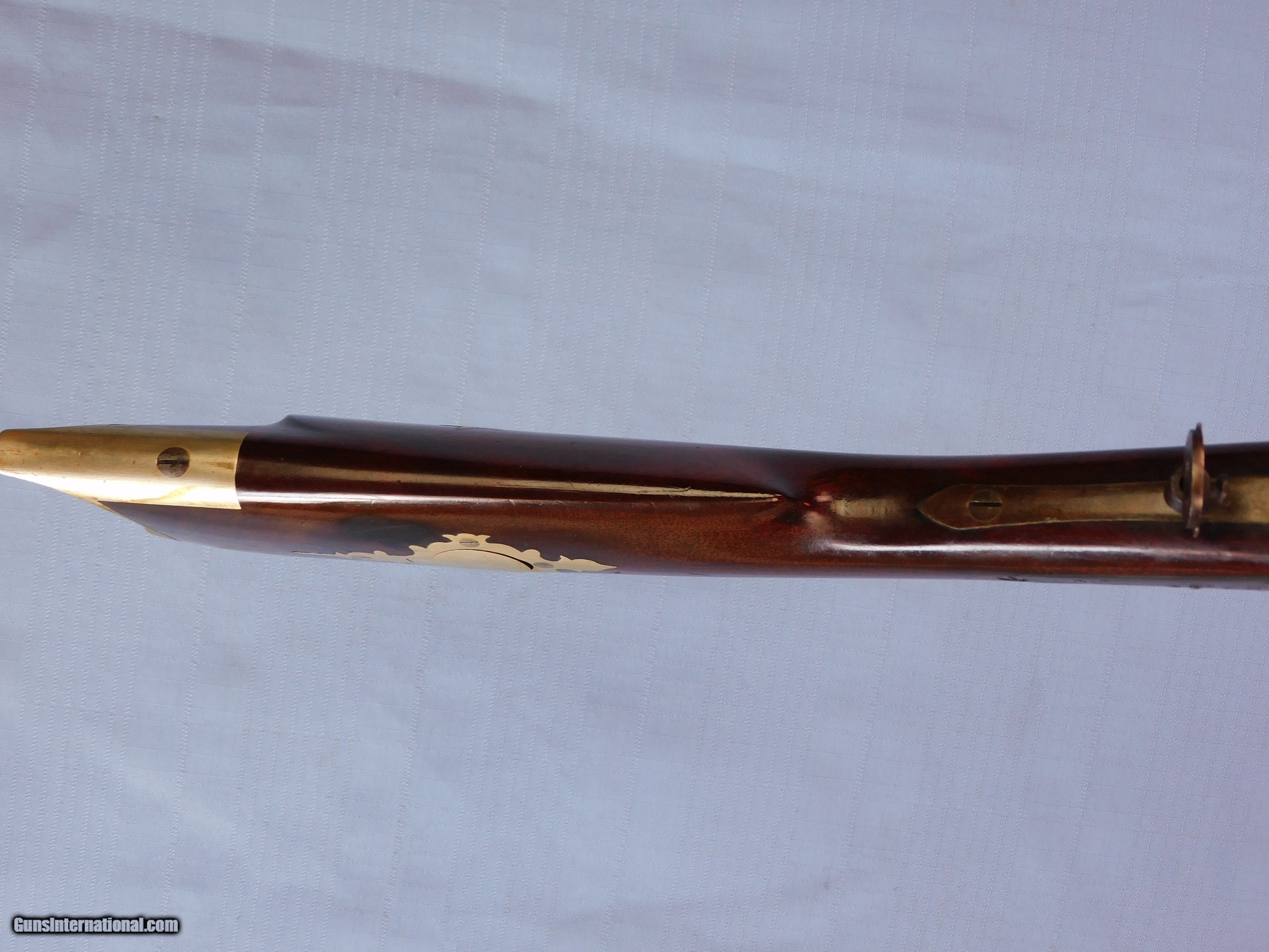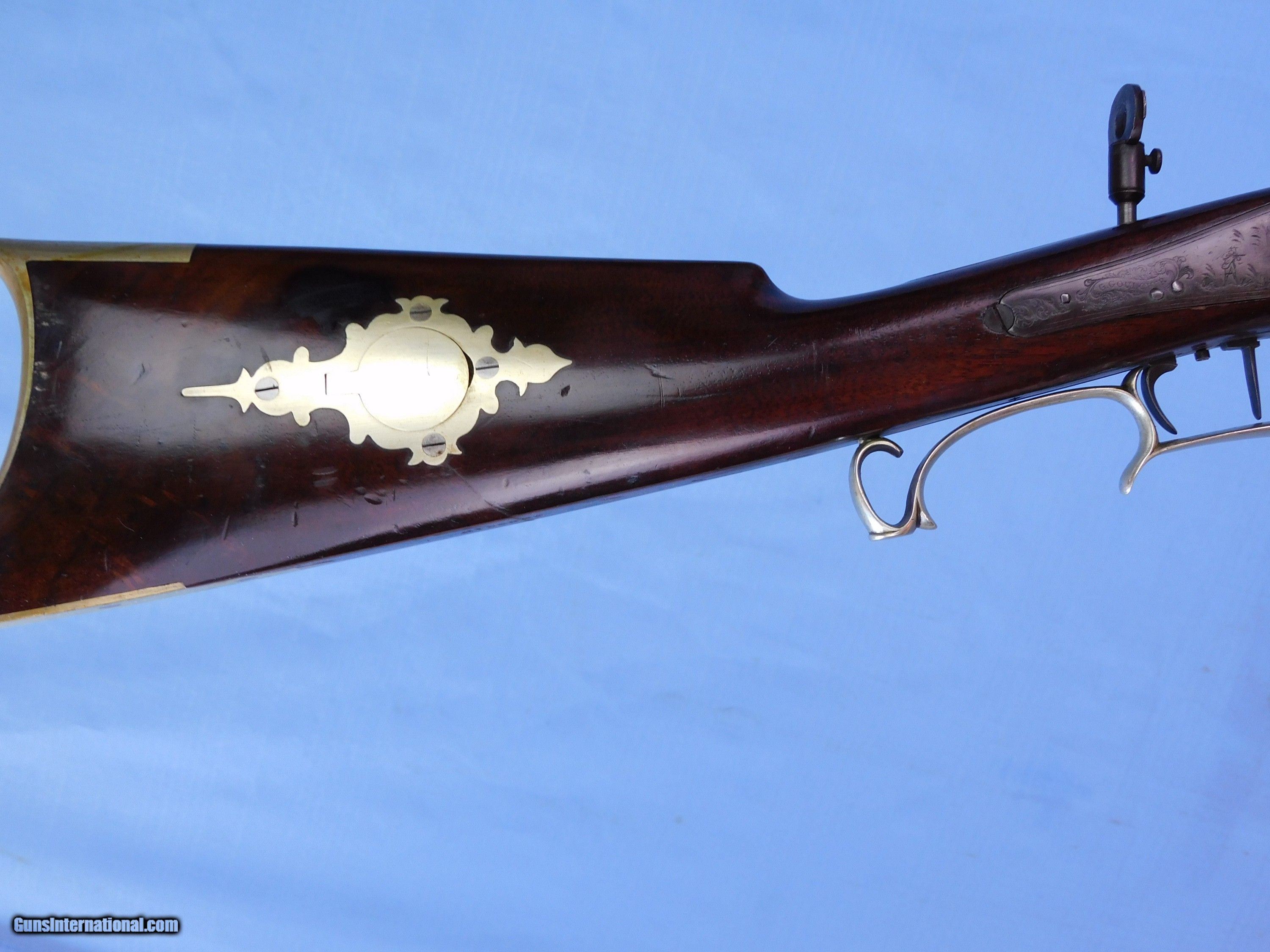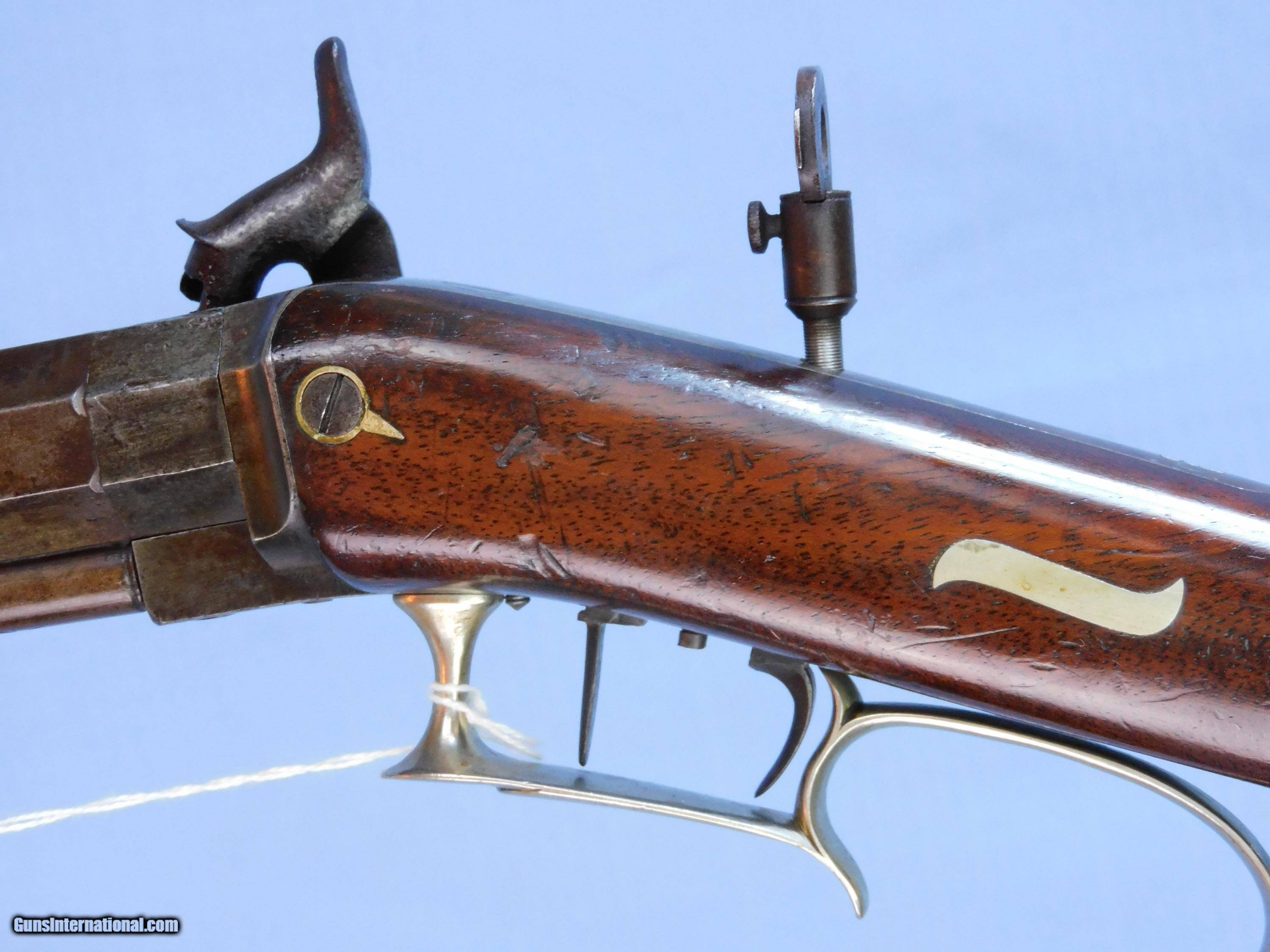Description: #1245A J.B. HOGAN PERCUSSION TARGET RIFLE, 38 cal., 28” oct. bbl., G. Goulcher engraved lock, VG wood stock with silver patchbox on right side, silver trigger guard, buttplate & 2 silver inlays in stock, open rear sight & hooded front, lollipop adjustable tang sight, Hickory ramrod, DST, exc. bore, Hogan worked in Adams Mass. from 1840-1890, false muzzle missing. $1200 SOLD Antique: Yes |
