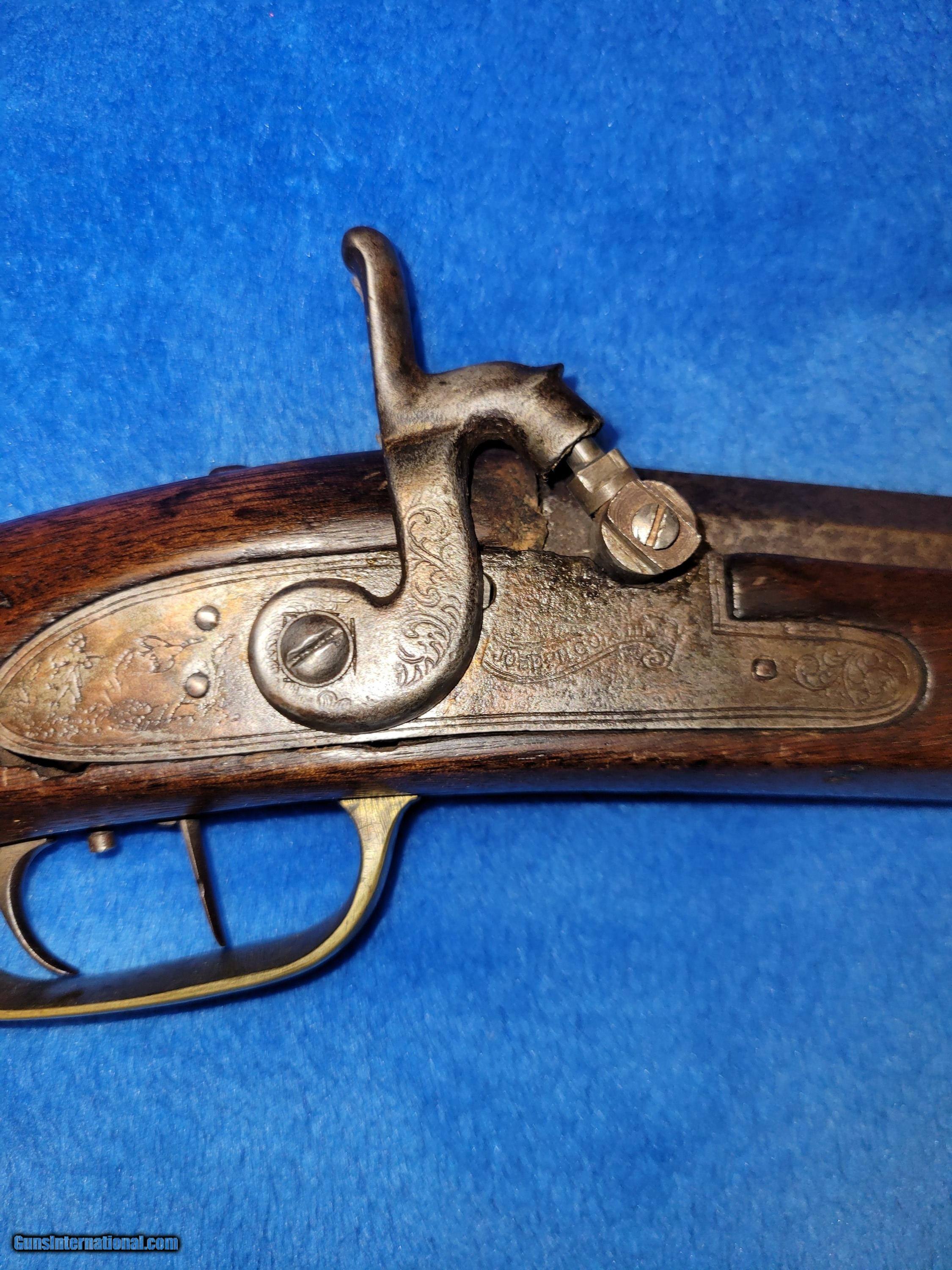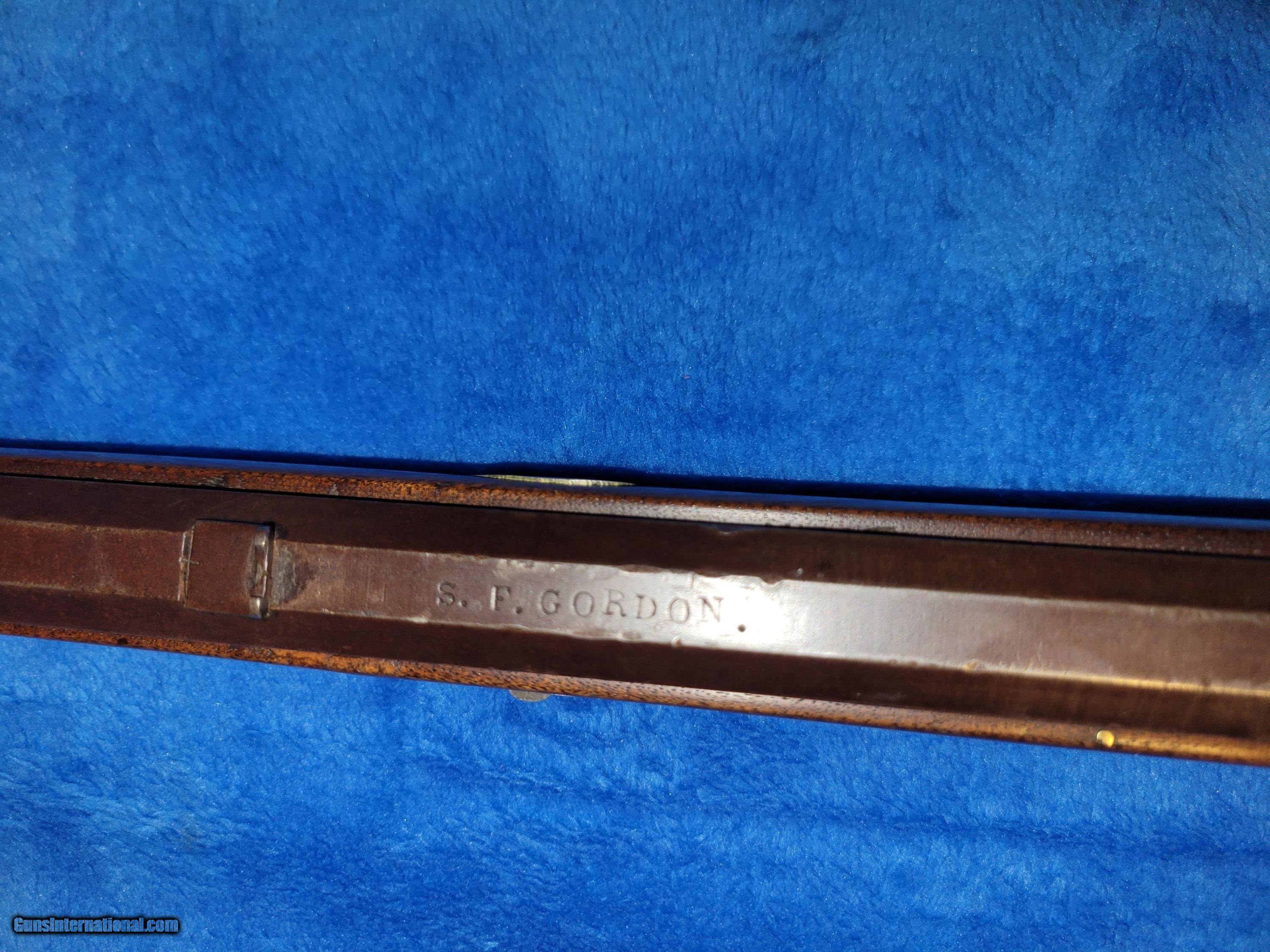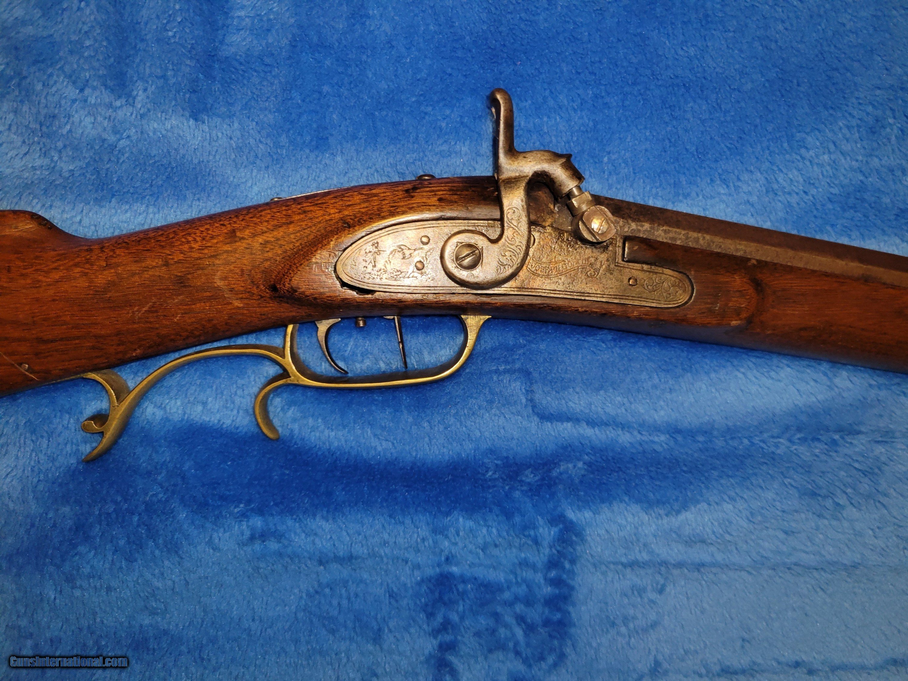 Description: This is a well made kentucky style half-stock long rifle circa. mid 1800s .34 heavy barrled. made by the well known J Bown & sons. widely attributed for promoting the Pennsylvania style kentucky rifle the barrel is marked with Bown's name as well as S.F. Gorden (probably the barrel maker) or maybe the owner. it has a well known Joseph Golscher lock with light engraveing and set of single action double set triggers. It has a very good bore and is in excellent overall condition considering it's age. The stock is in very nice condition wood is very sound and strong with an attractive carved cheek piece with brass furniture. Ornate triggerguard, Patch box and deeply curved butt plate .mechanically it is in very good shape.the gun presents nicely and would look great over a fire place or as a wall decorator in a den or gun room.the barrel is 36" and over all it is 53" long. Shipping is listed as $ 50.00 but will be the actual cost of shipping ( to be determined depending on the destination). Call if you have any questions at all. This would make a fine addition to any collection of early american firearms. Offers or trades considered. price reduced due to illness $ 975.00 to $ 625.00 + actual shipping cost SOLD Curio/Relic: Yes Antique: Yes |